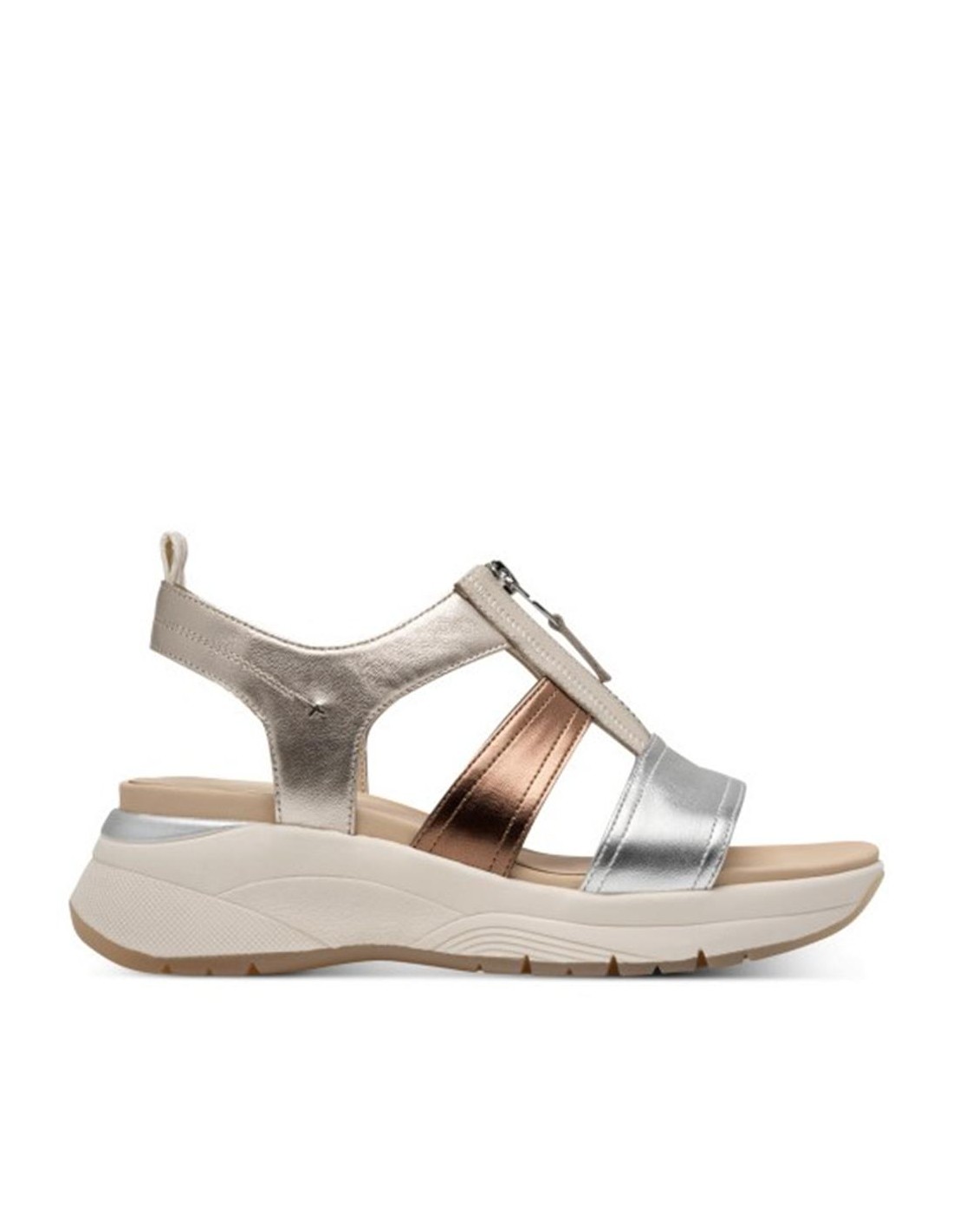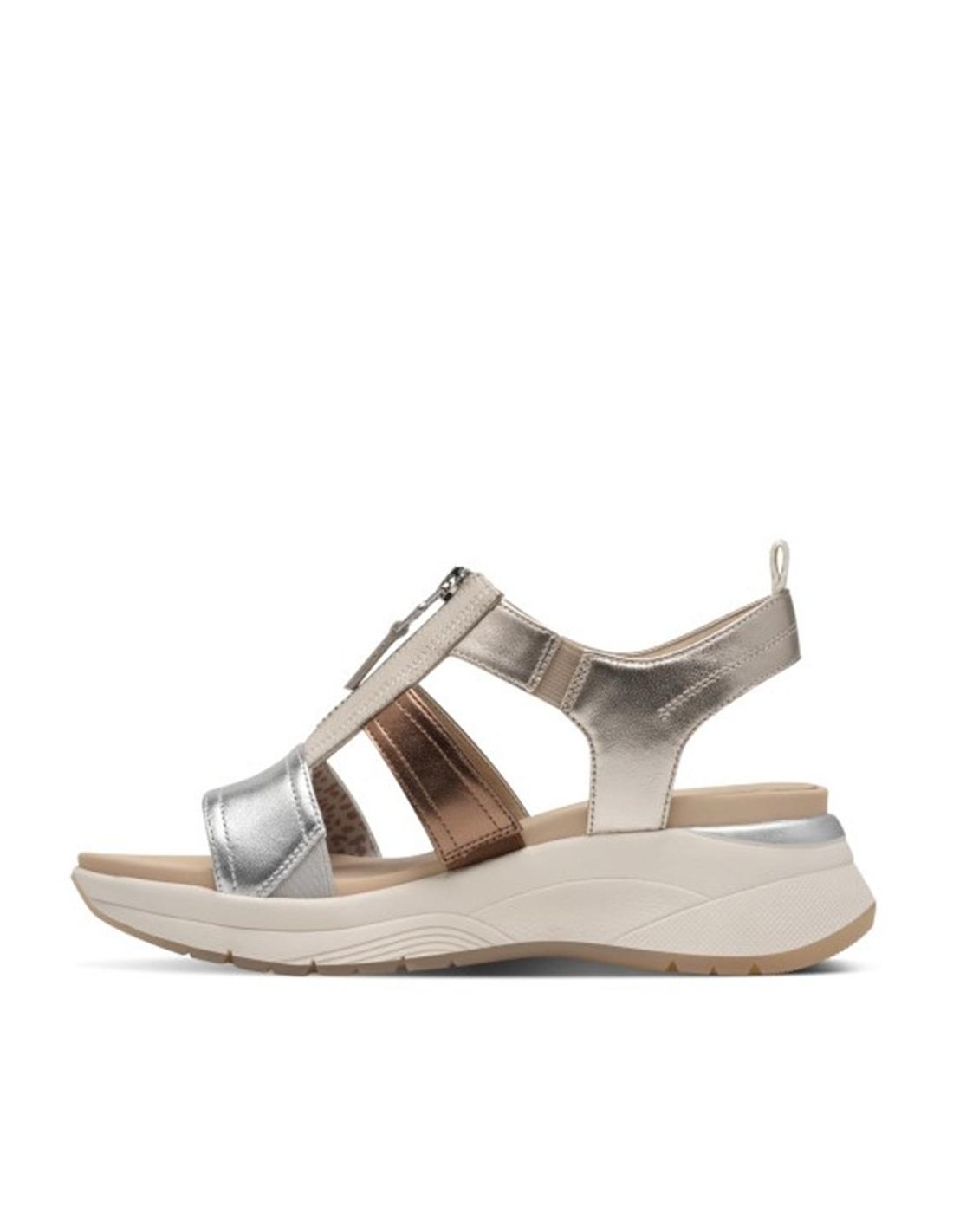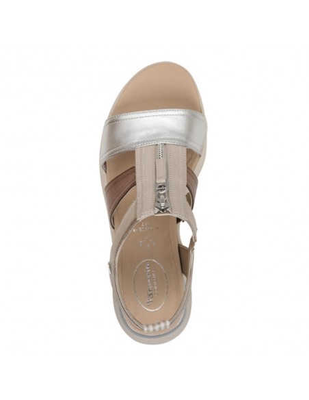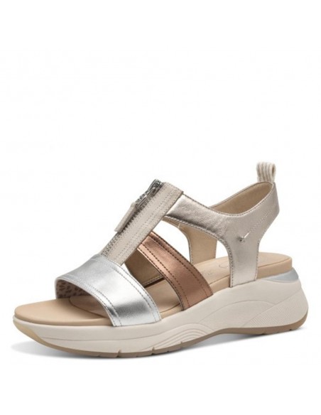 Descripción: Sandalia mujer 88722 de TAMARIS CONFORT en suave piel de tonos metalizados. Plantilla anatómica acolchada. Ajuste con cremallera. Ligera y cómoda cuña flexible y antideslizante.
