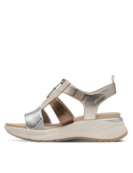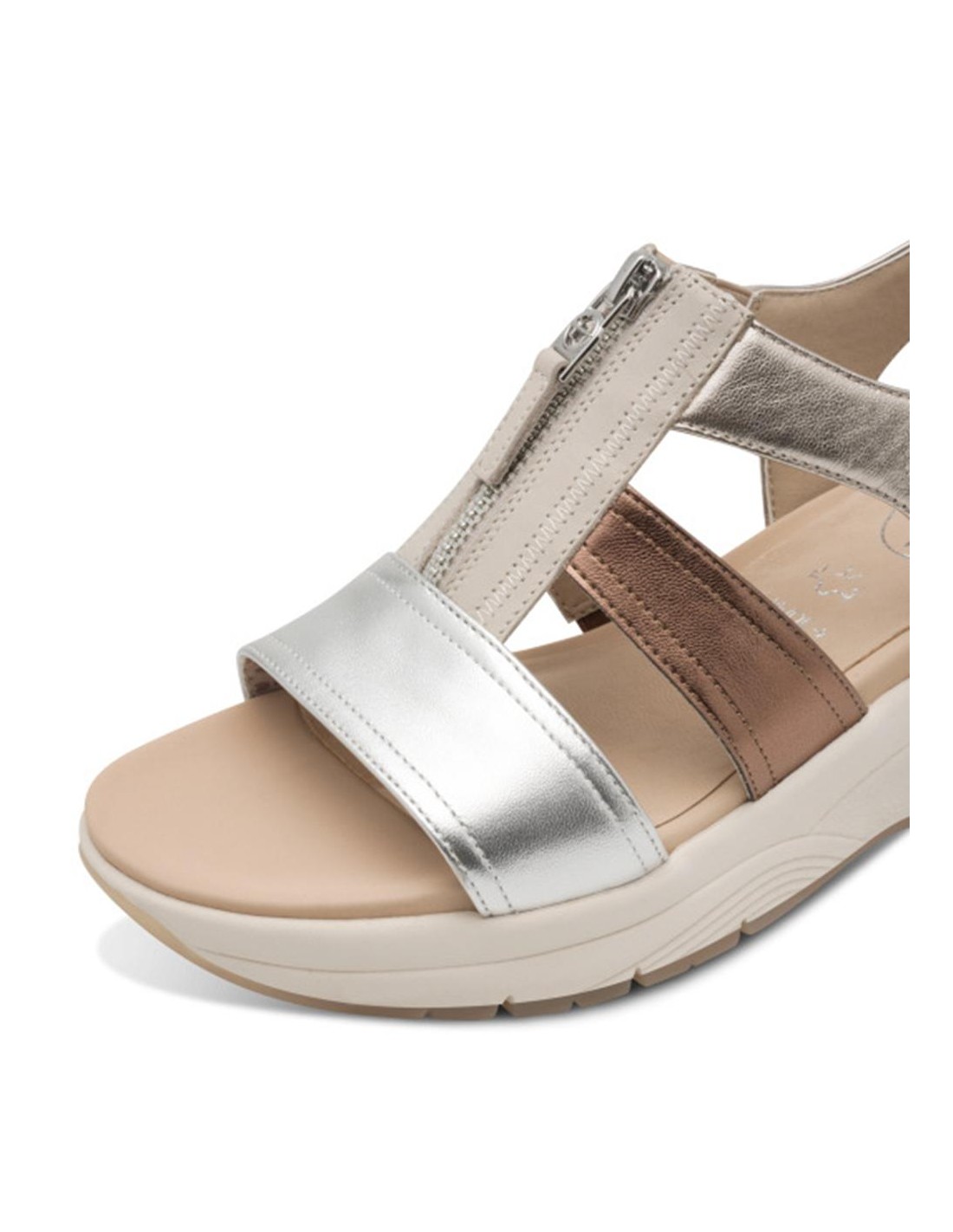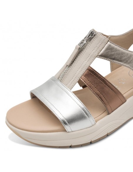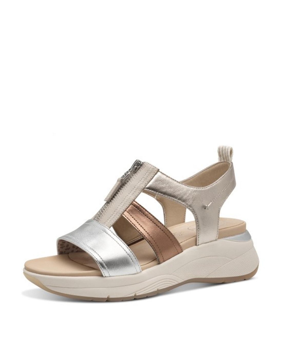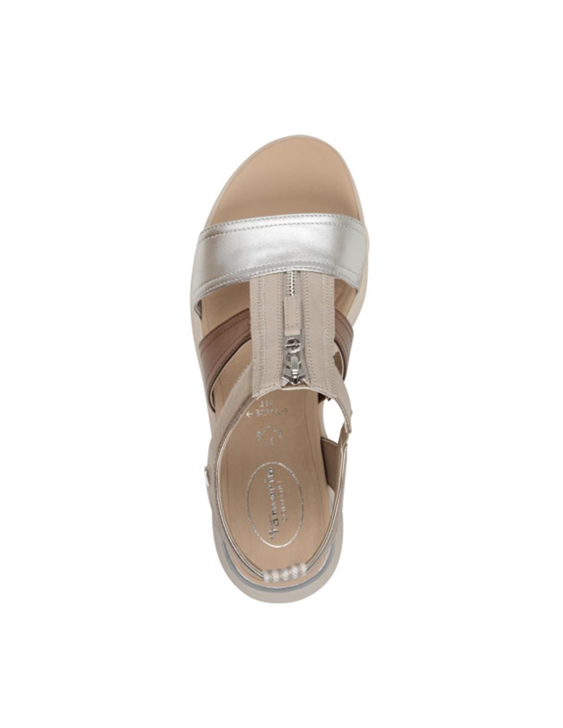 Descripción: Sandalia mujer 88722 de TAMARIS CONFORT en suave piel de tonos metalizados. Plantilla anatómica acolchada. Ajuste con cremallera. Ligera y cómoda cuña flexible y antideslizante.