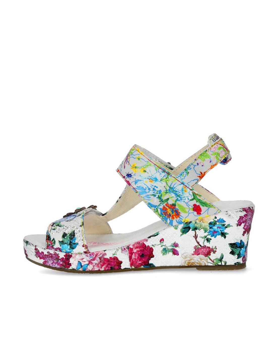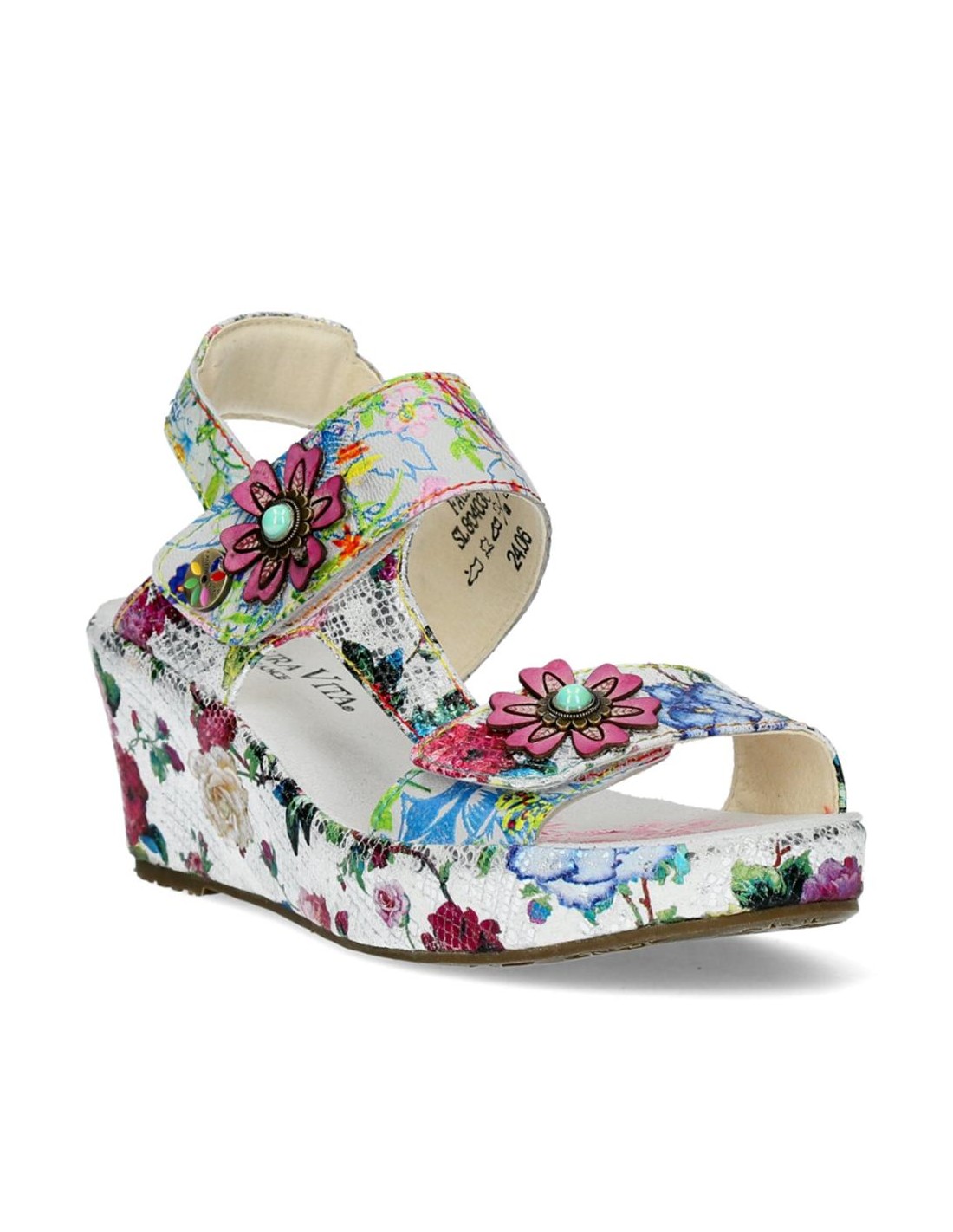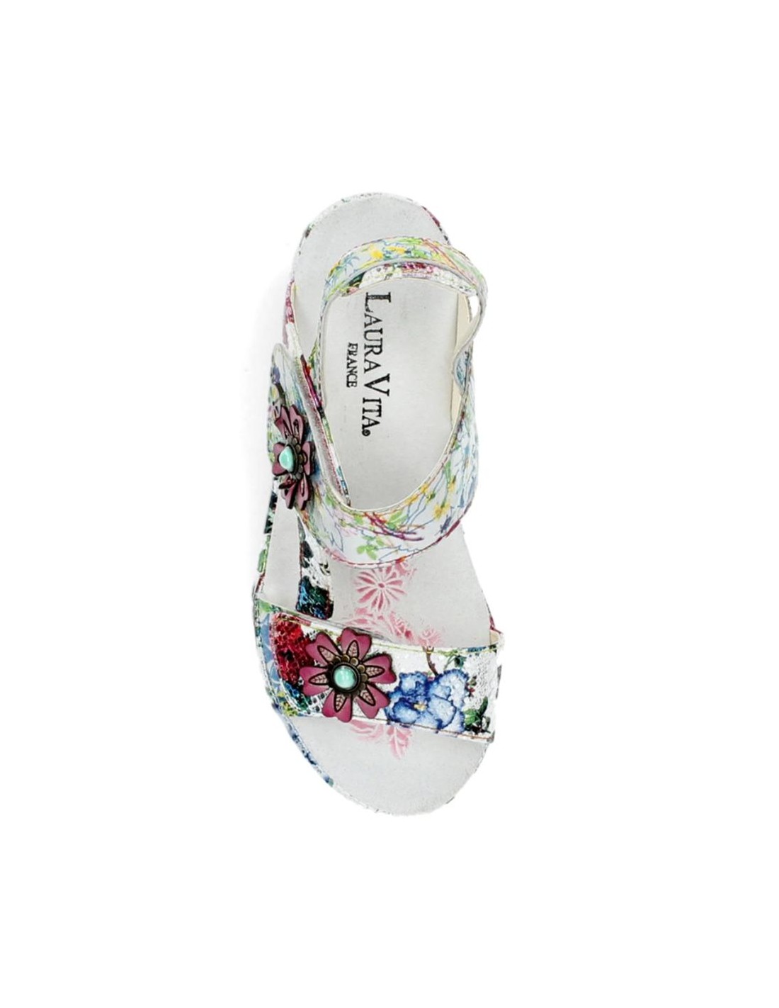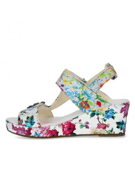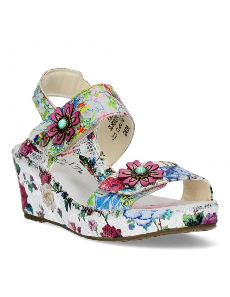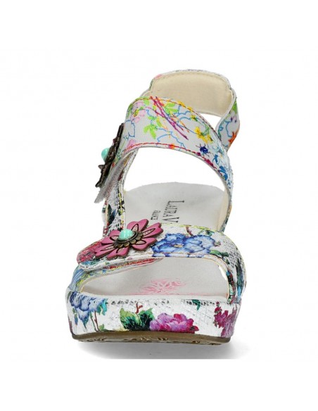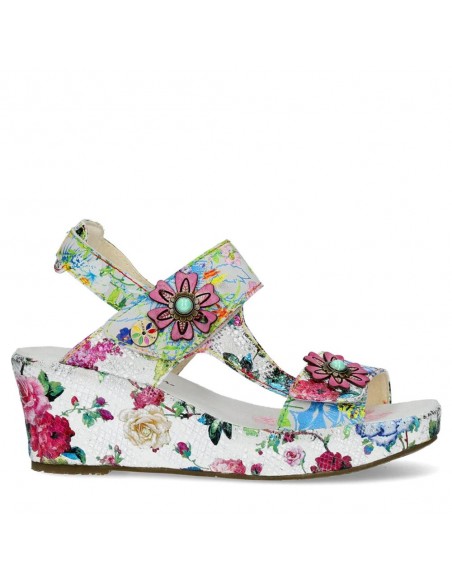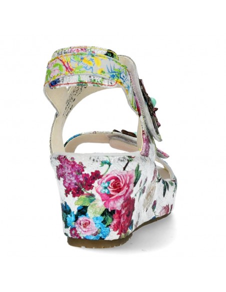 Descripción: Sandalia mujer Laura Vita FACDIO-37 en piel blanca estampada y detalle floral. Esta marca ofrece originalidad inspirada en la naturaleza y las artes, colorido nuevo cada temporada y comodidad ergonómica.
