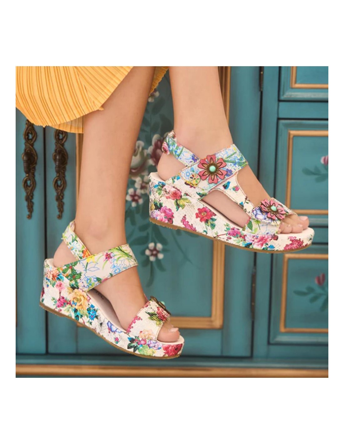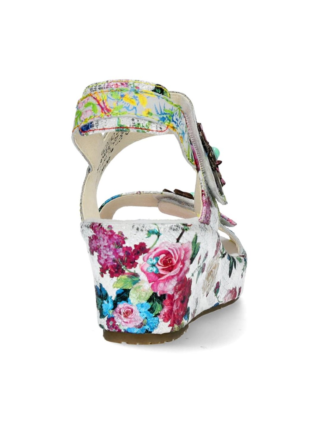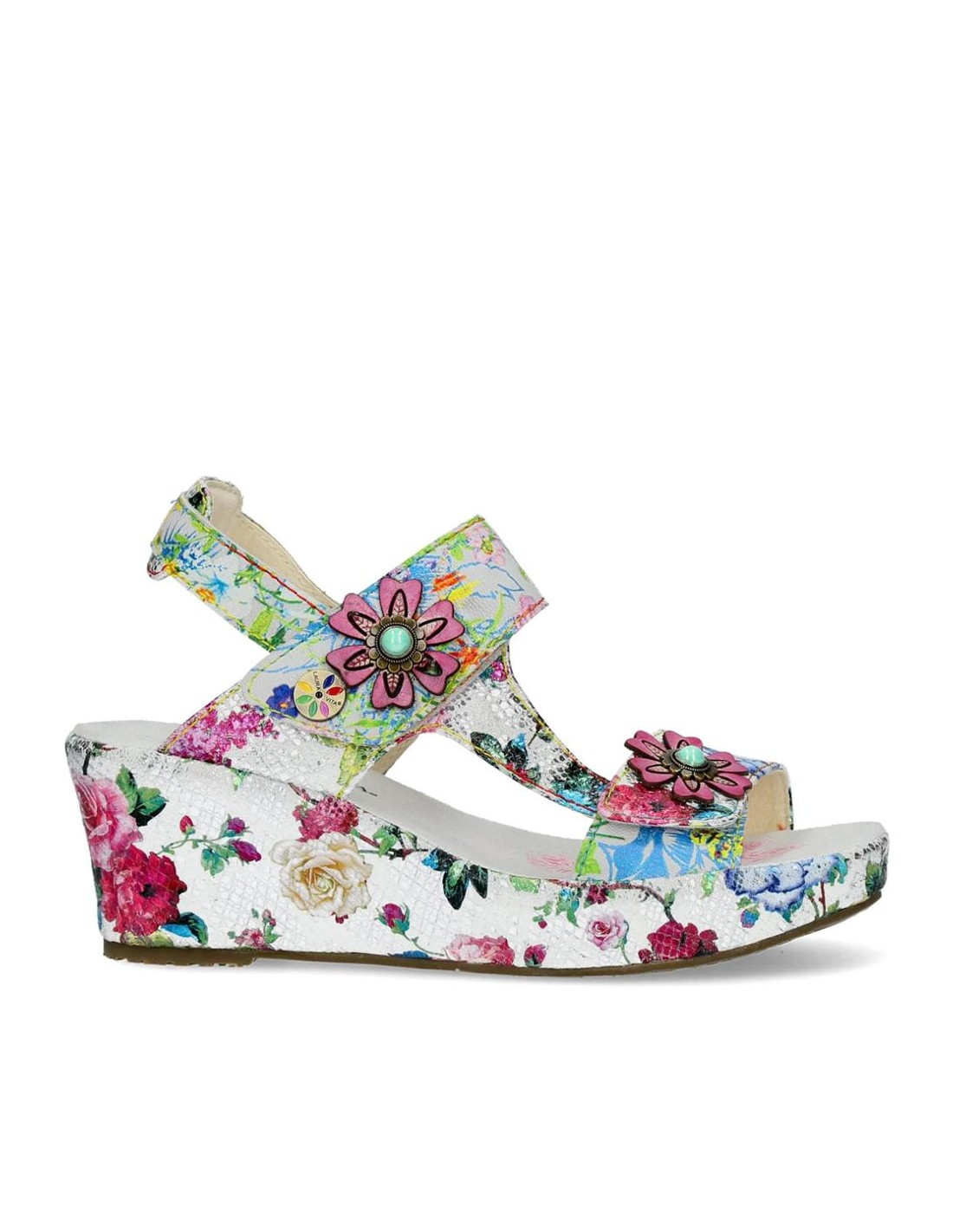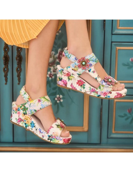 Descripción: Sandalia mujer Laura Vita FACDIO-37 en piel blanca estampada y detalle floral. Esta marca ofrece originalidad inspirada en la naturaleza y las artes, colorido nuevo cada temporada y comodidad ergonómica.