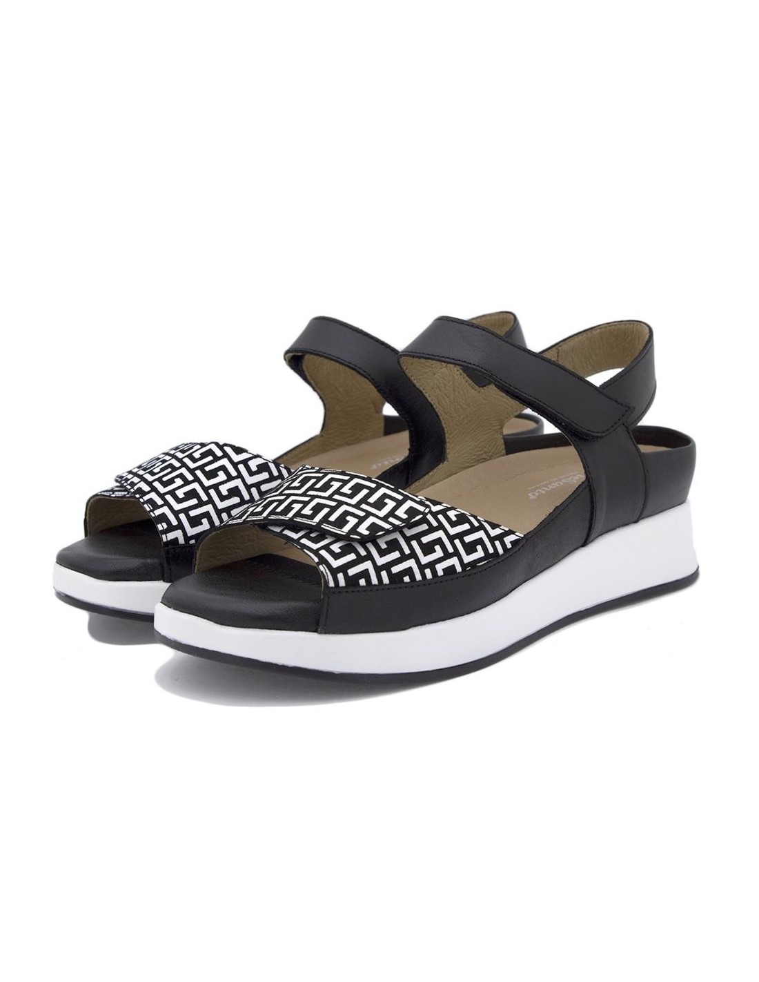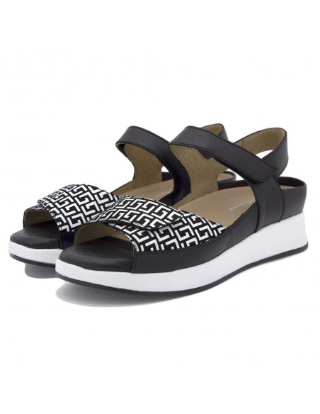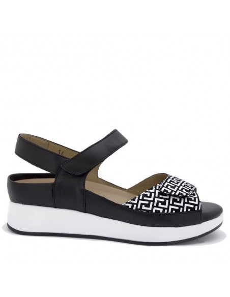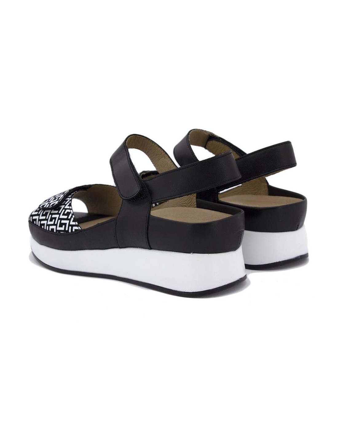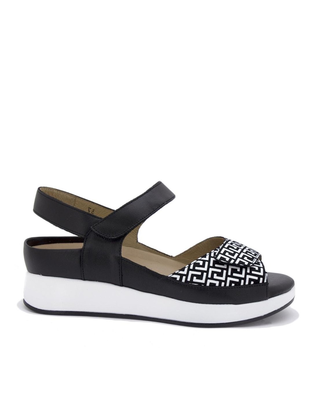 Descripción: Sandalia mujer de Pie Santo 250422 elegante en piel negra con detalles blancos. Forro y plantilla anatómica extraible en piel. Cuña forrada con piso antideslizante. Funda al tono en la puntera para esconder la plantilla.