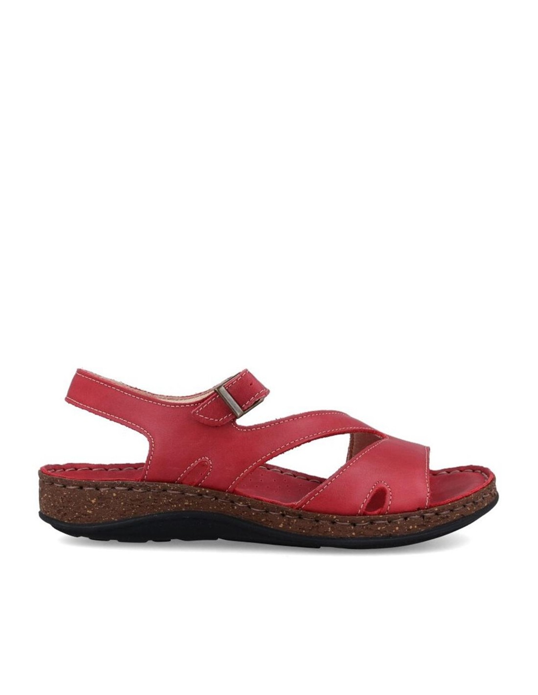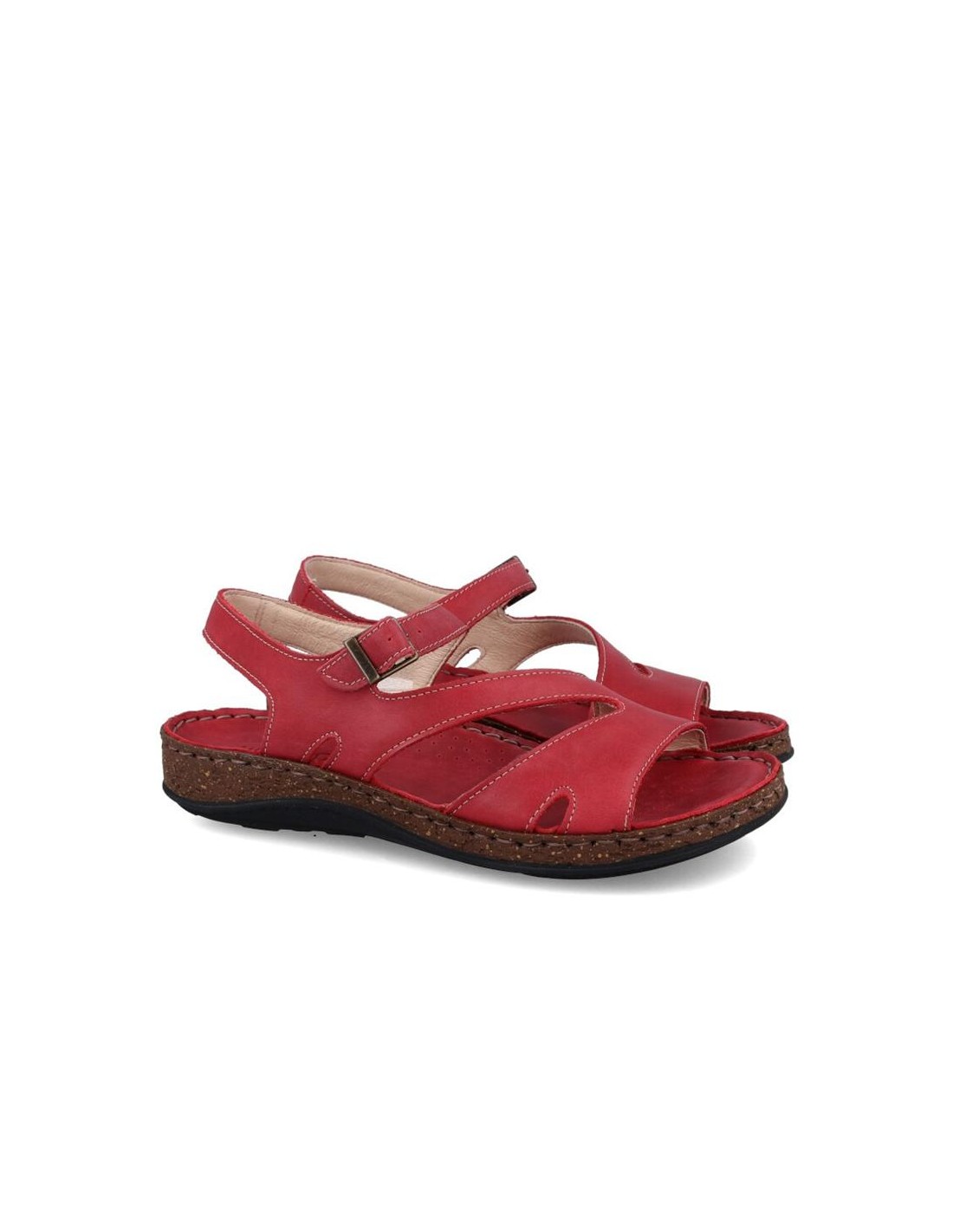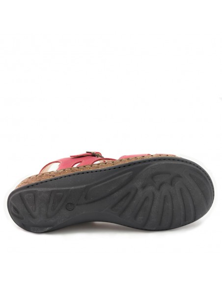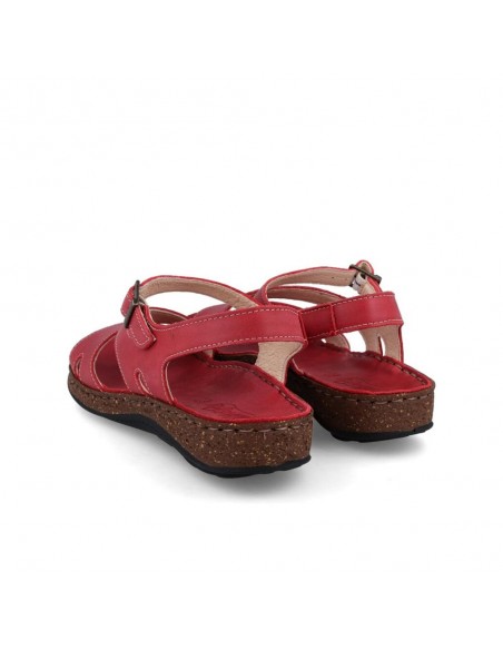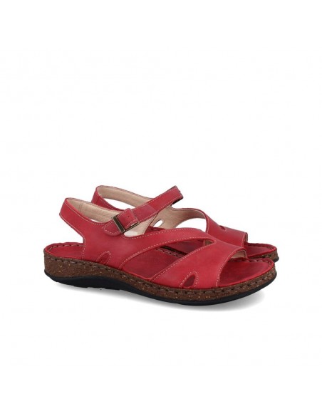 Descripción: Sandalia mujer WALK & FLY 3861-35580 en suave piel natural roja. Forro y plantilla acolchada de gel forrados en piel. Suela ligera beig cosida a mano para mayor flexibilidad con dibujo antideslizante