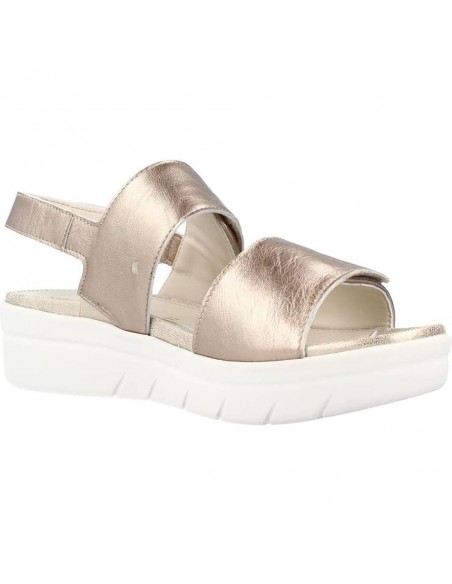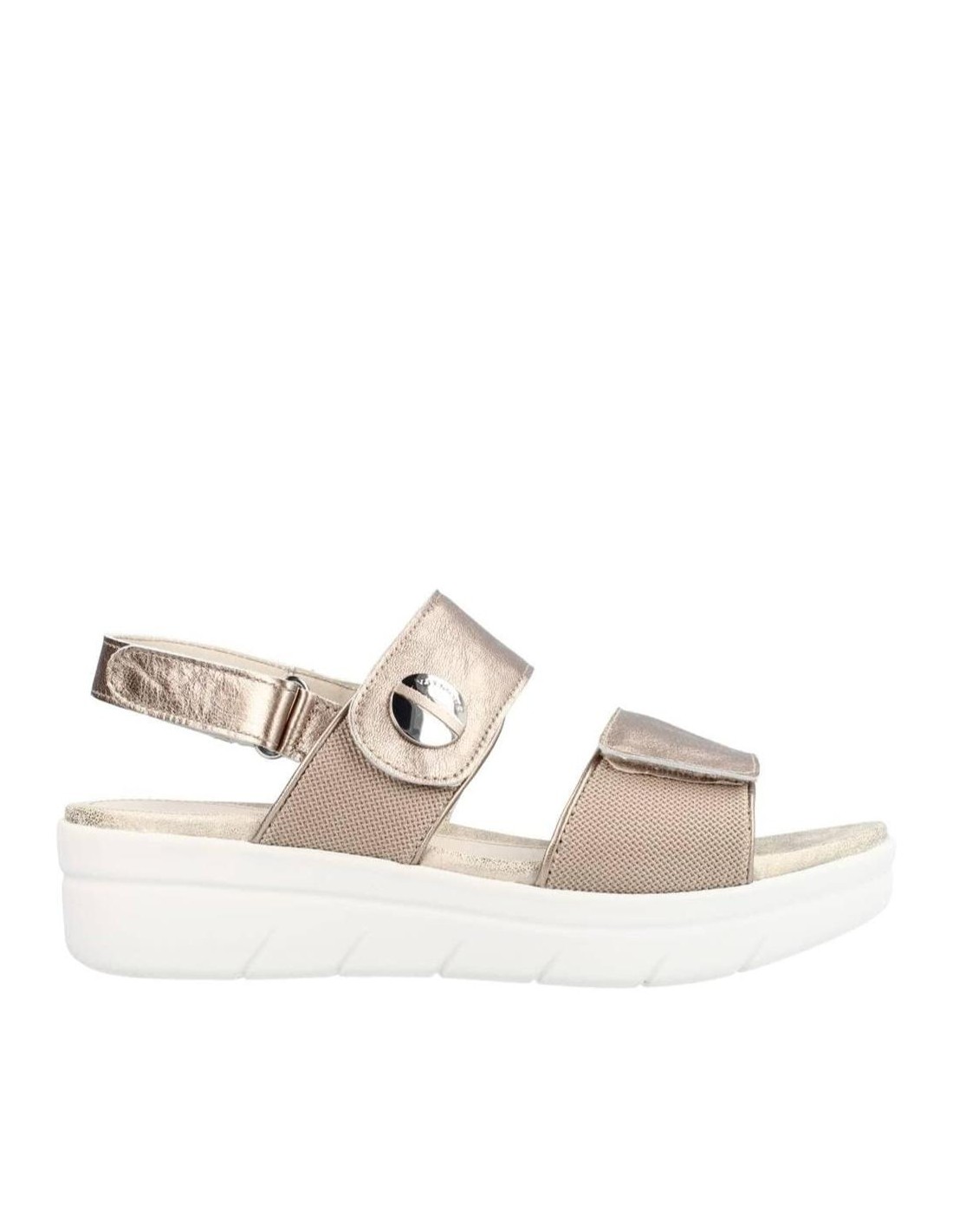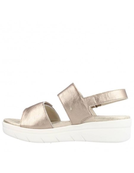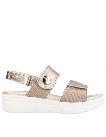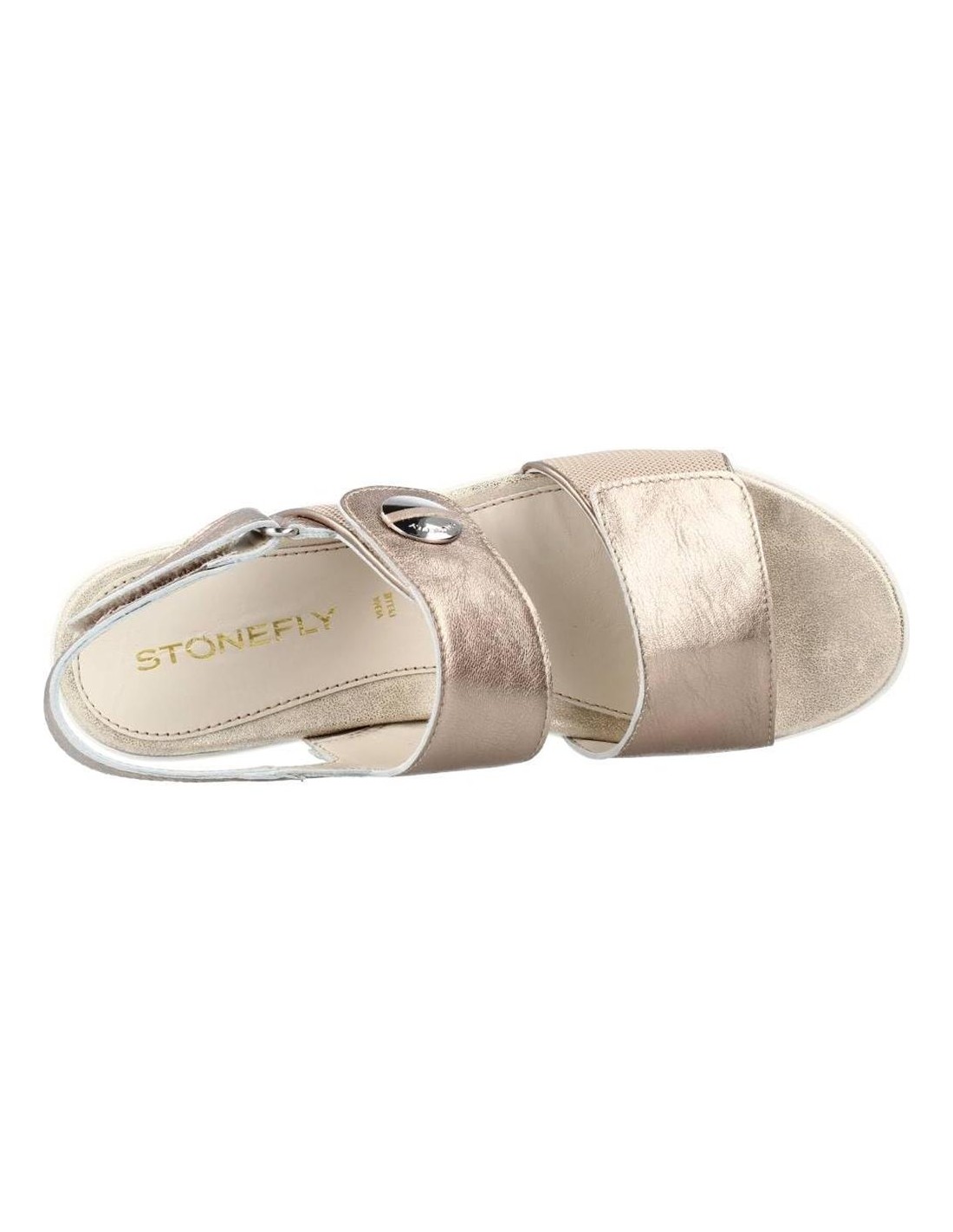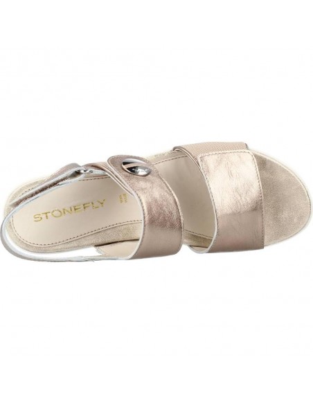 Descripción: Cómoda y elegante sandalia mujer de Stonefly AQUA III-12 en suave piel metalizada con detalle de malla beig. Ajuste con dos tiras de velcro. Cuña con plataforma con tecnología BLUSOFT amortiguadora.