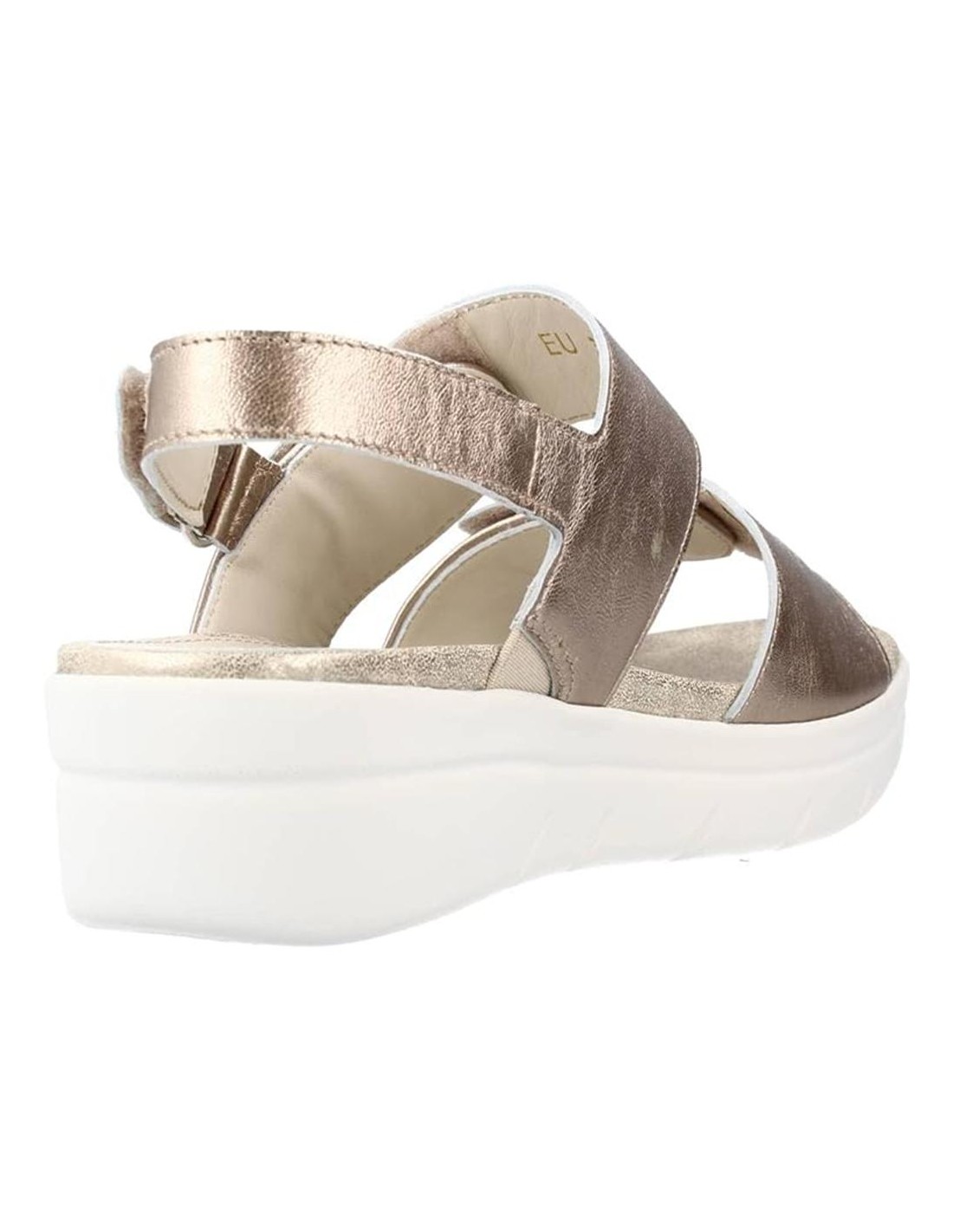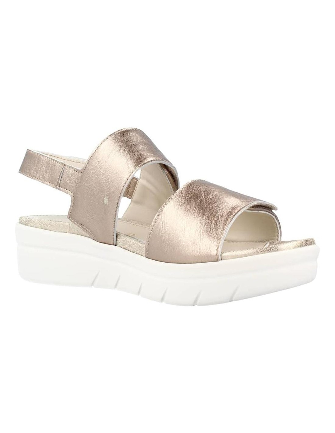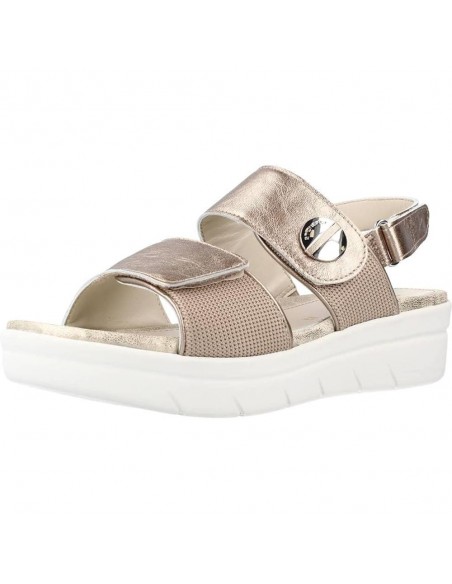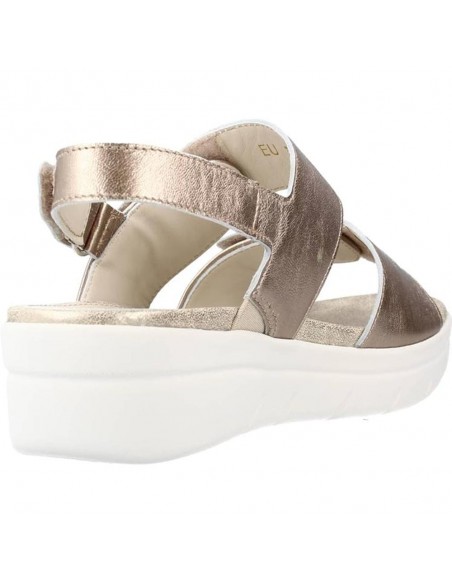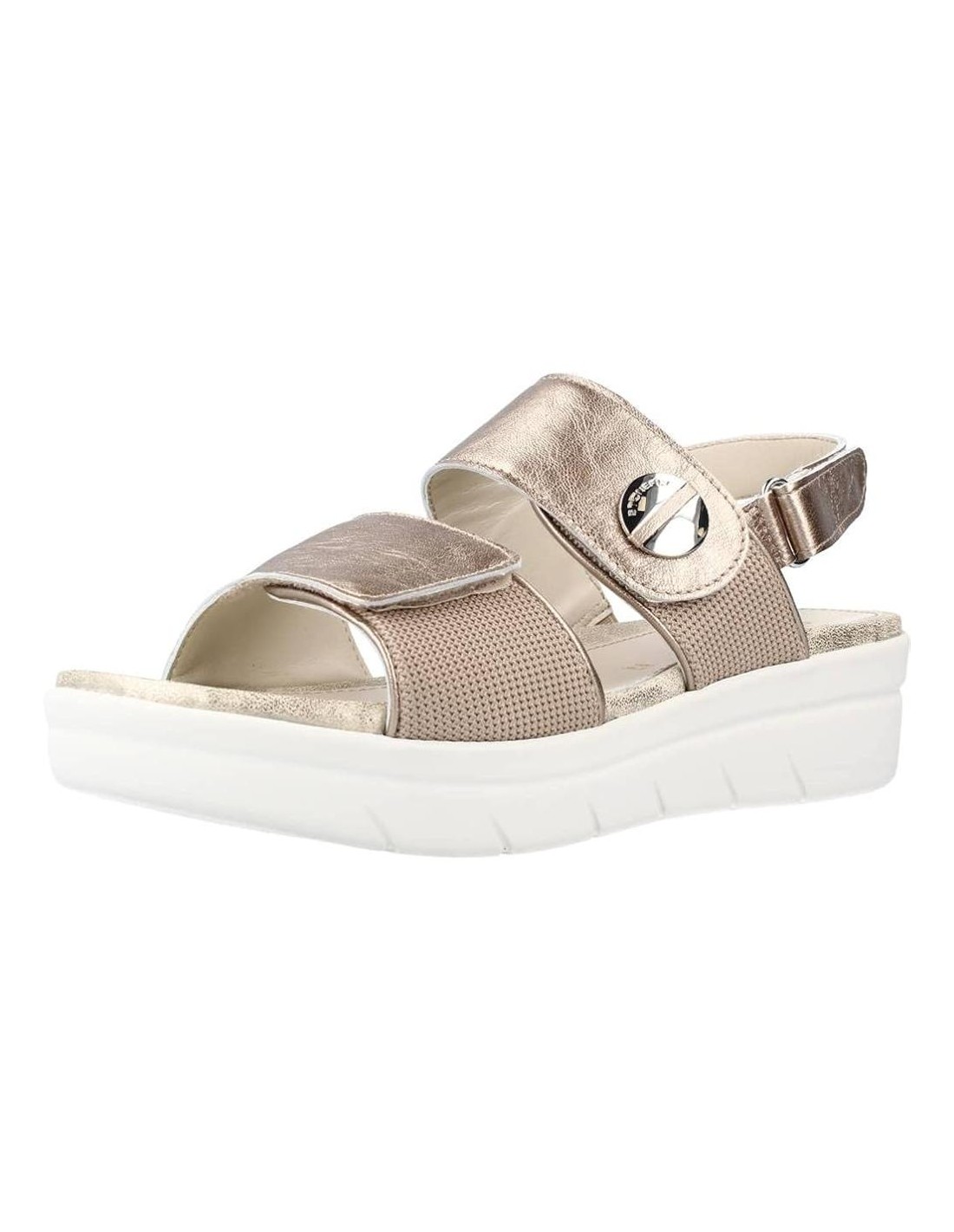Descripción: Cómoda y elegante sandalia mujer de Stonefly AQUA III-12 en suave piel metalizada con detalle de malla beig. Ajuste con dos tiras de velcro. Cuña con plataforma con tecnología BLUSOFT amortiguadora.