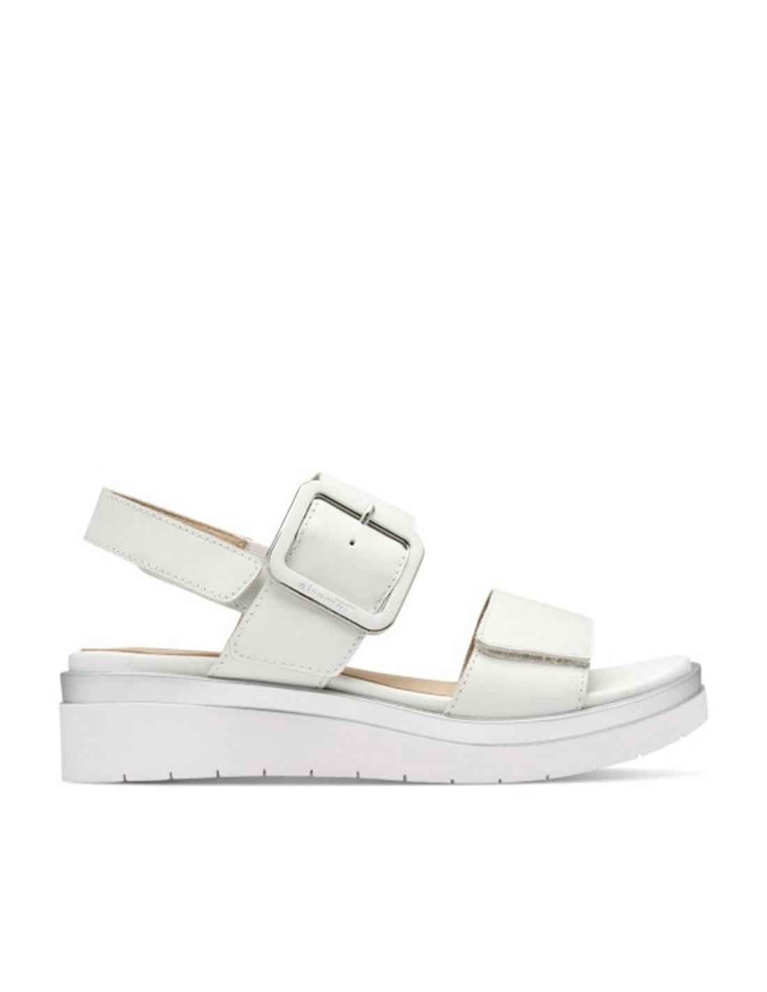 Descripción: Sandalia mujer 88706 de TAMARIS CONFORT en piel blanca y detalle plata. Plantilla anatómica acolchada extraible. Ajuste con tiras de velcro. Ligera y cómoda cuña antideslizante.