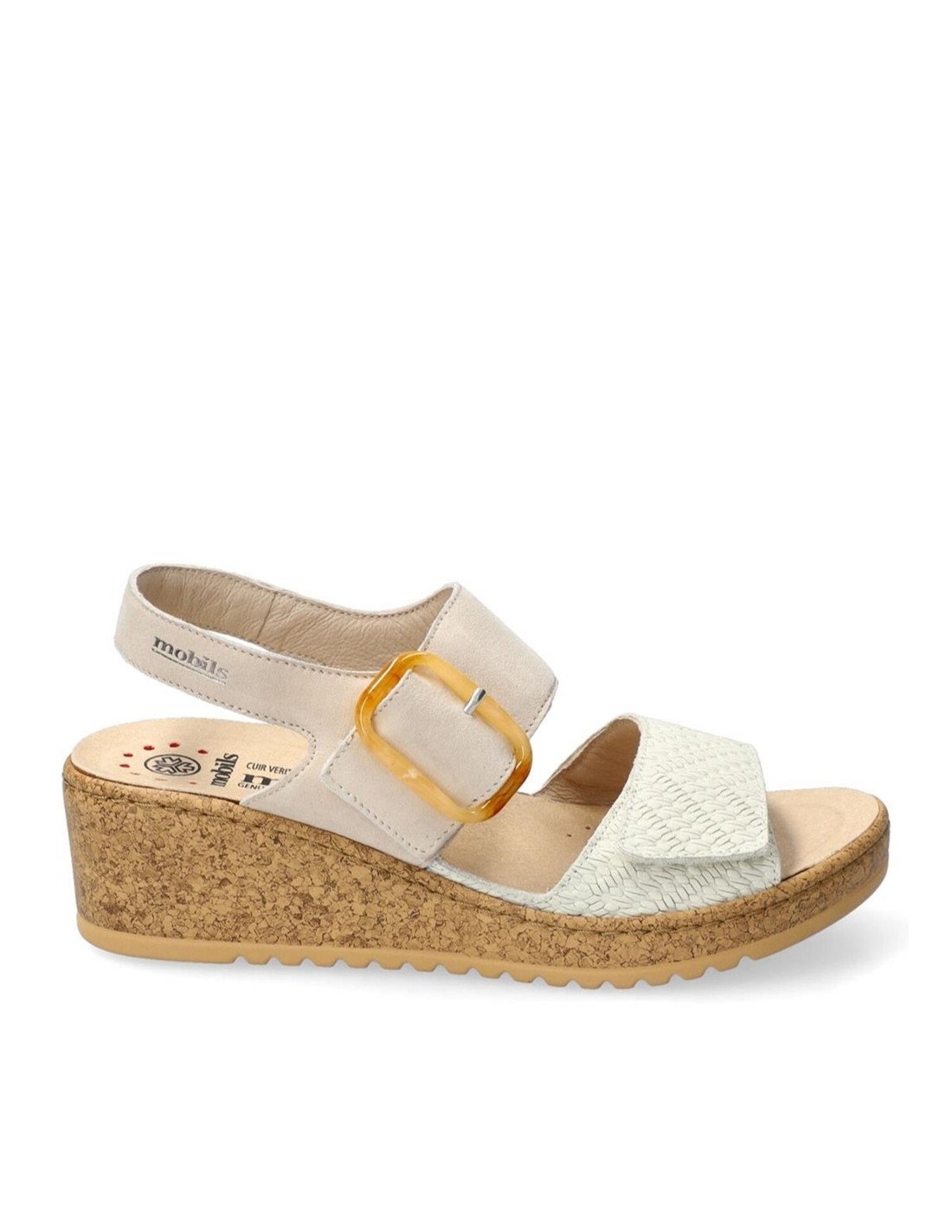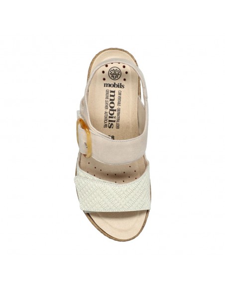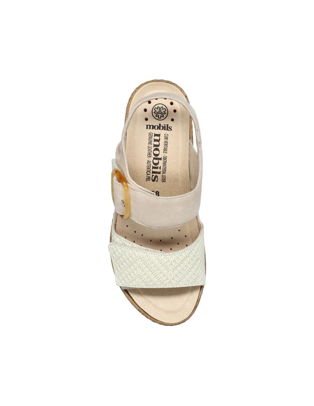 Descripción: Sandalia mujer Movils de Mephisto NASMA en suave piel offwhite con ajustes de velcro. Planta acolchada sobre una cuña con plataforma súper ligera, con un toque texturizado más moderno, estilo cómodo.