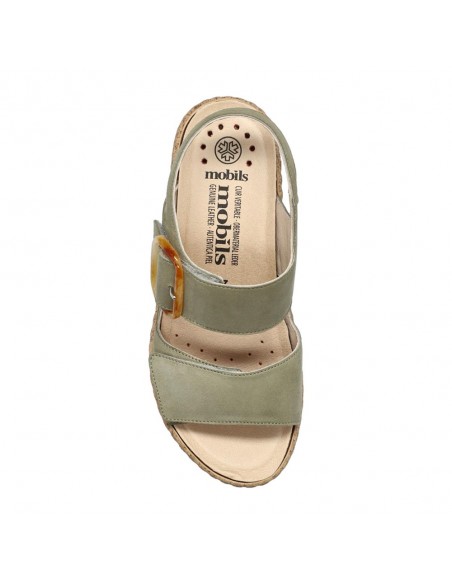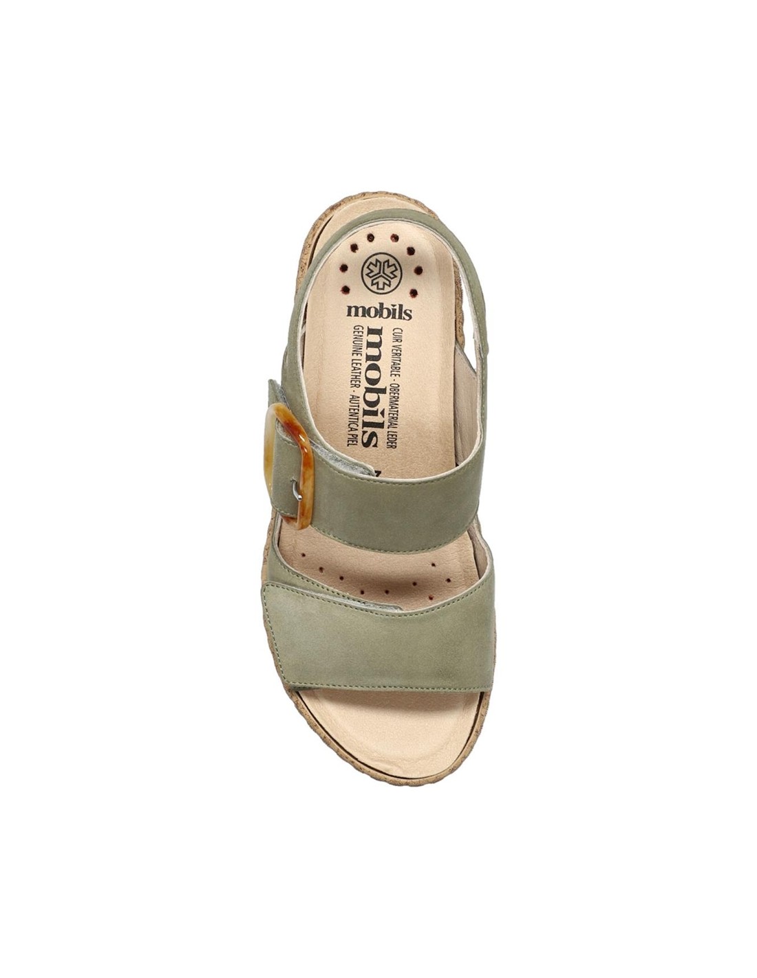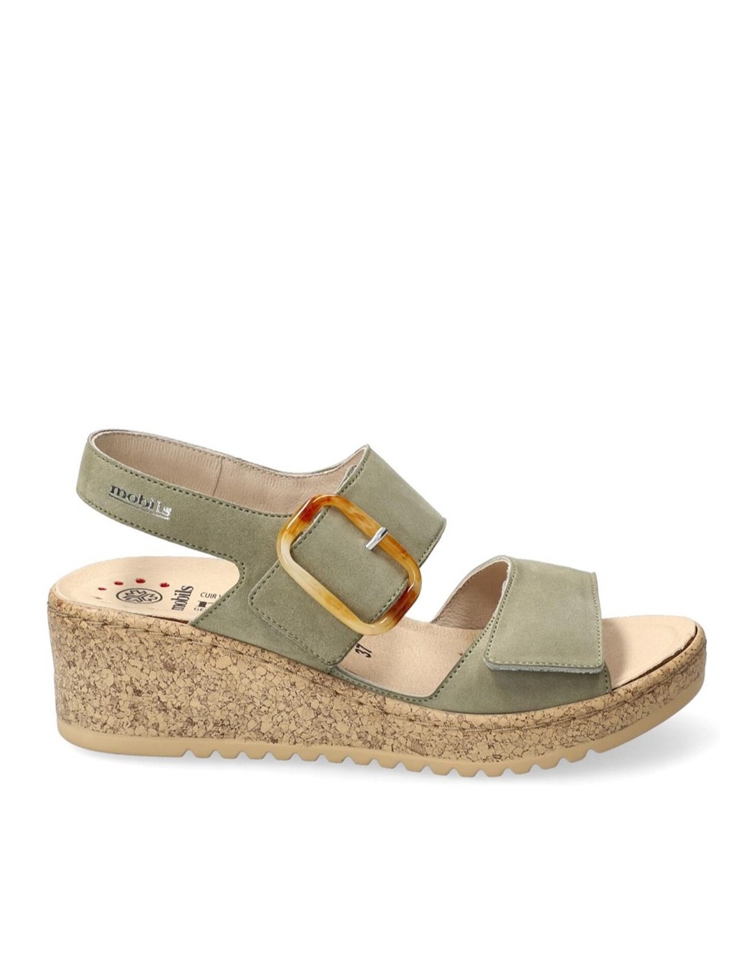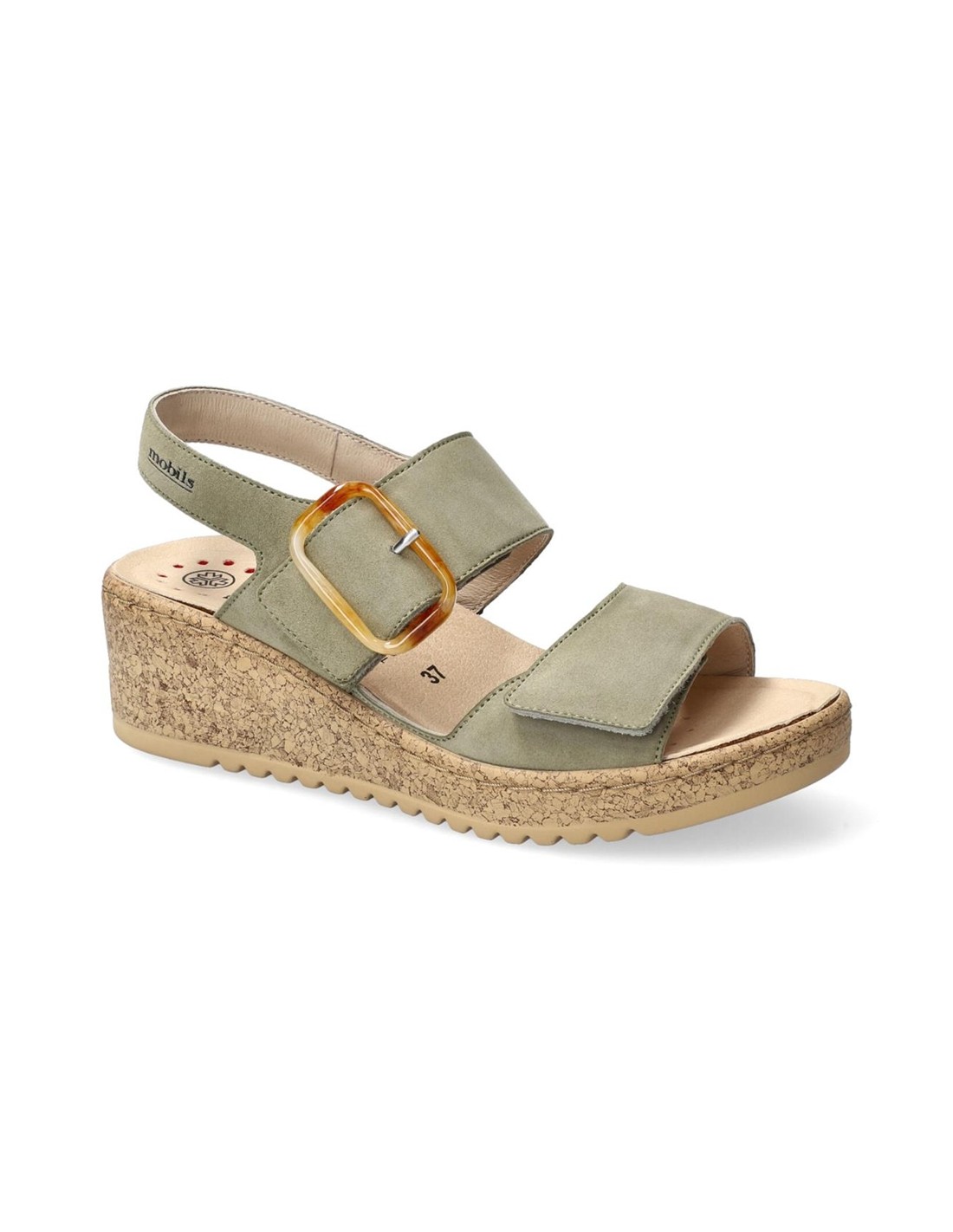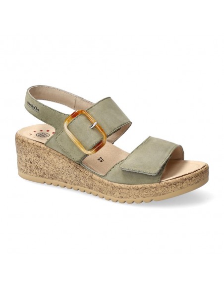 Descripción: Sandalia mujer Mephisto NASMA en suave nubuck kaki con ajustes de velcro. Planta acolchada sobre una cuña con plataforma súper ligera, con un toque texturizado más moderno, estilo cómodo.