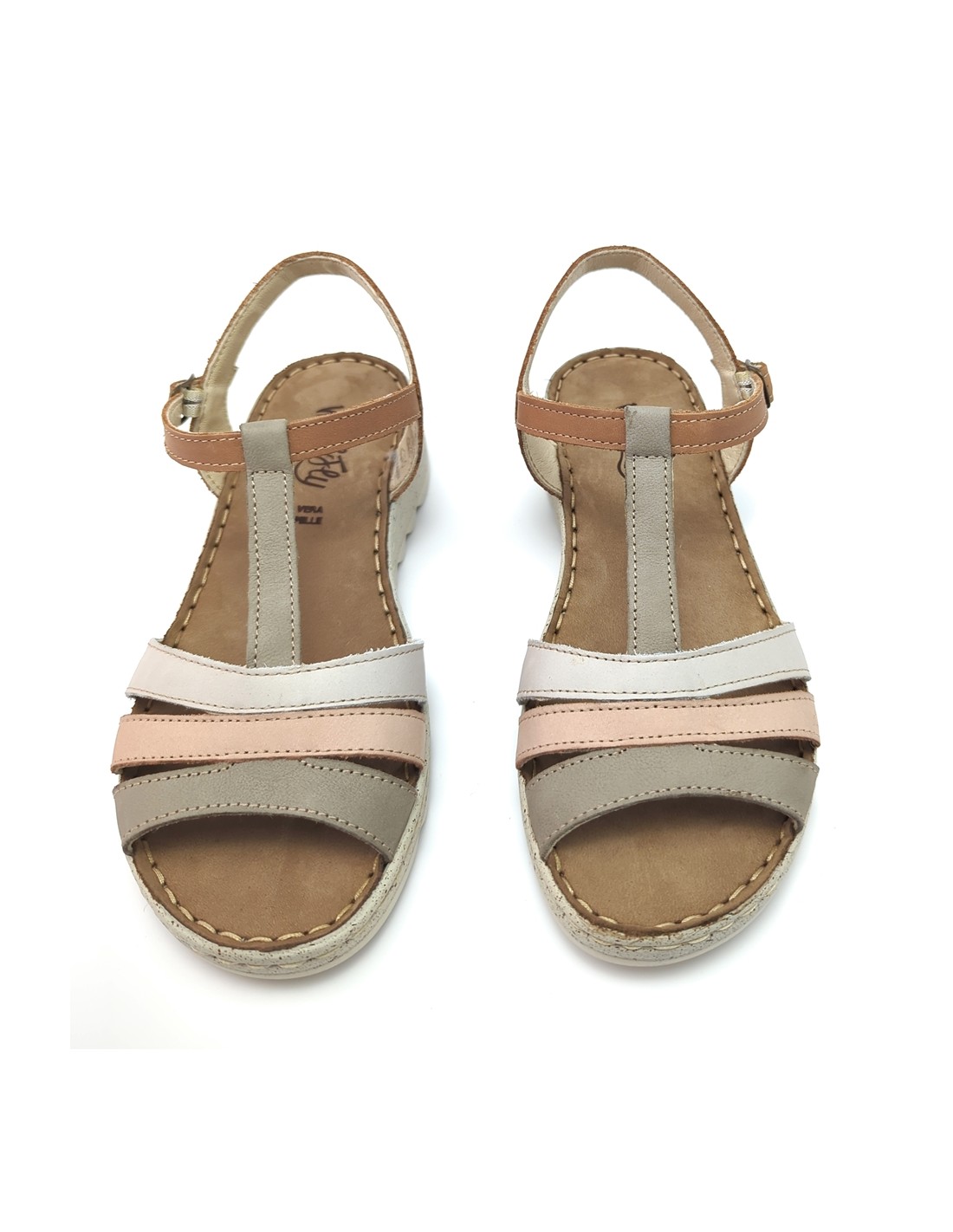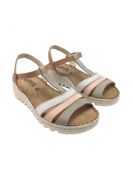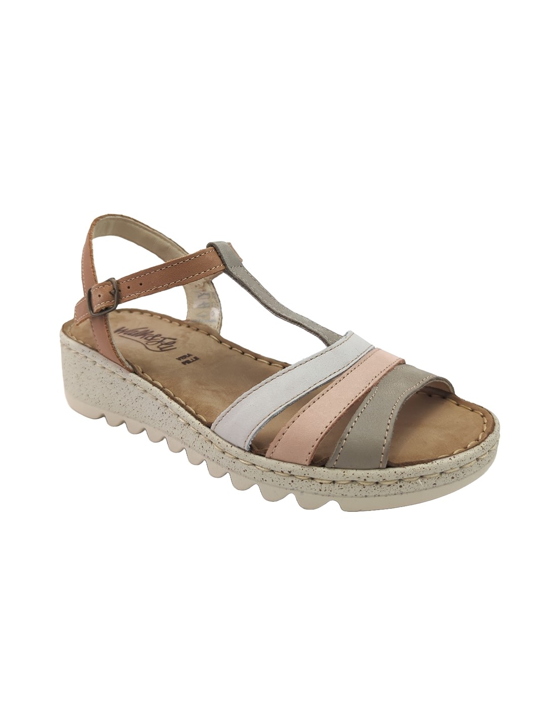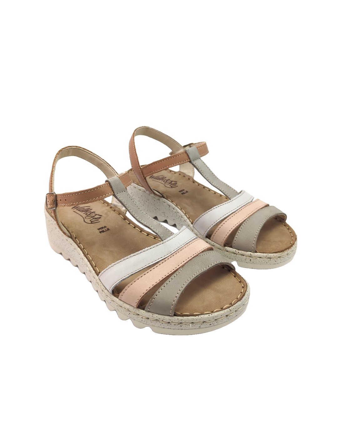 Descripción: Sandalia mujer WALK & FLY 9371-50680 en suave piel natural cuero, ofwhite, beig y gris. Forro y plantilla acolchada de gel forrados en piel. Suela ligera beig cosida a mano para mayor flexibilidad antideslizante.