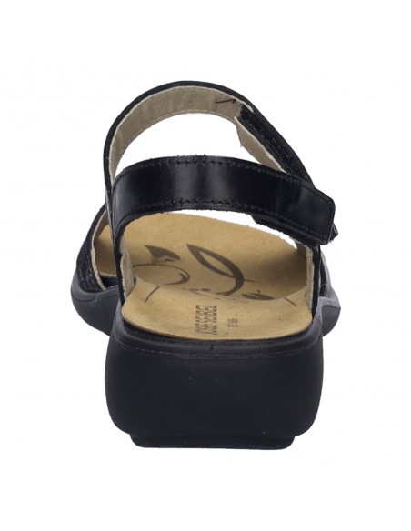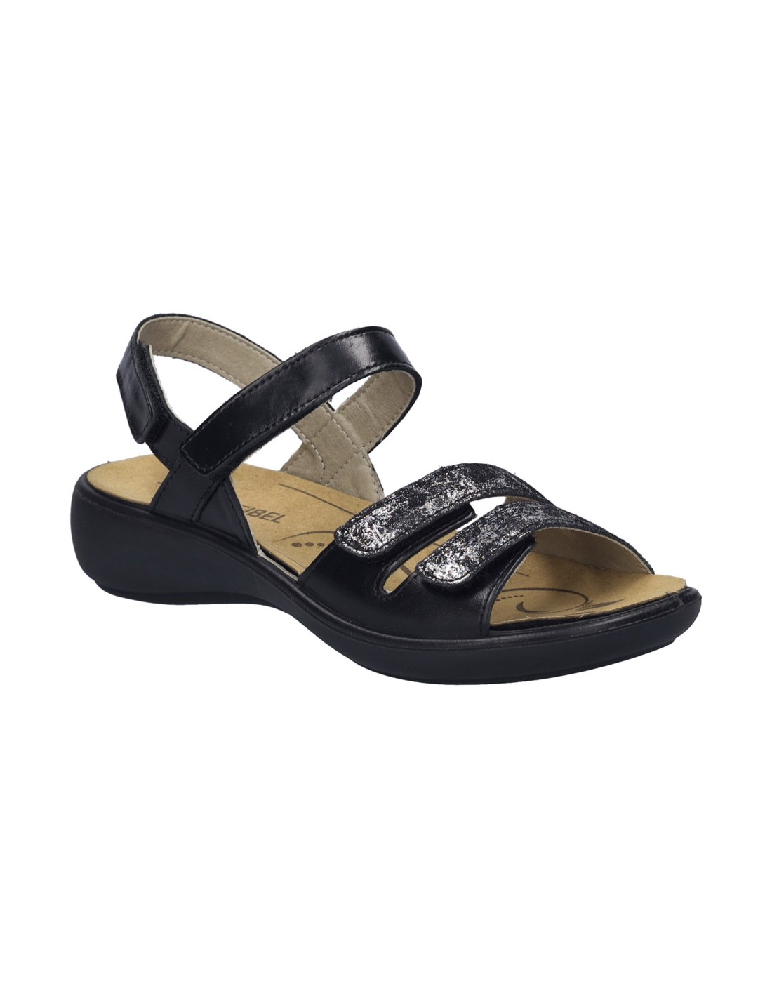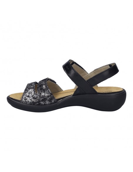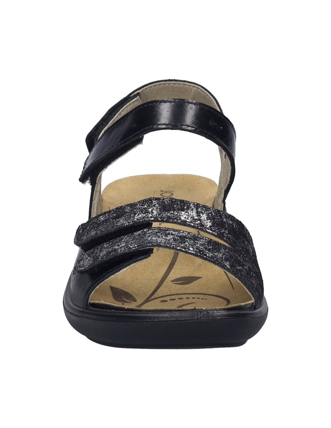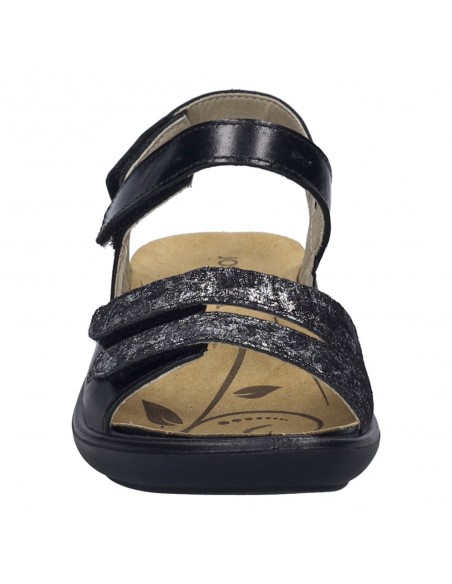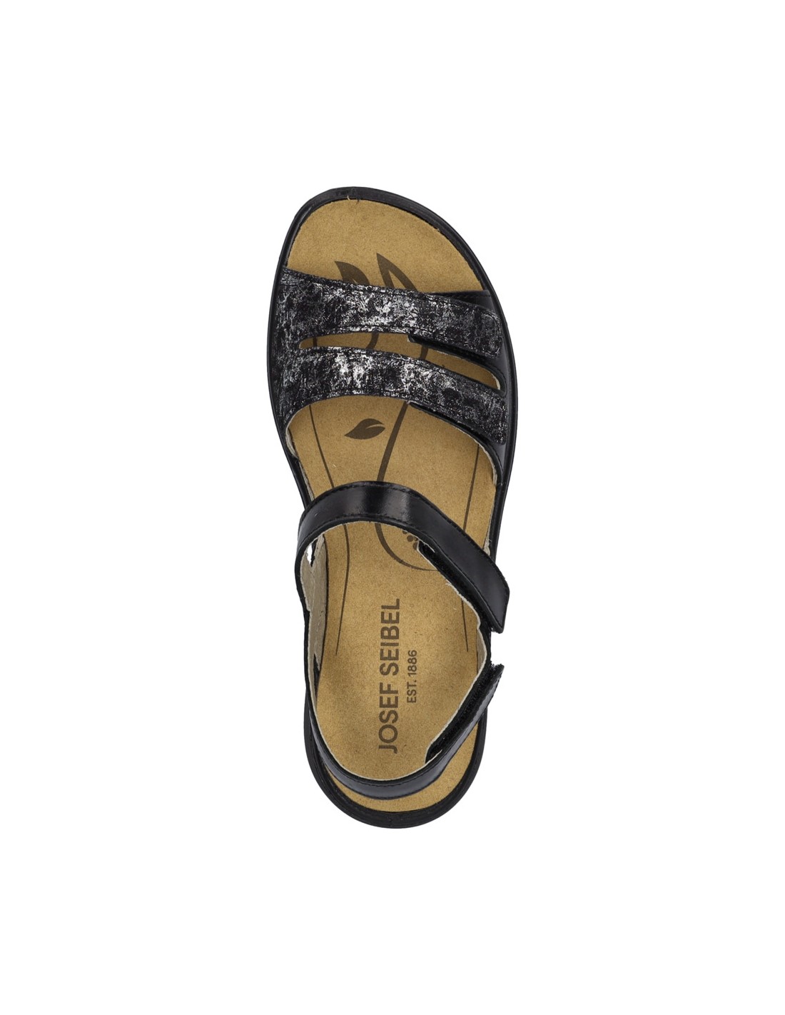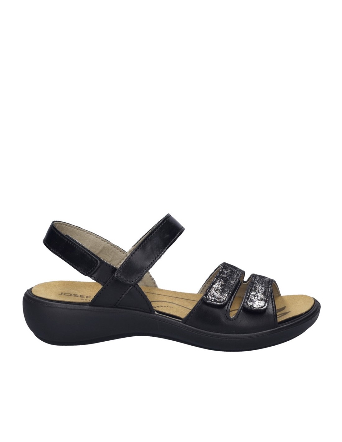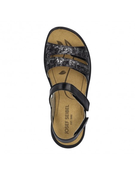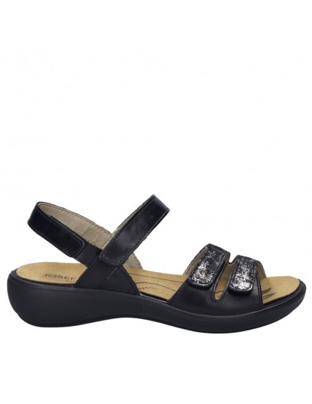 Descripción: Sandalia mujer de Josef Seibel IBIZA-86 en suave piel negra con detalle metalizado. Ajuste con velcros. Planta anatómica extraible. Piso de poliuretano inyectado ligero y con dibujo antideslizante.