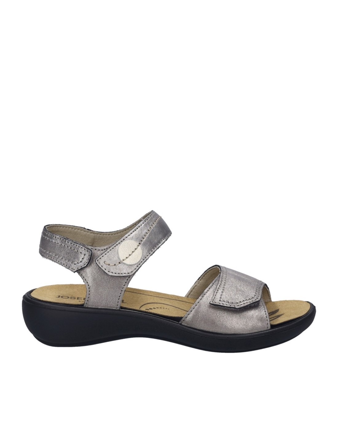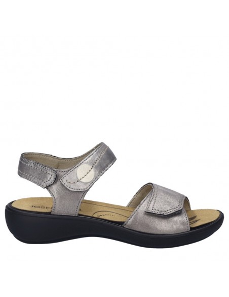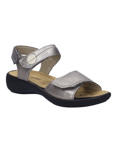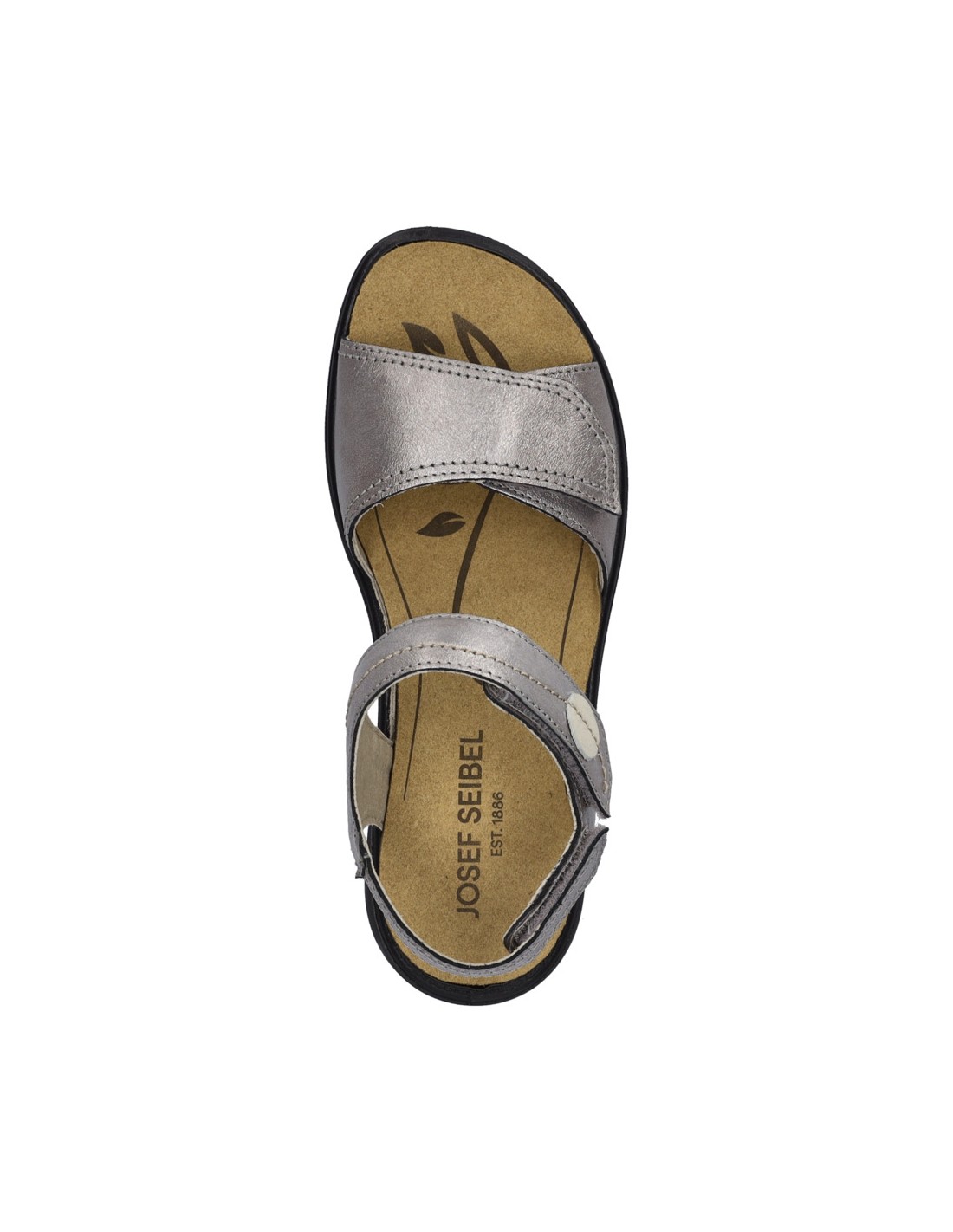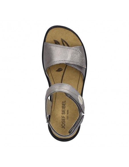Descripción: Sandalia mujer de Josef Seibel IBIZA-79 en suave piel platino. Ajuste con velcros. Planta anatómica extraible. Piso de poliuretano inyectado ligero y con dibujo antideslizante.