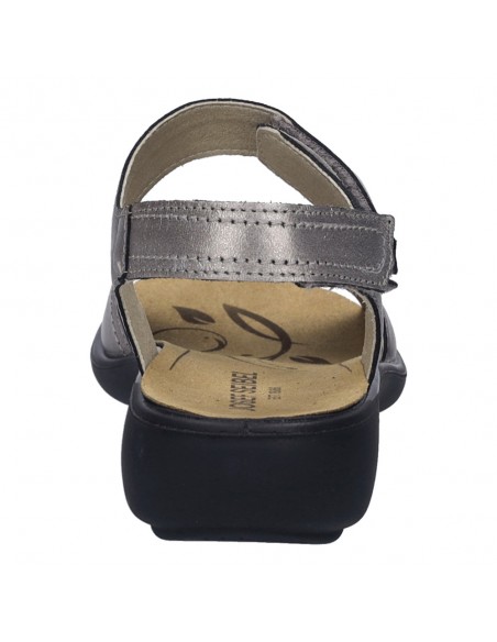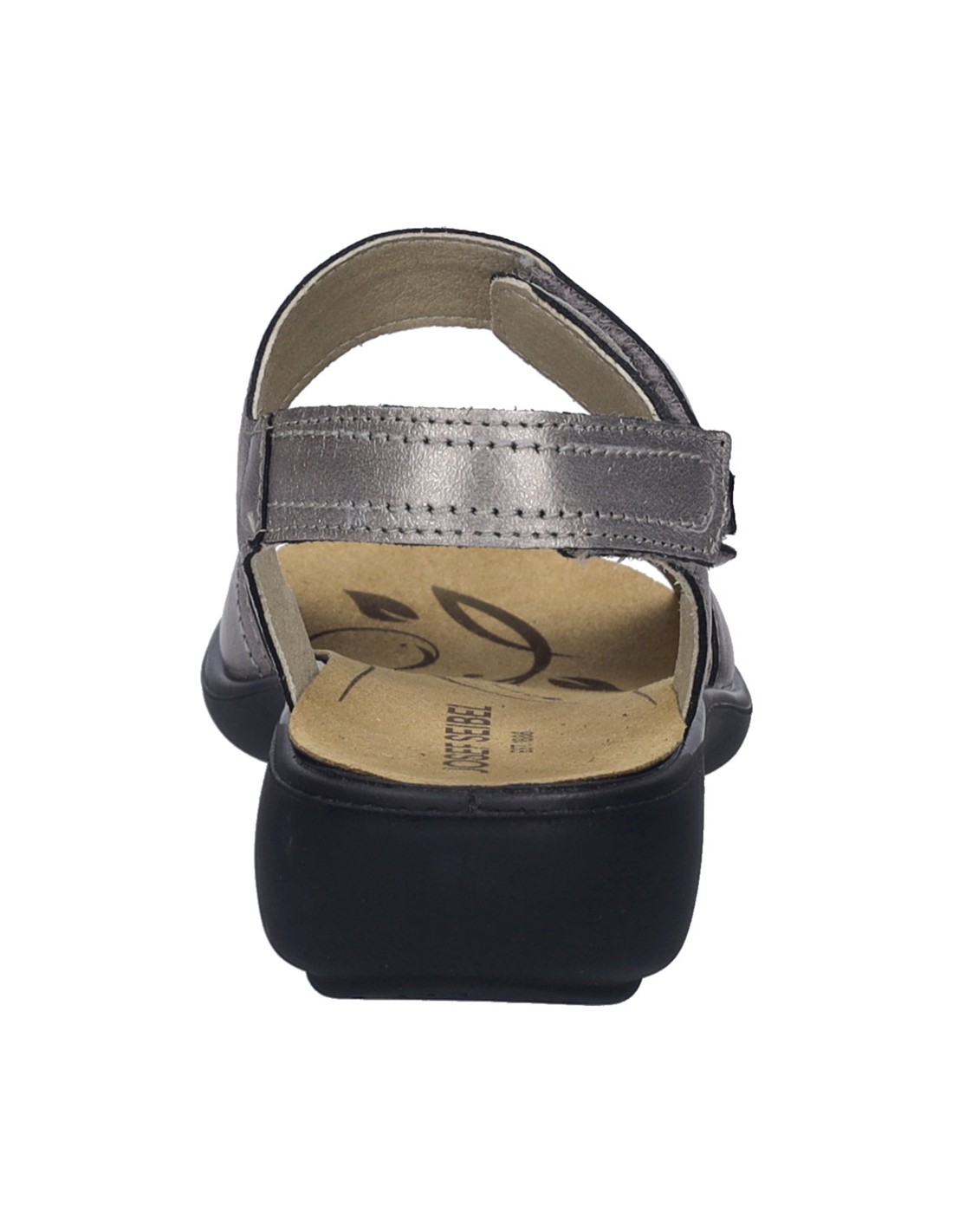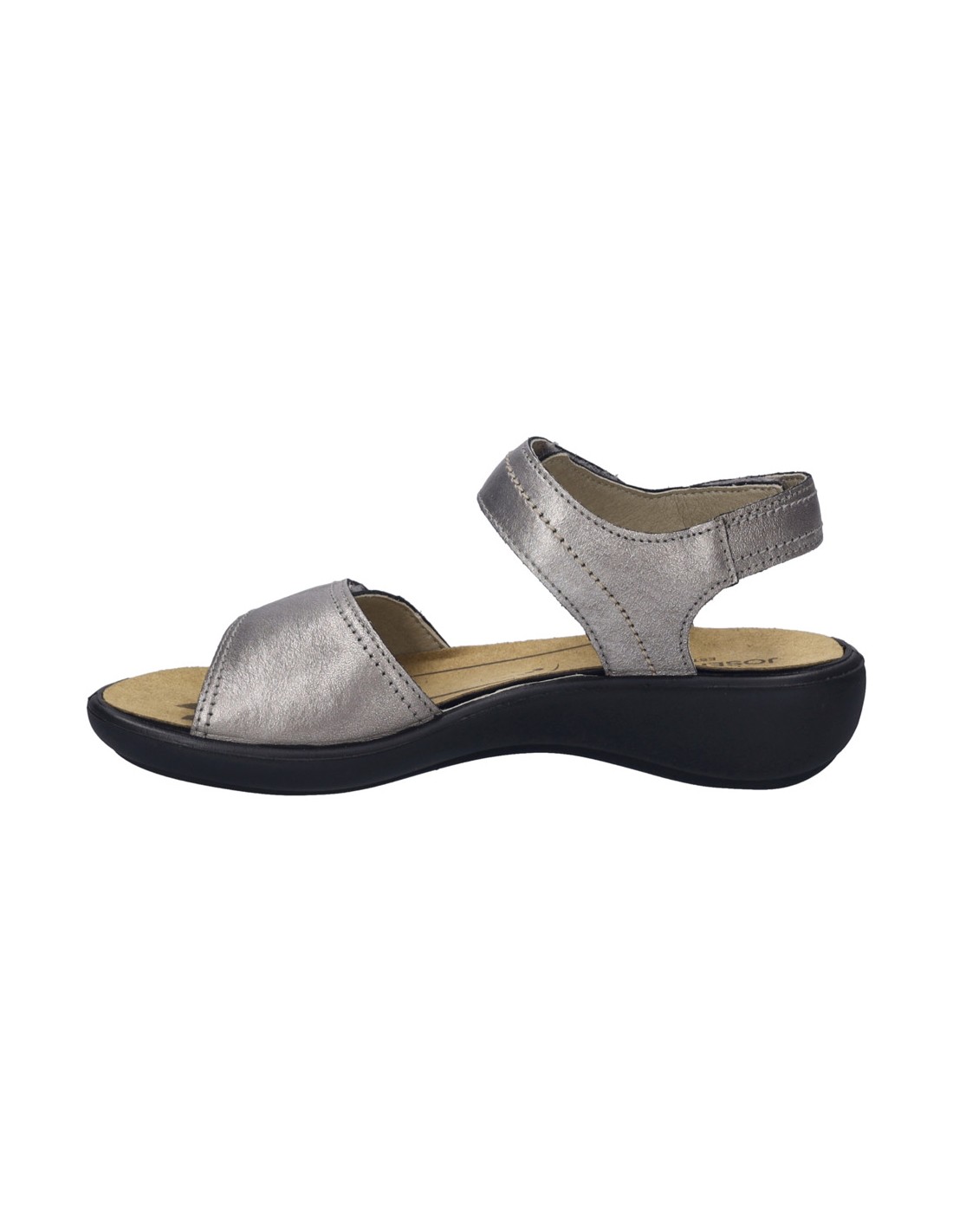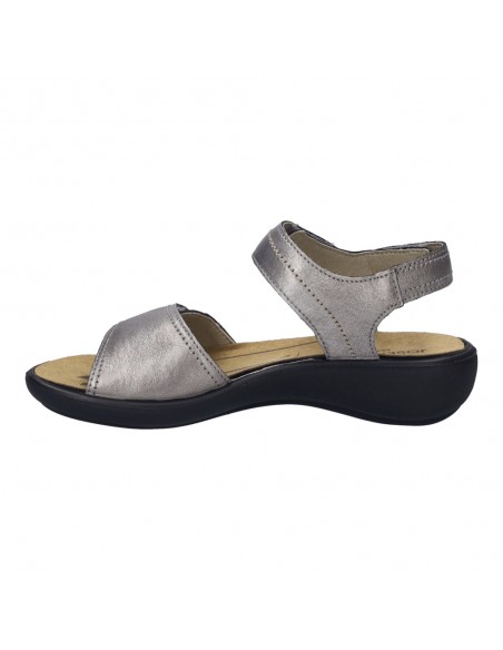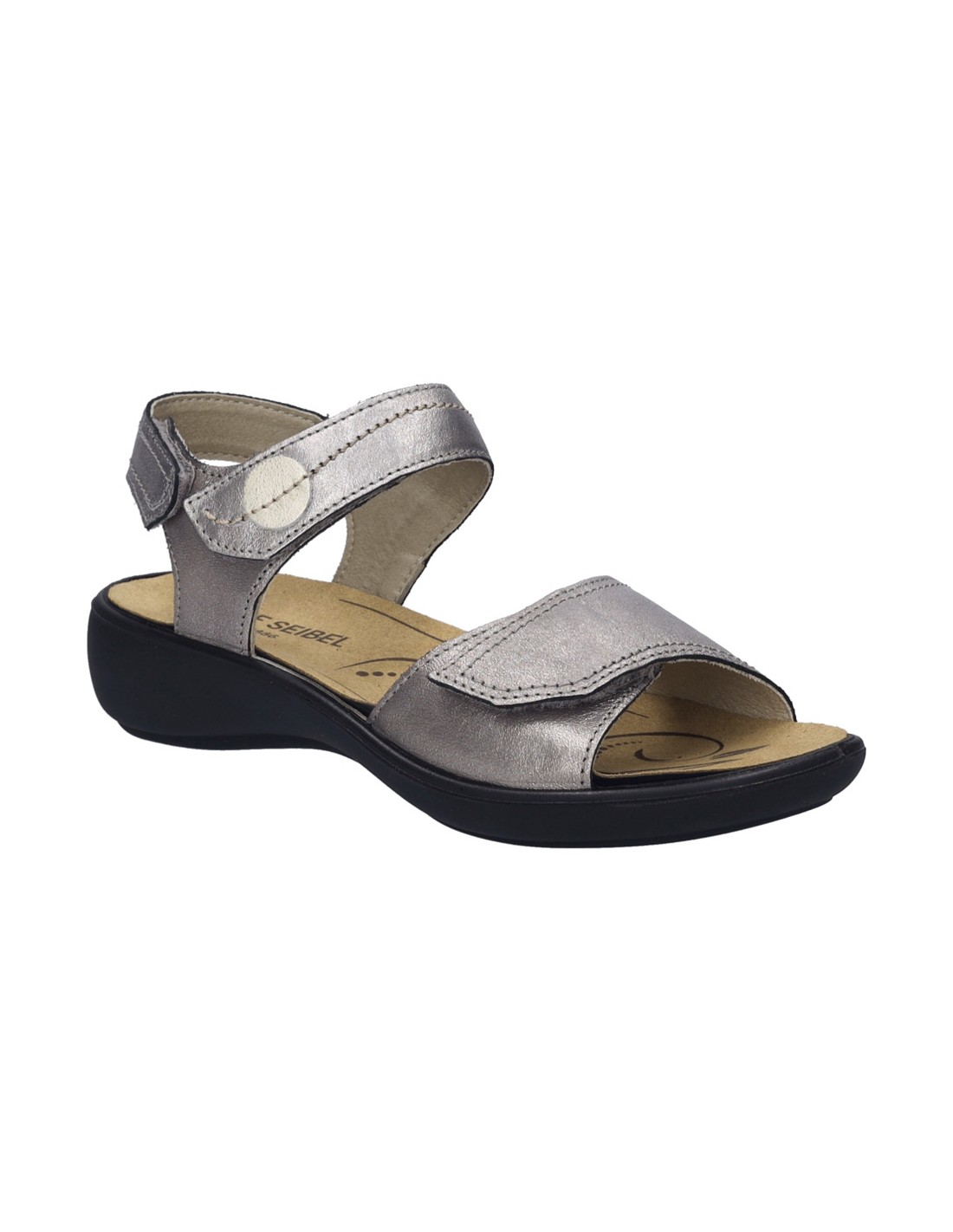 Descripción: Sandalia mujer de Josef Seibel IBIZA-79 en suave piel platino. Ajuste con velcros. Planta anatómica extraible. Piso de poliuretano inyectado ligero y con dibujo antideslizante.