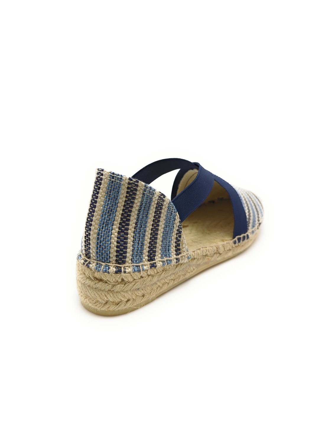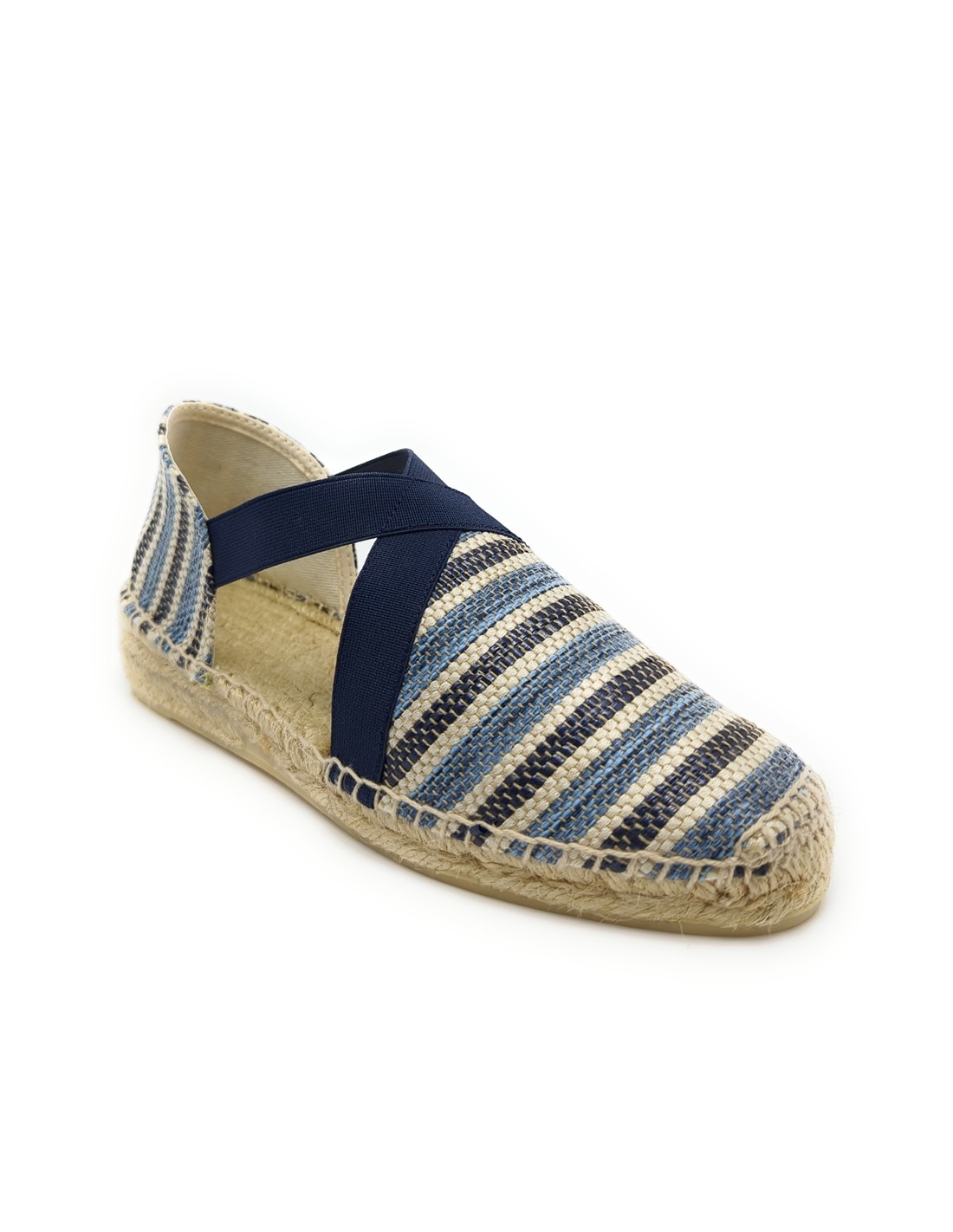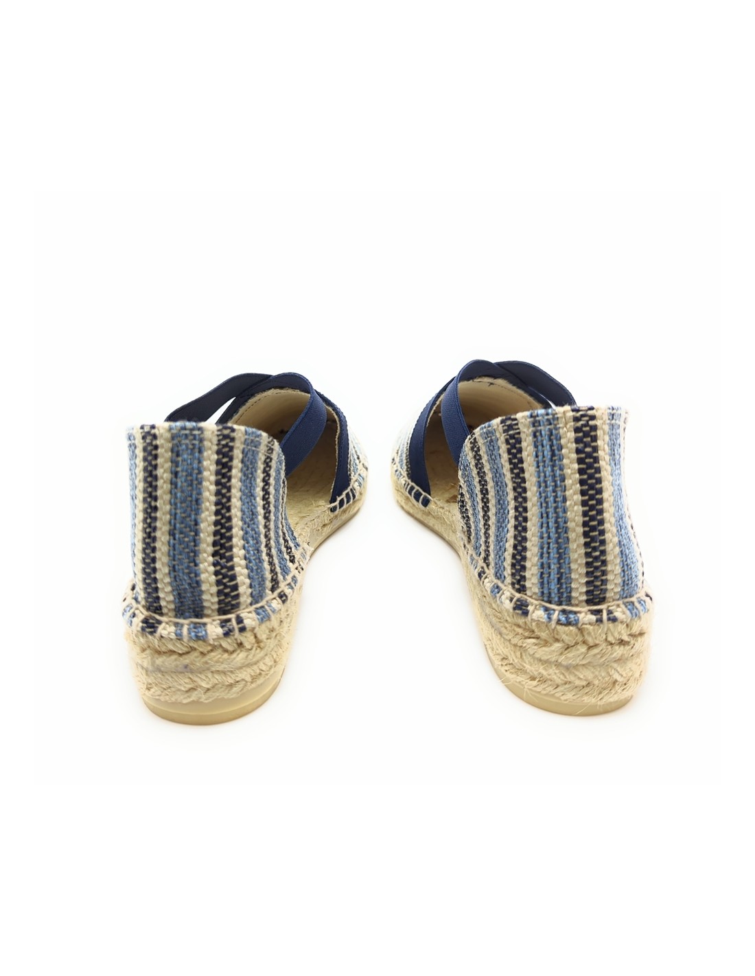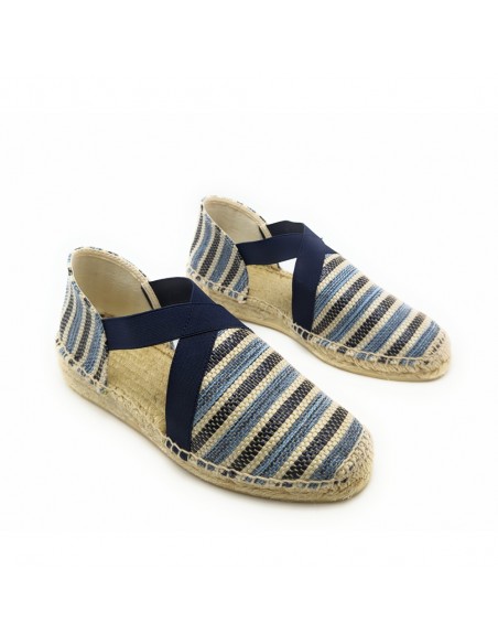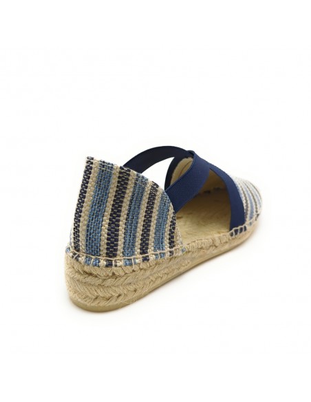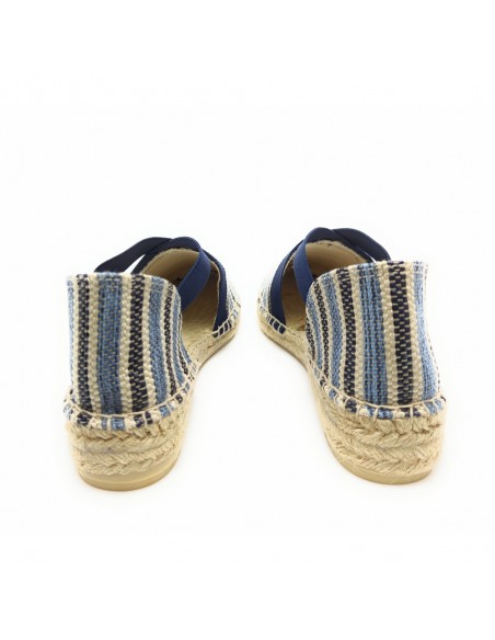 Descripción: Sandalia mujer 300 de Anse Rioja, fabricación artesanal de la Rioja. En suave rafia tonos azules. Tiras elásticas ajustables. Cuña de 2 cuerdas de yute natural con piso de goma antideslizante.