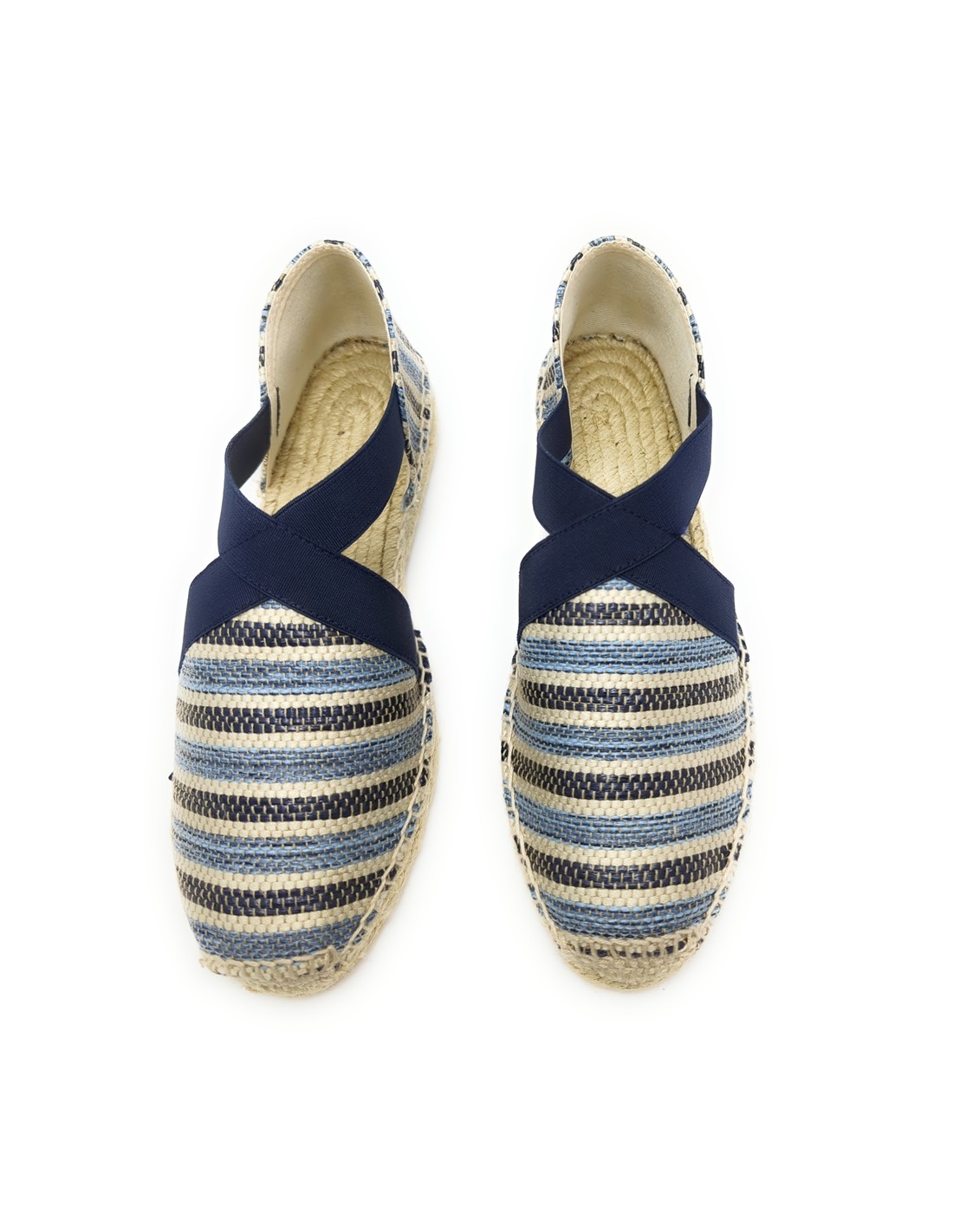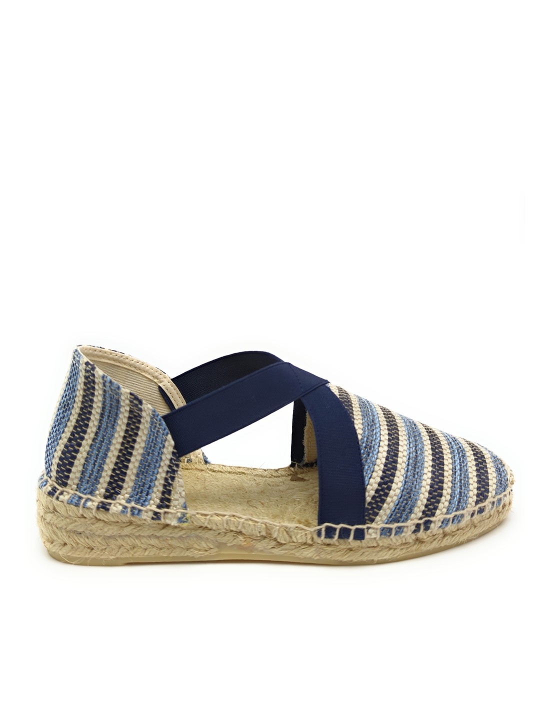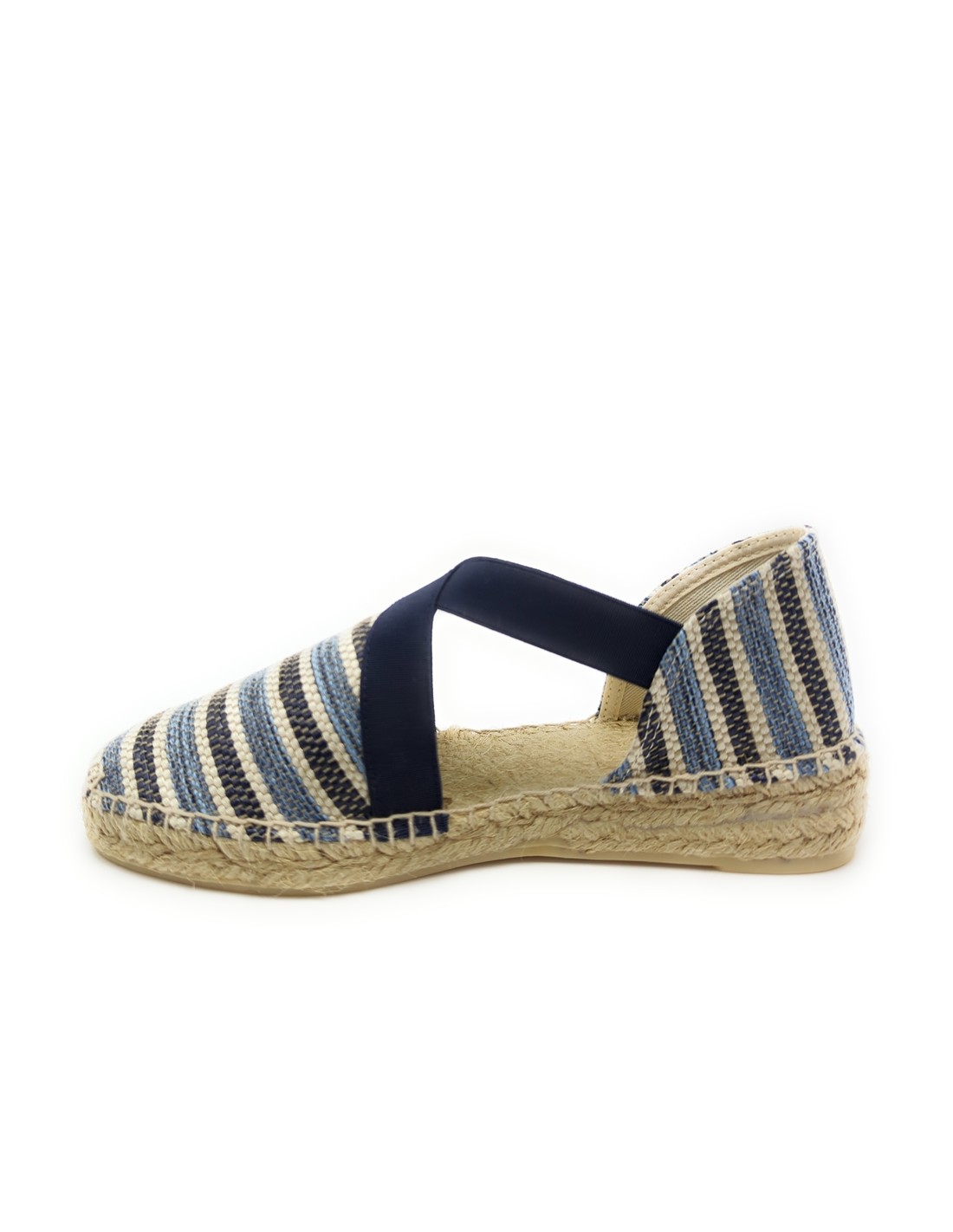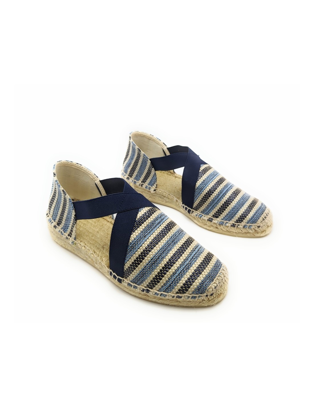 Descripción: Sandalia mujer 300 de Anse Rioja, fabricación artesanal de la Rioja. En suave rafia tonos azules. Tiras elásticas ajustables. Cuña de 2 cuerdas de yute natural con piso de goma antideslizante.