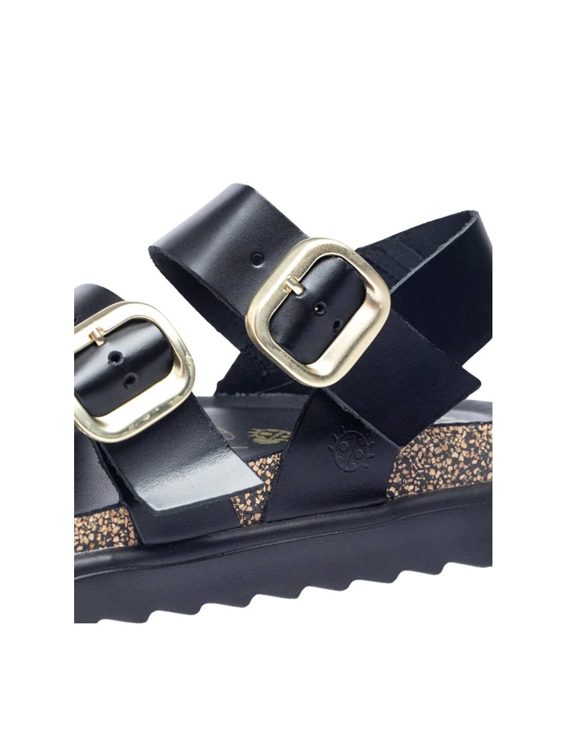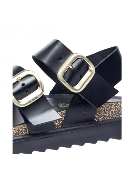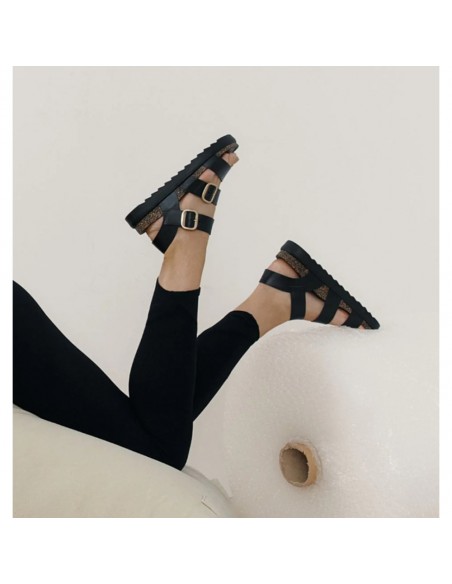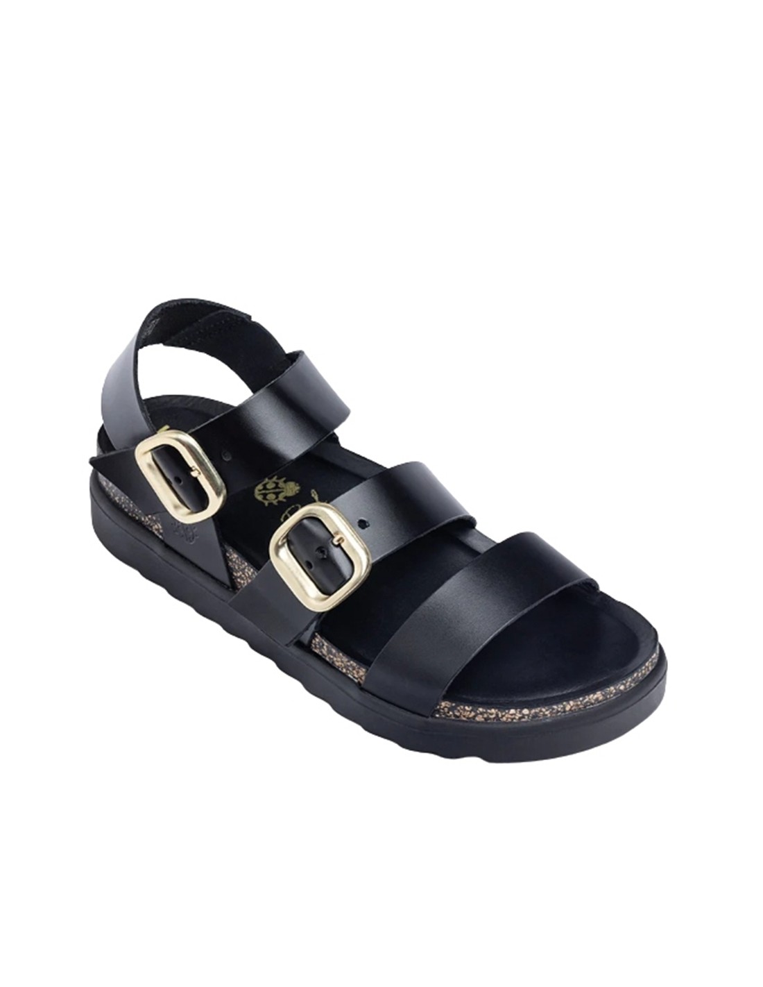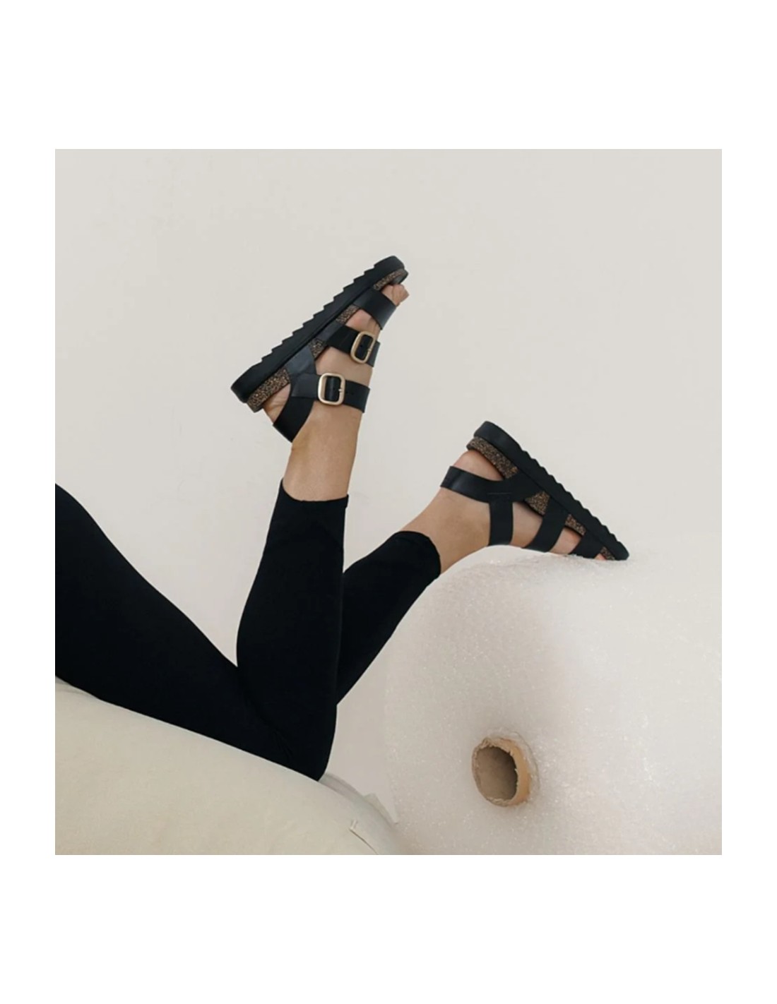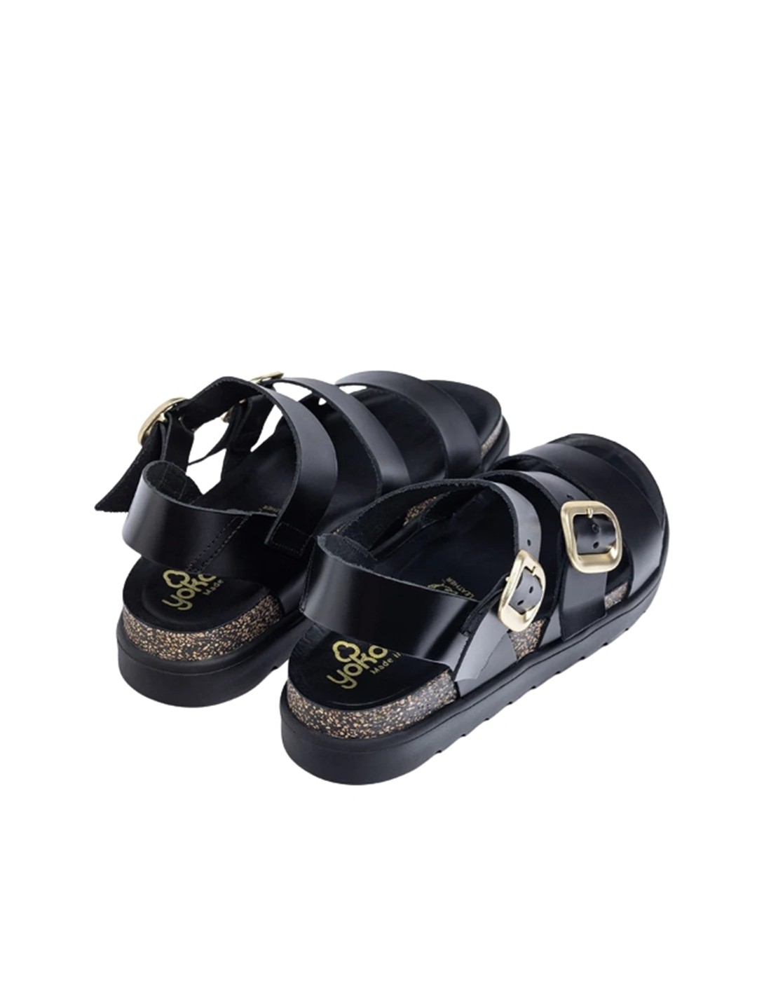 Descripción: Sandalia mujer estilo BIO TUNEZ-127 de YOKONO. Fabricación artesana en piel negra con tintes vegetales. Tiras con hebillas dorada ajustables. Plantilla en piel negra acolchada. Cuña ligera de plataforma con piso antideslizante.