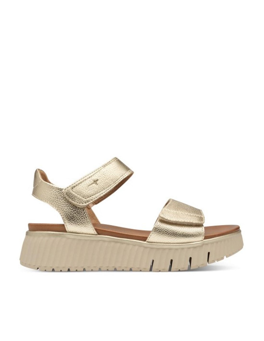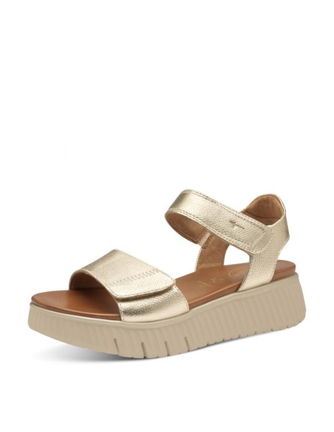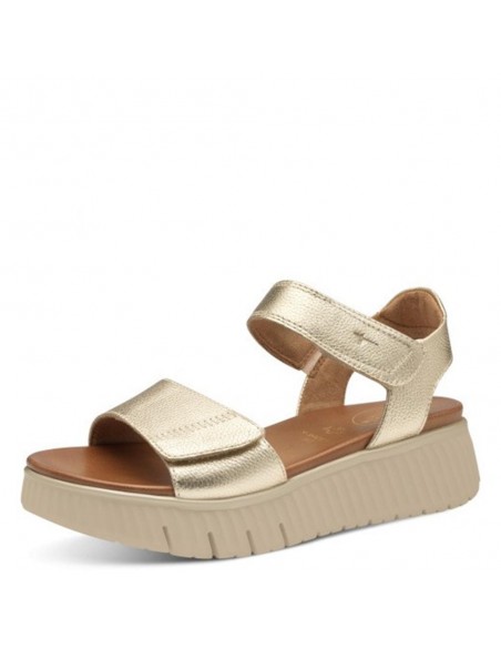 Descripción: Sandalia mujer 88720 de TAMARIS CONFORT en suave piel oro grabada. Plantilla anatómica acolchada. Ajuste con tiras de velcro. Ligera y cómoda cuña flexible y antideslizante.