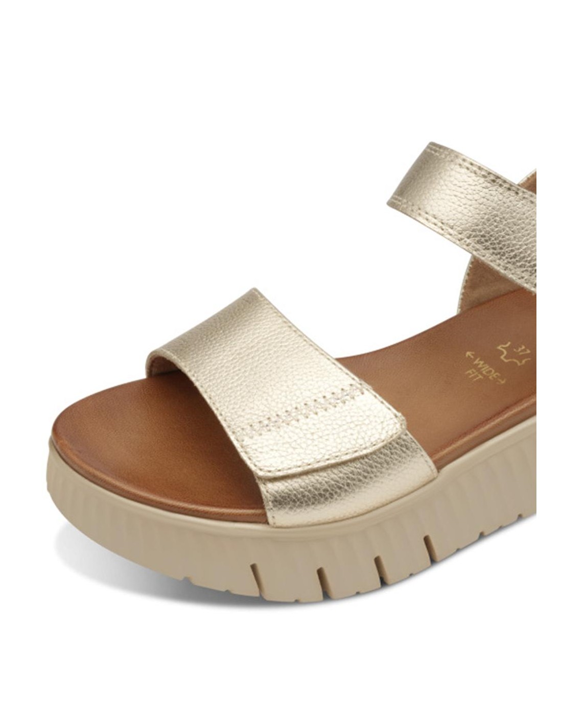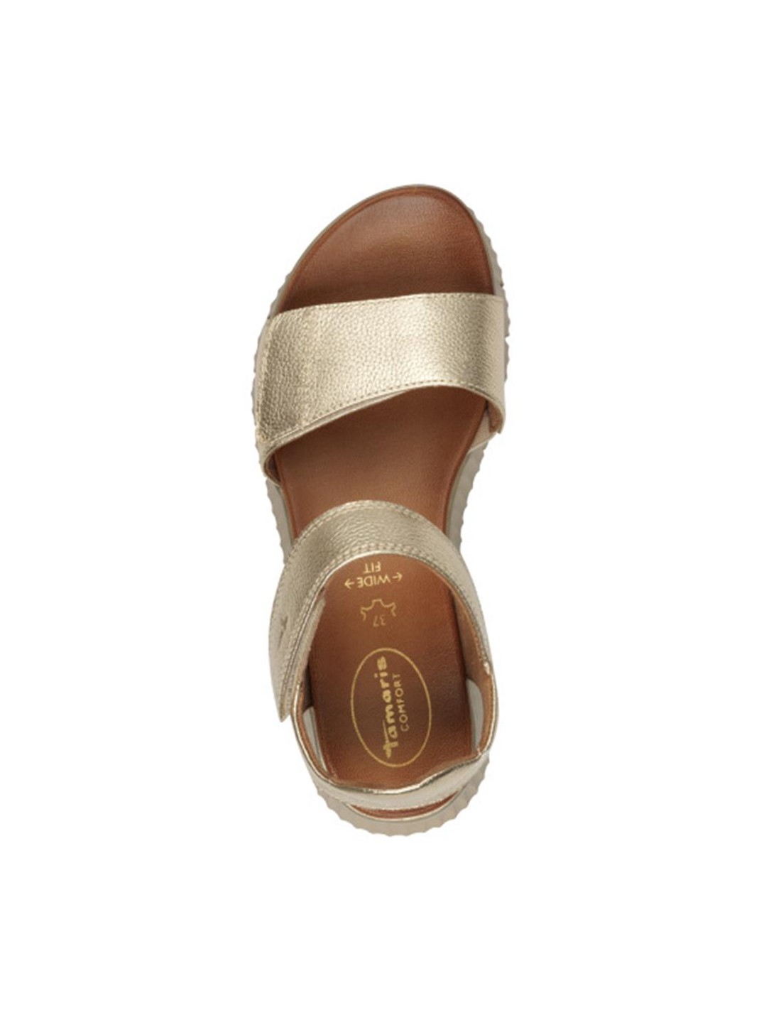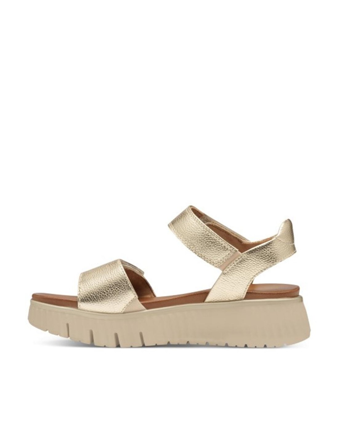 Descripción: Sandalia mujer 88720 de TAMARIS CONFORT en suave piel oro grabada. Plantilla anatómica acolchada. Ajuste con tiras de velcro. Ligera y cómoda cuña flexible y antideslizante.