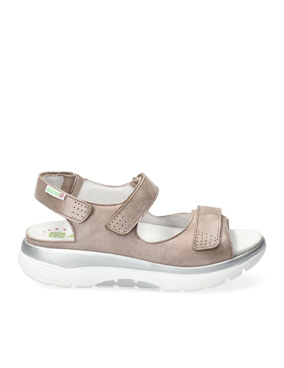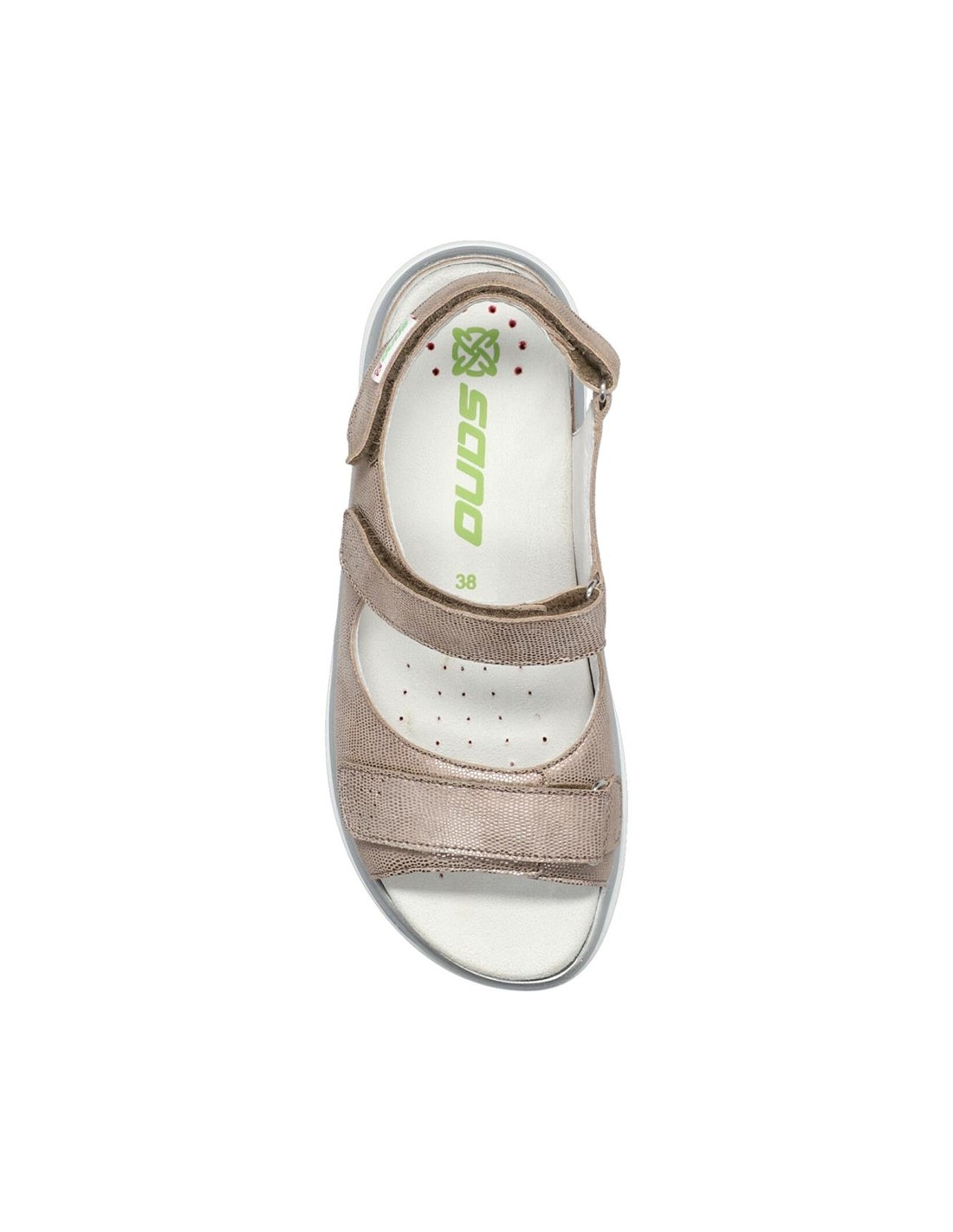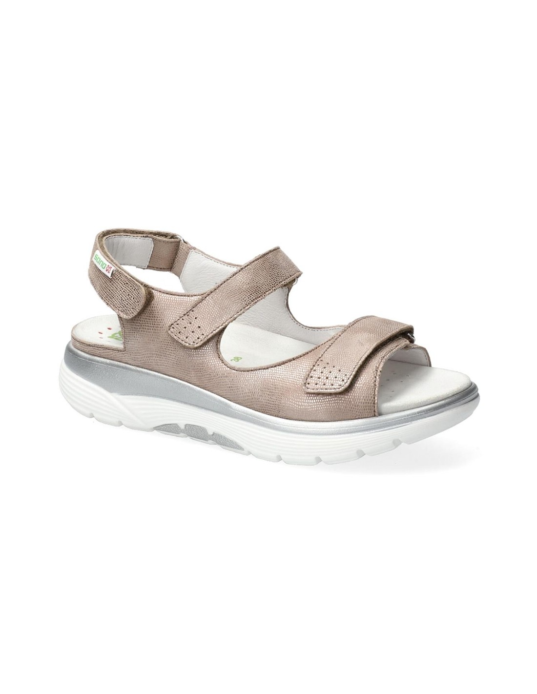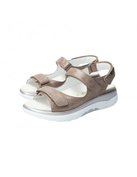 Descripción: Sandalia mujer NORINE de la línea ergonómica de Mephisto SANO. Nuevo piso que equilibra mejor el cuerpo y el pie con menos curvatura de la planta. En en piel laminada light taupe y ajuste de velcros.