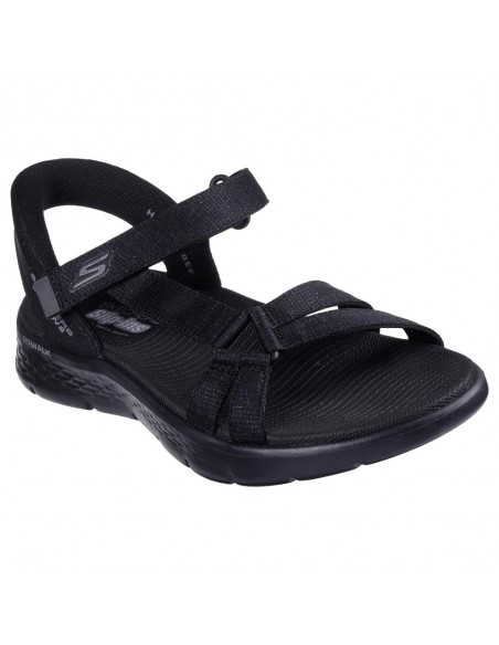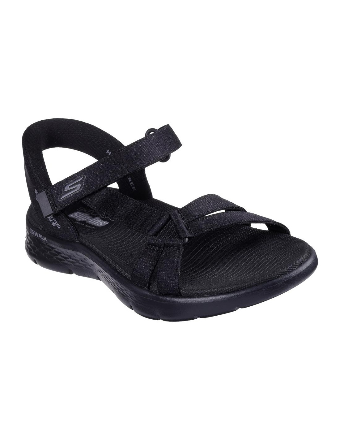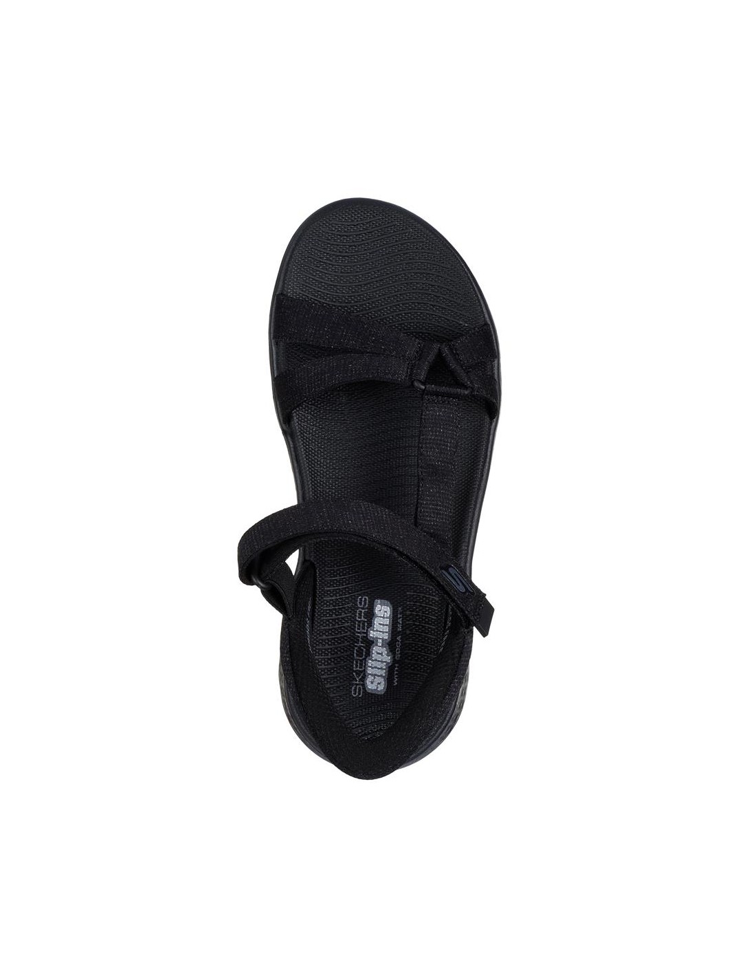 Descripción: Sandalia de mujer Skechers SLIP-INS GO WALK FLEX SANDAL - ILLUMIN en suave tejido negro y ajustes con velcro. Skechers Hands Free Slip-ins® Sistema Heel Pillow para calzar sin manos. Planilla Ultra Go® amortiguadora.