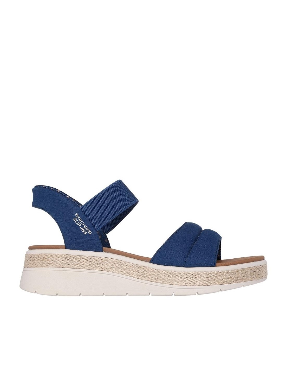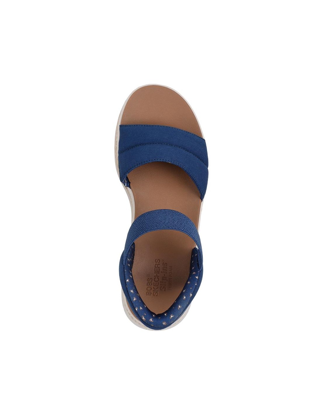 Descripción: Sandalia de mujer Skechers SLIP-INS BOBS SUN RAY en suave tejido azul con ajuste elástico. Skechers Hands Free Slip-ins® Sistema Heel Pillow para calzar sin manos. Planilla Plush Foam® amortiguadora.