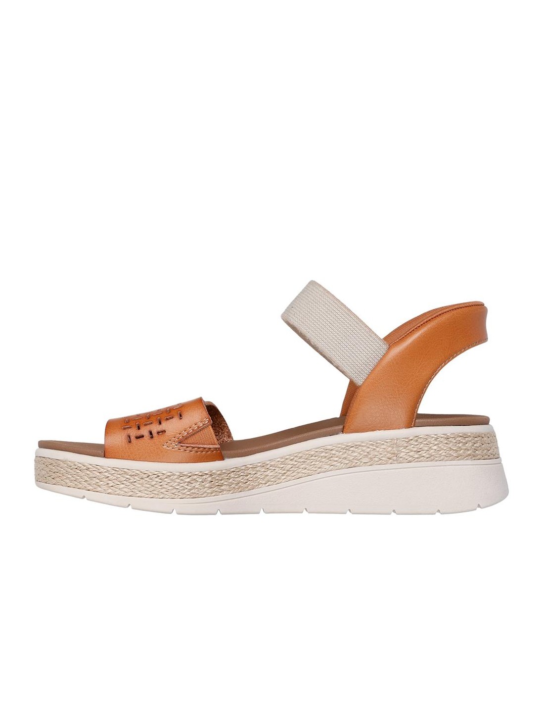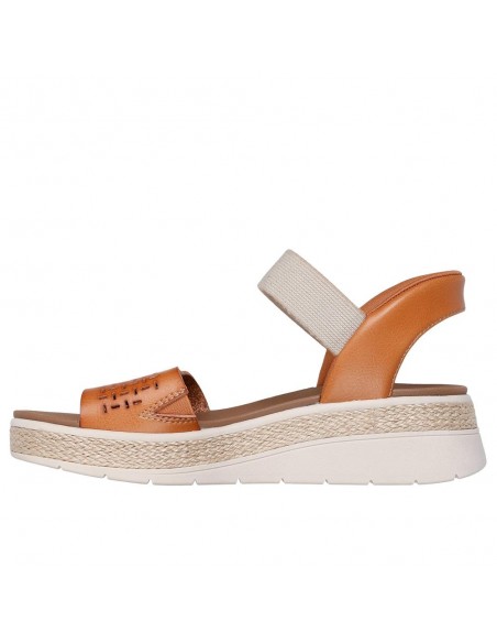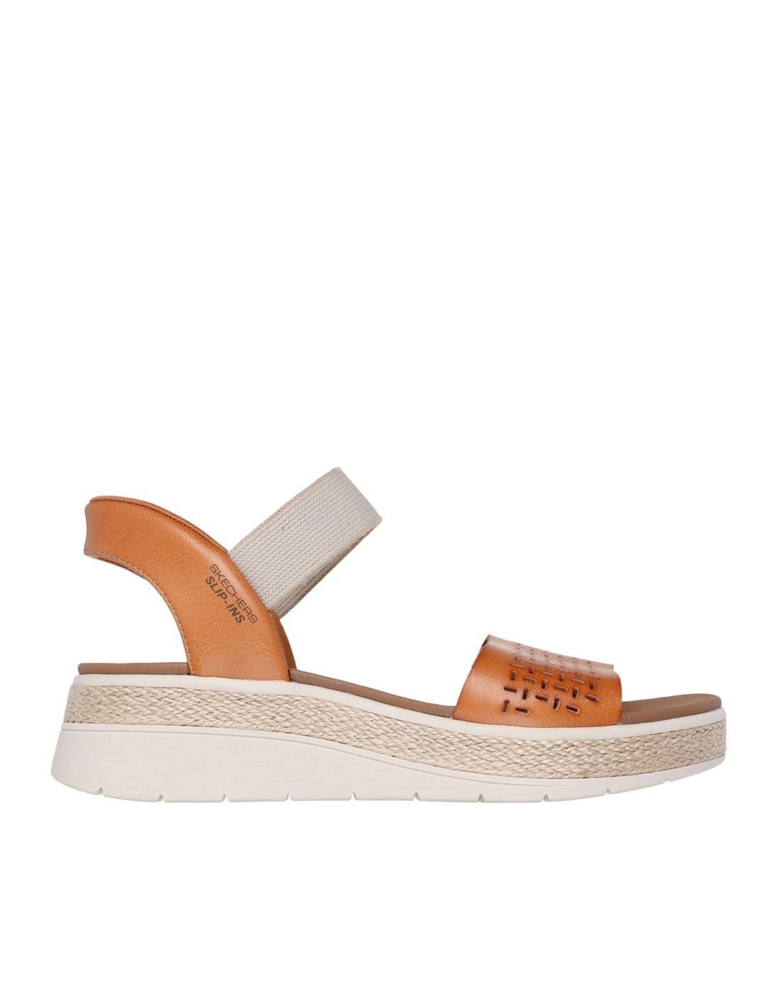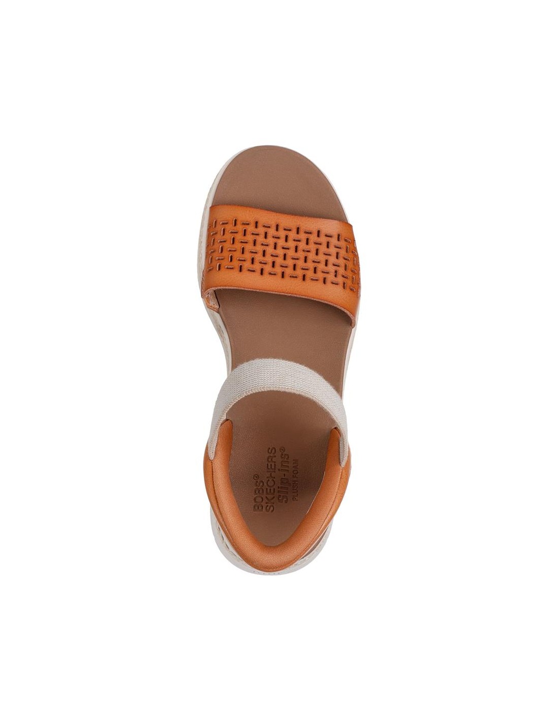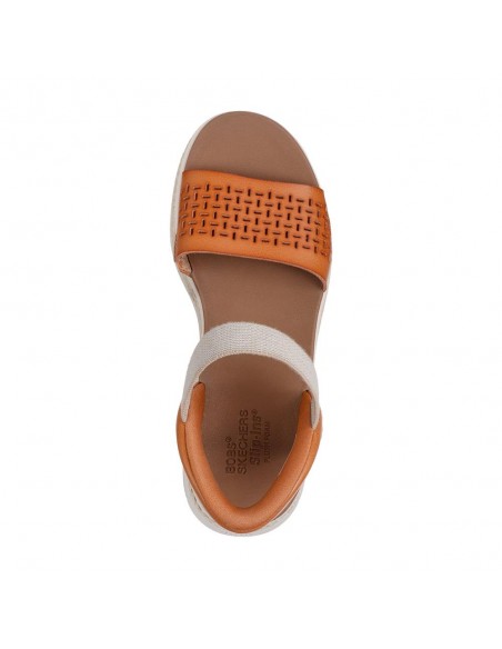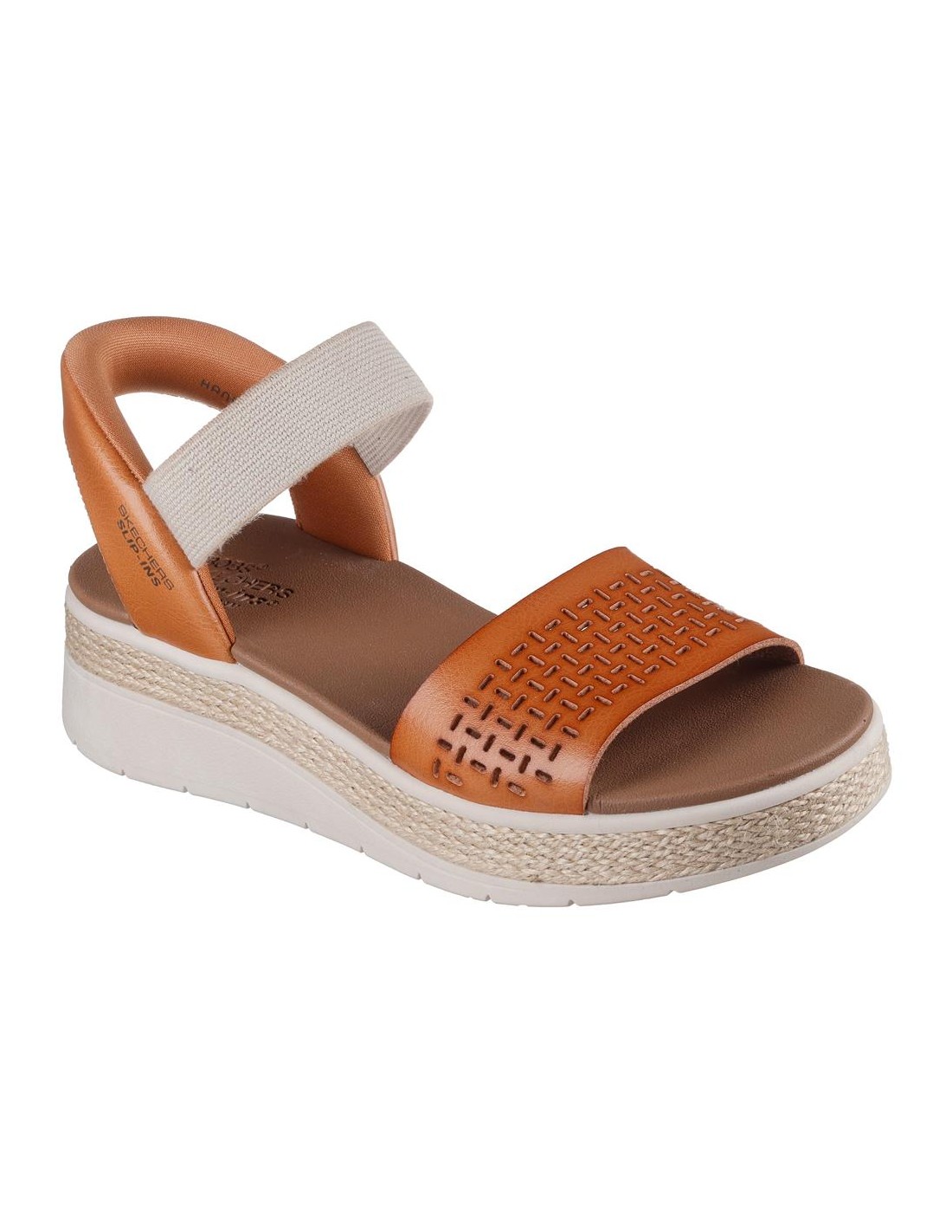 Descripción: Sandalia de mujer Skechers SLIP-INS BOBS SUN RAY en suave banda perforada camel con ajuste elástico. Skechers Hands Free Slip-ins® Sistema Heel Pillow para calzar sin manos. Planilla Plush Foam® amortiguadora.