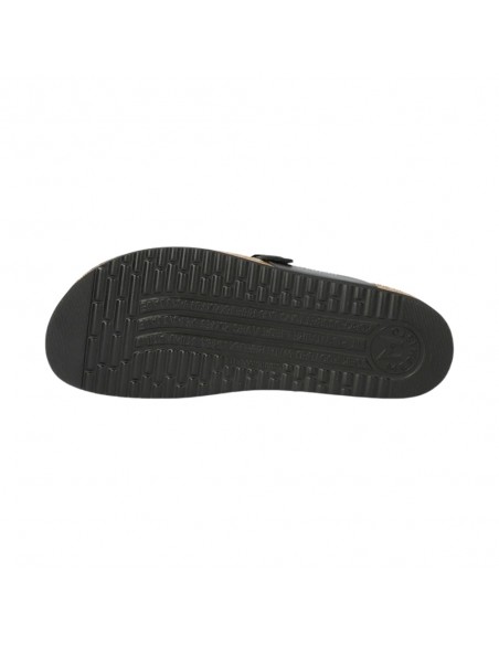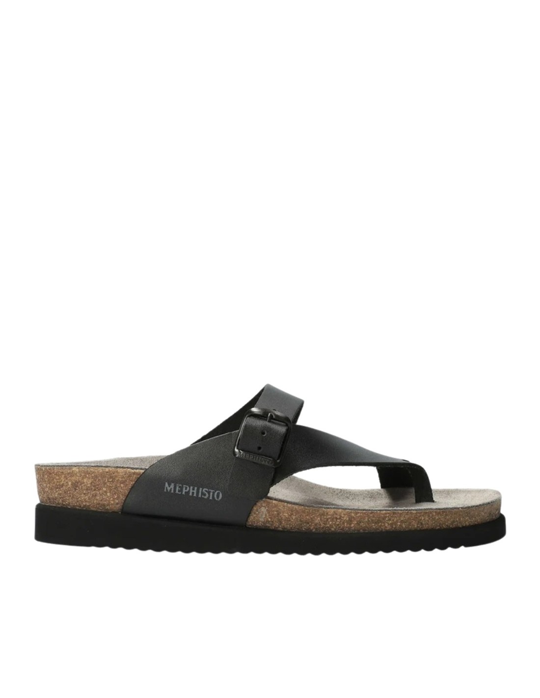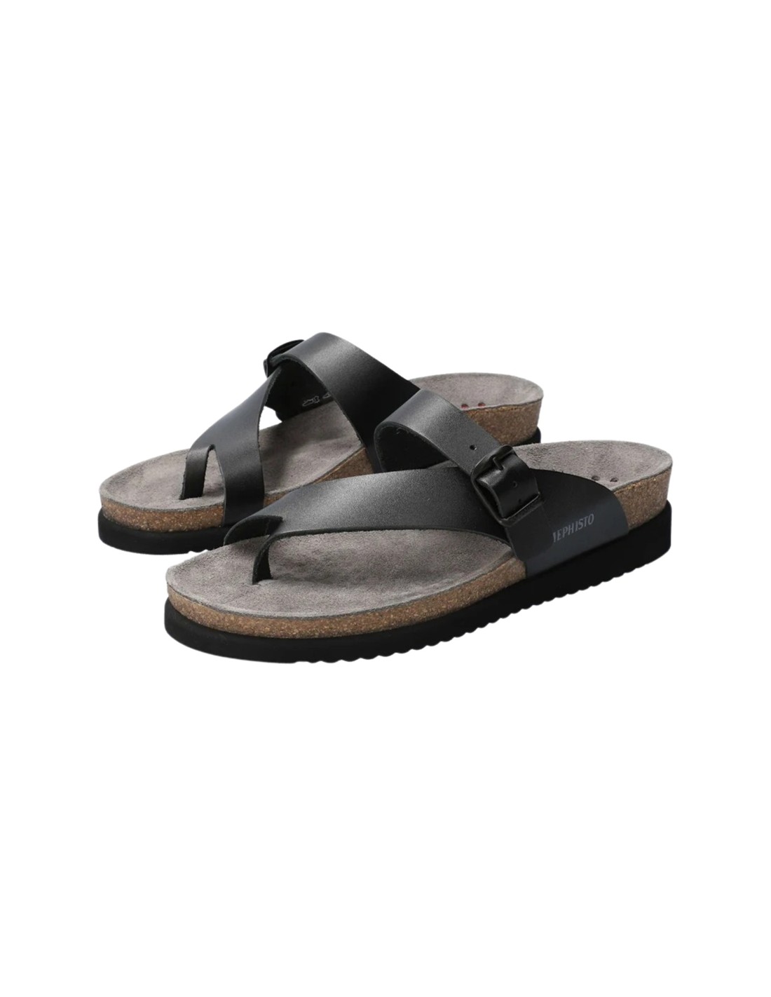 Descripción: Chancla entre dedos HELEN de MEPHISTO en piel negra con hebilla ajustable. Cuña Air-Relax de corcho y latex 100% natural. Plantilla anatómicamente diseñada para proteger el pie y que se adapte de forma natural.