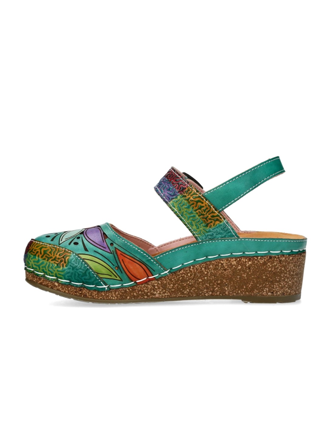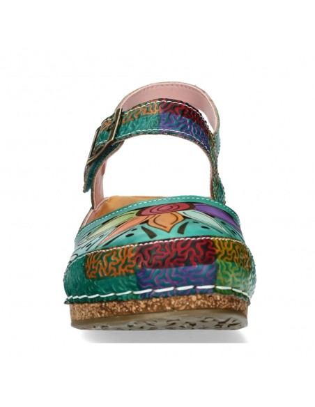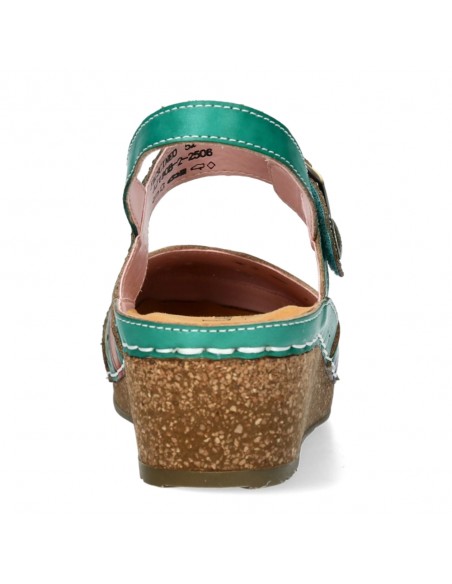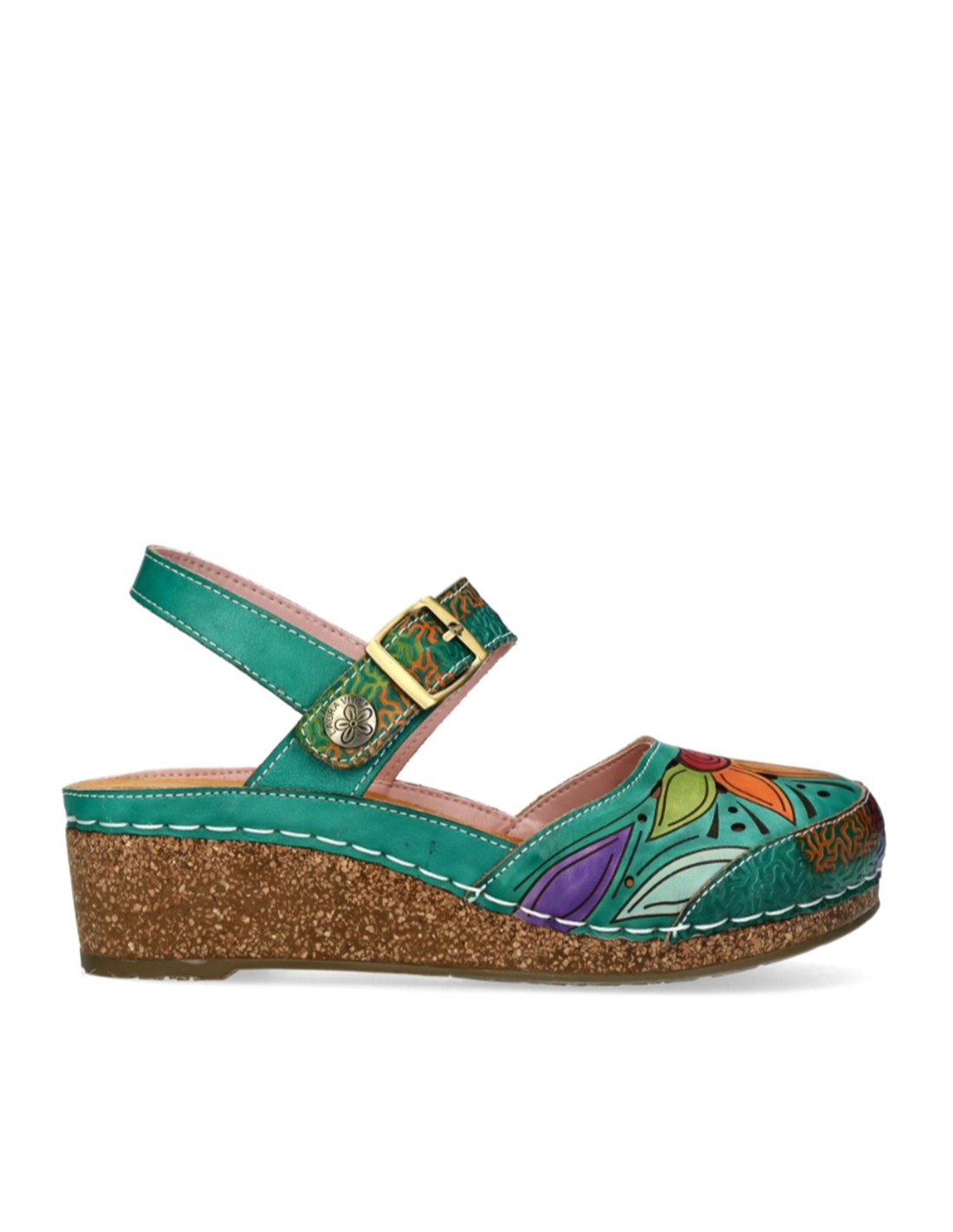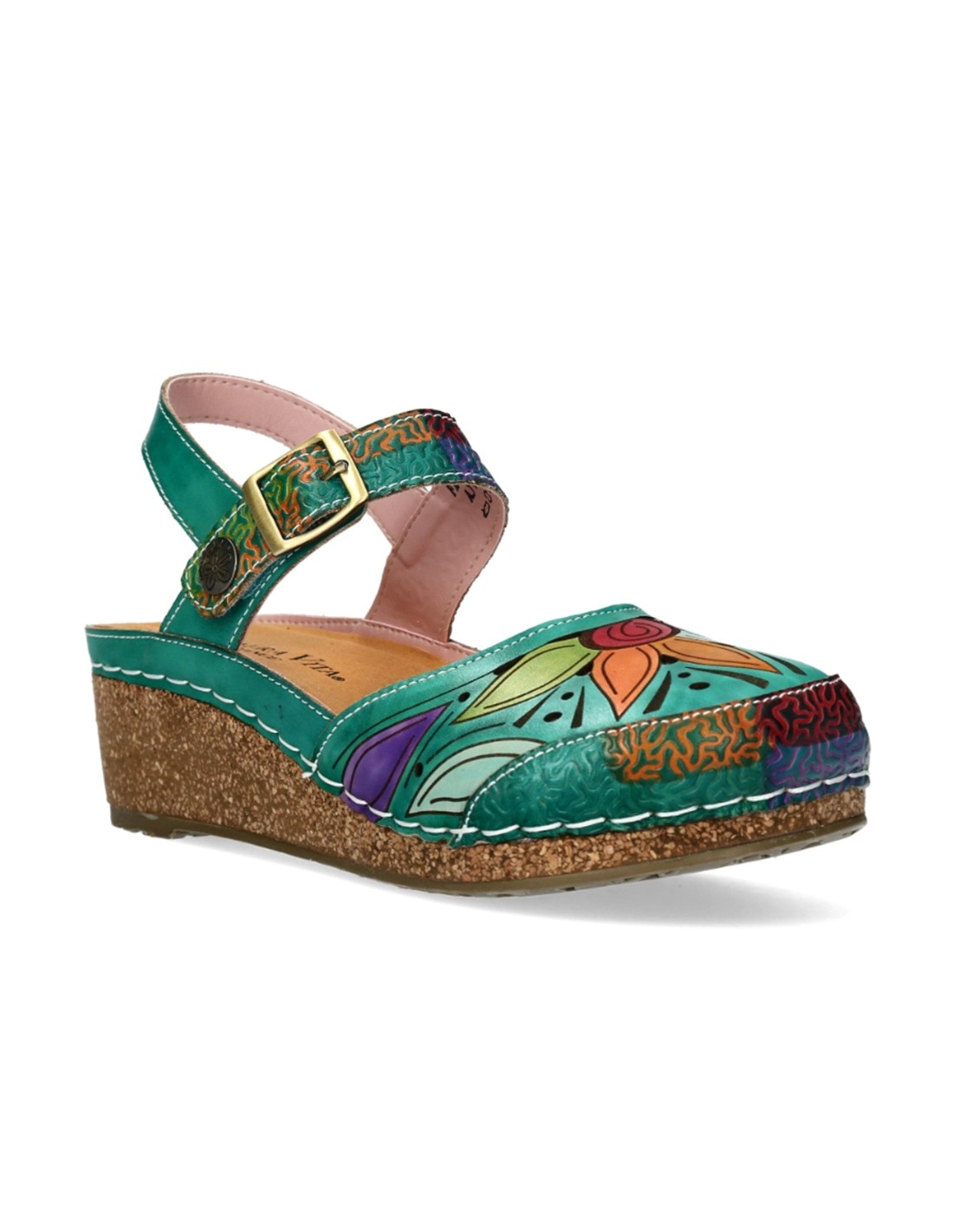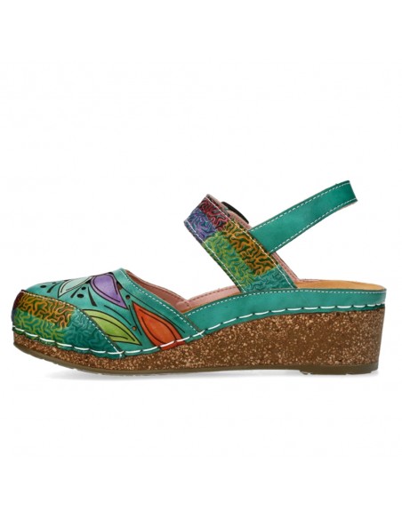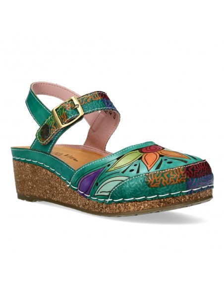 Descripción: Sandalia cerrada punta mujer Fascine-02 de Laura Vita piel verde con diseño floral único, piel suave y cierre cómodo. Cómoda cuña corcho. Perfecta para destacar con estilo y confort en cada paso.