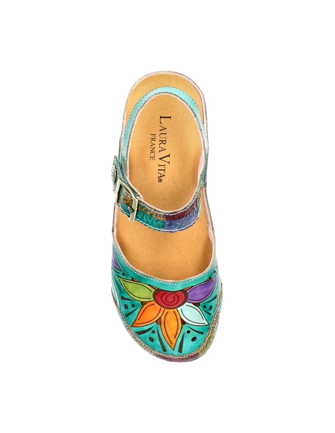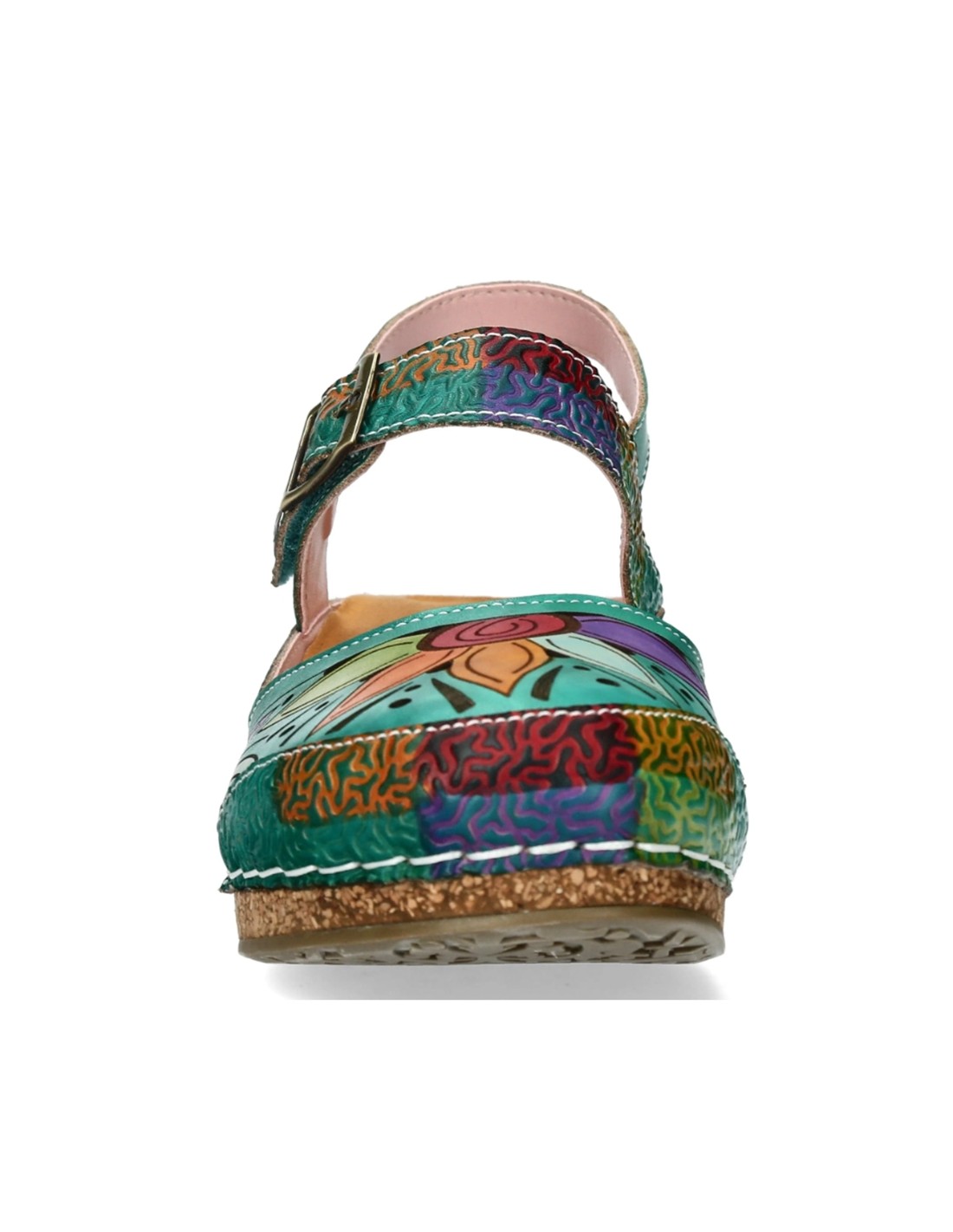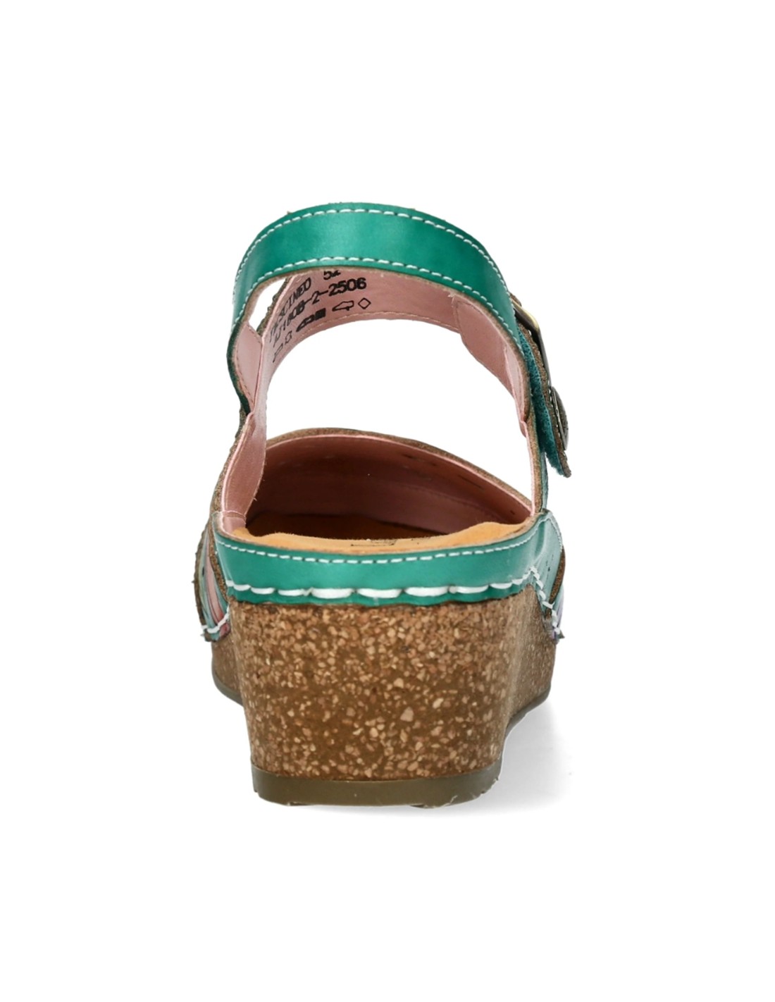 Descripción: Sandalia cerrada punta mujer Fascine-02 de Laura Vita piel verde con diseño floral único, piel suave y cierre cómodo. Cómoda cuña corcho. Perfecta para destacar con estilo y confort en cada paso.