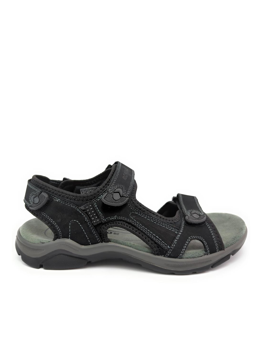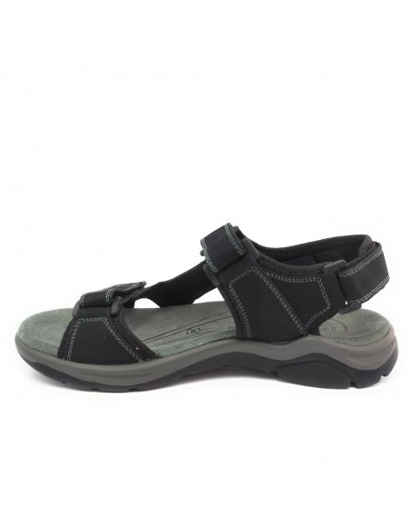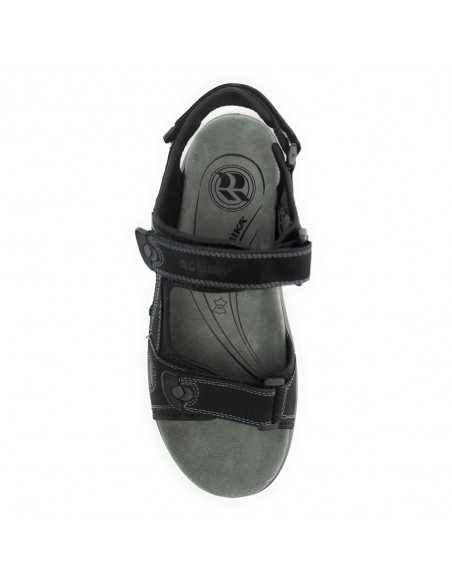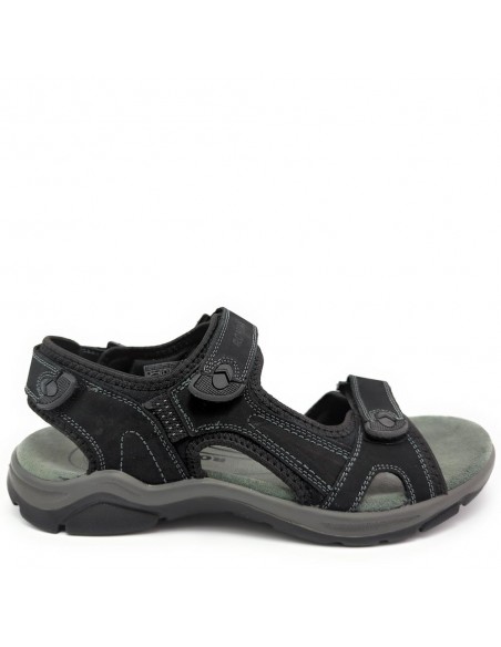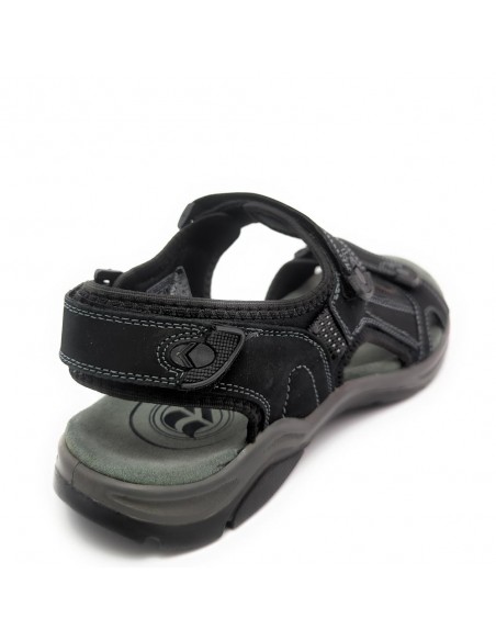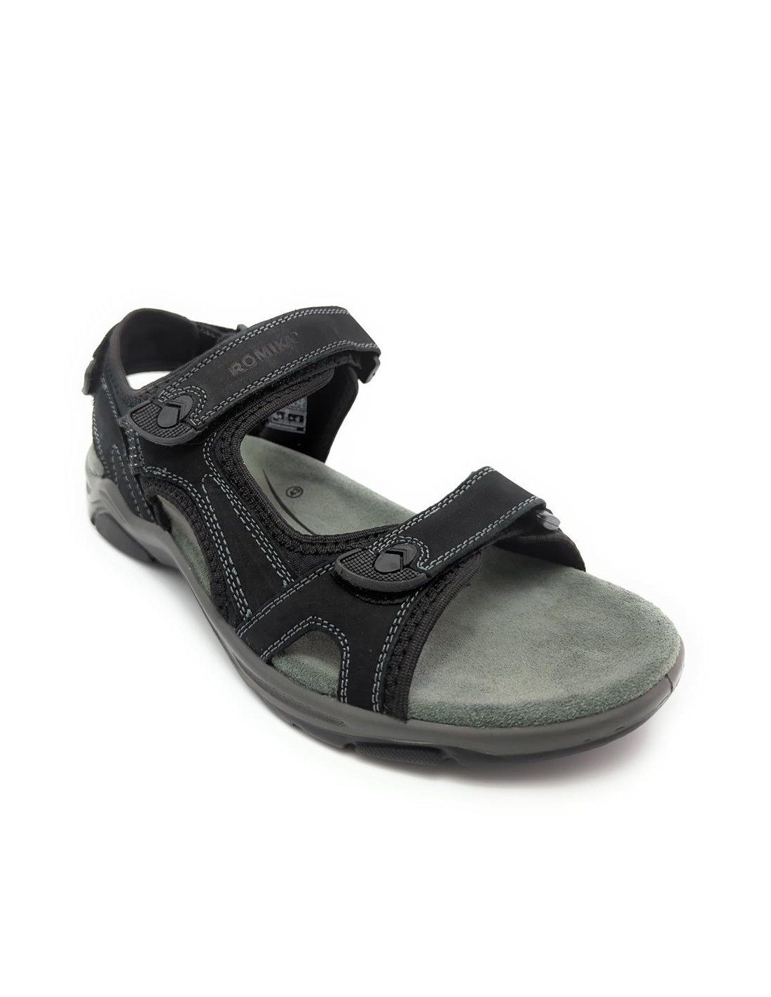 Descripción: Cómoda sandalia hombre 74R5041001 de ROMIKA, en suave nubuck negro con ajuste de velcro. Plantilla acolchada. Piso ligero antideslizante.