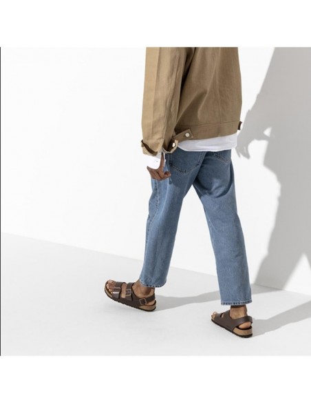 Descripción: Cómoda sandalia BIO para hombre de Birkenstock. Modelo MILANO en marrón con tres tiras que se ajunstan con hebillas. Planta anatómica de cuero que recoge cómodamente el pie. Piso EVA antideslizante.