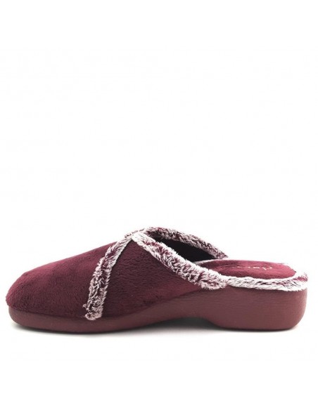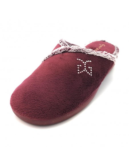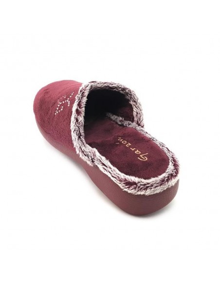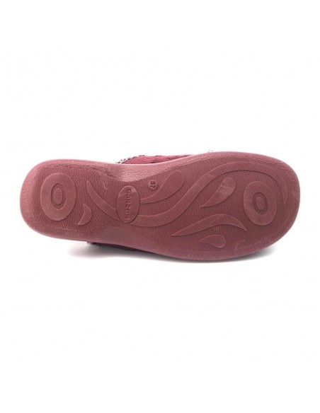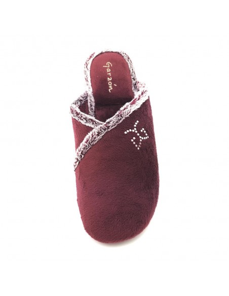 Descripción: Zapatilla mujer 3305 de Garzon caliente y suave para casa en terciopelo burdeos con detalle de pedrería. Suela de goma con mucha base para una gran estabilidad.