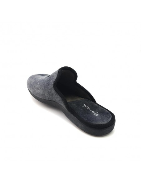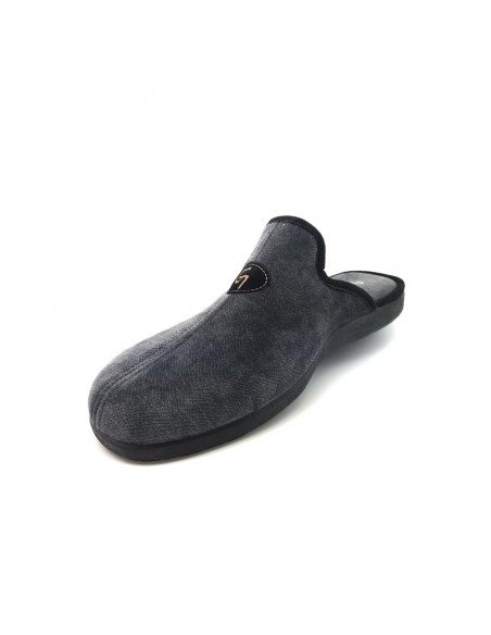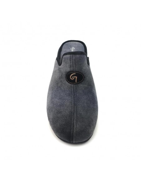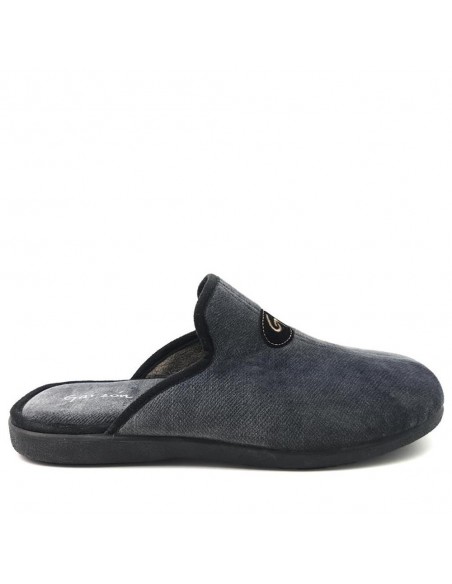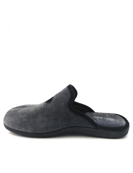 Descripción: Zapatilla de casa para hombre 6101 GARZON con el logotipo de la marca en el empeine, aterciopelado texturizado en color antracita con el talón descubierto. Suela ancha de goma flexible y antideslizanta