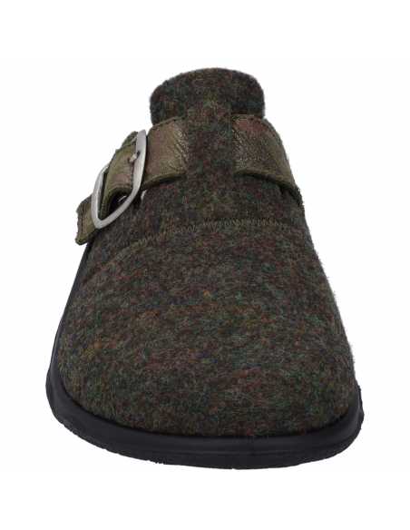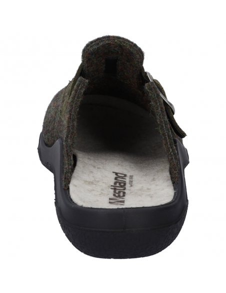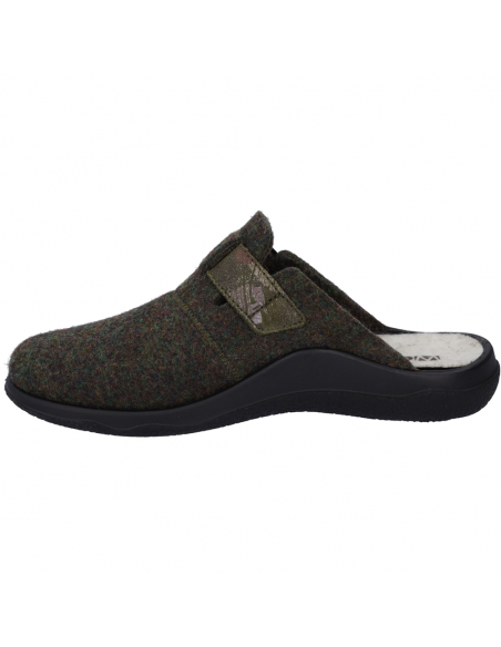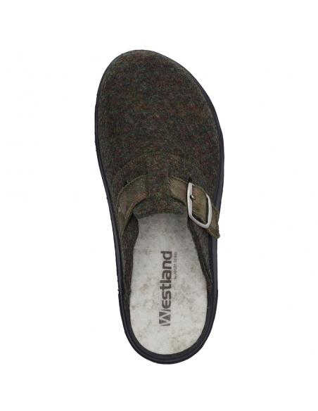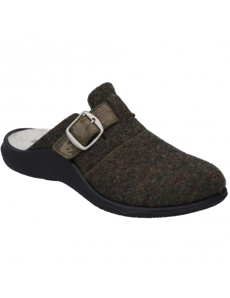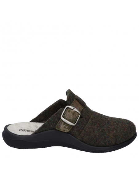 Descripción: Zapatilla de casa para mujer ROUBAIX-04 de Westland en lana natural kaki con ajuste de hebilla. Piso de poliuretano inyecyado flexible y antideslizante. Plantilla ananatómica móvil.