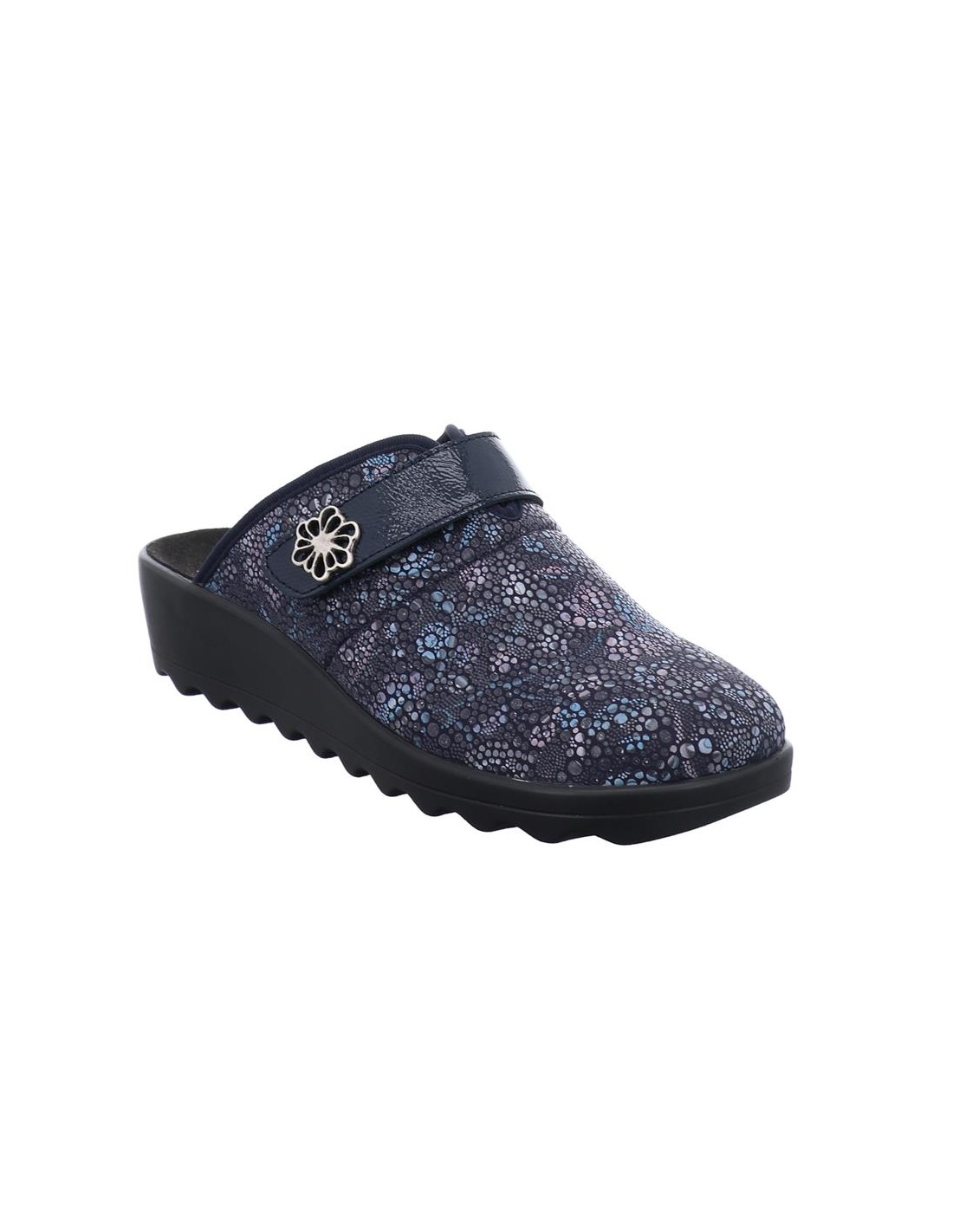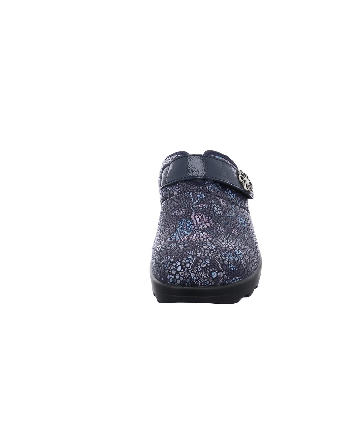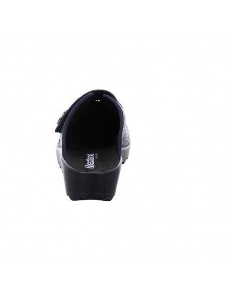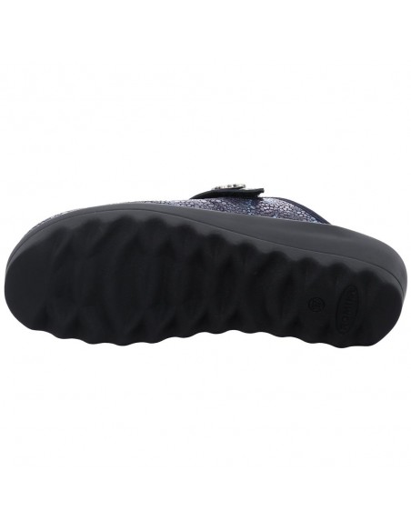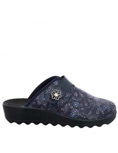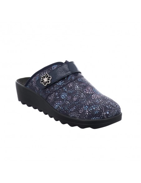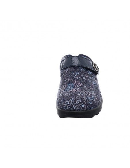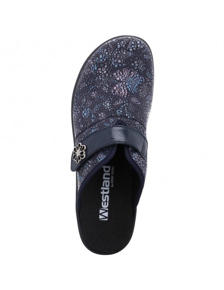 Descripción: Zapatilla de casa para mujer GINA-110 de Westland en licra estampada azul con detalle de velcro. Piso de poliuretano inyectado flexible y antideslizante. Plantilla anatómica móvil.