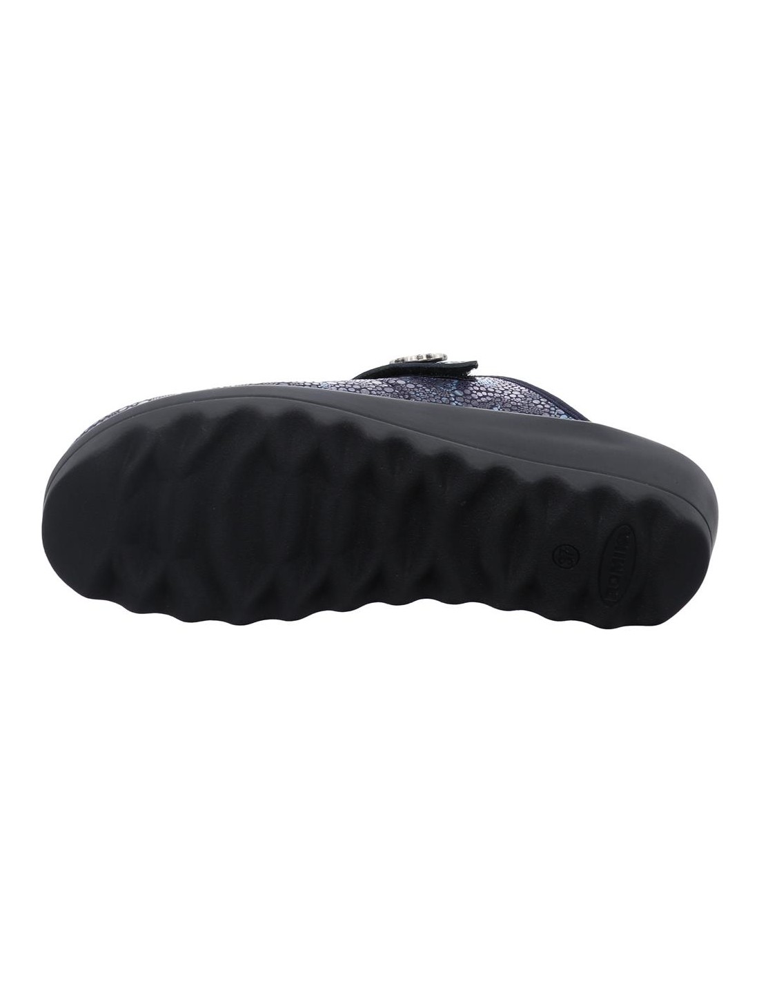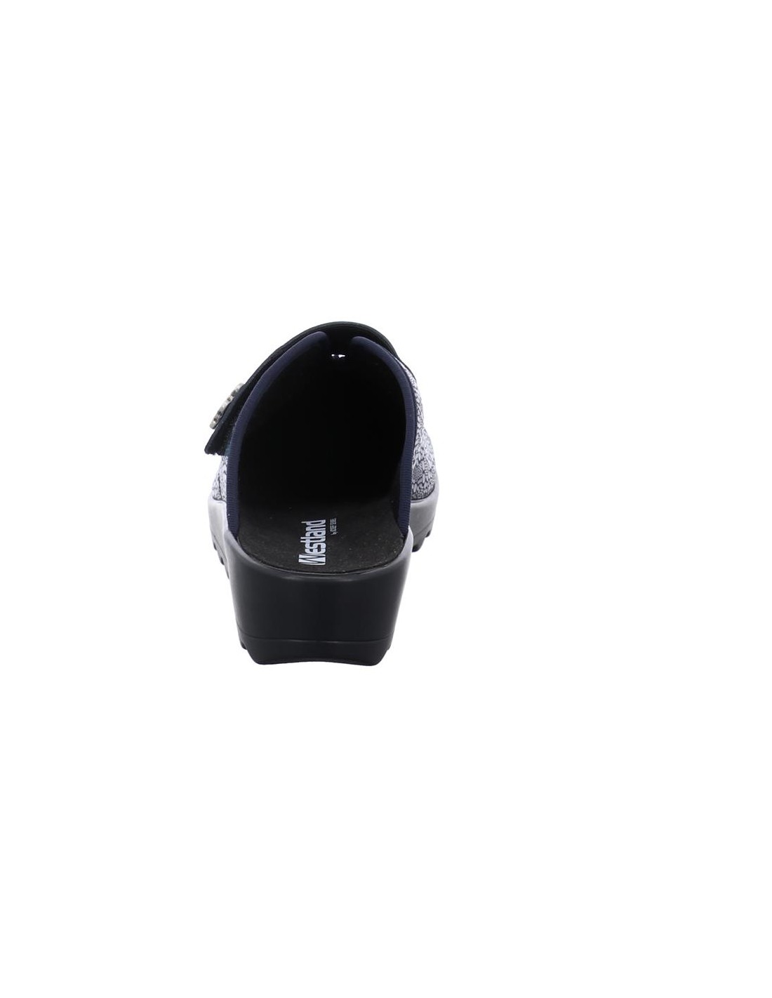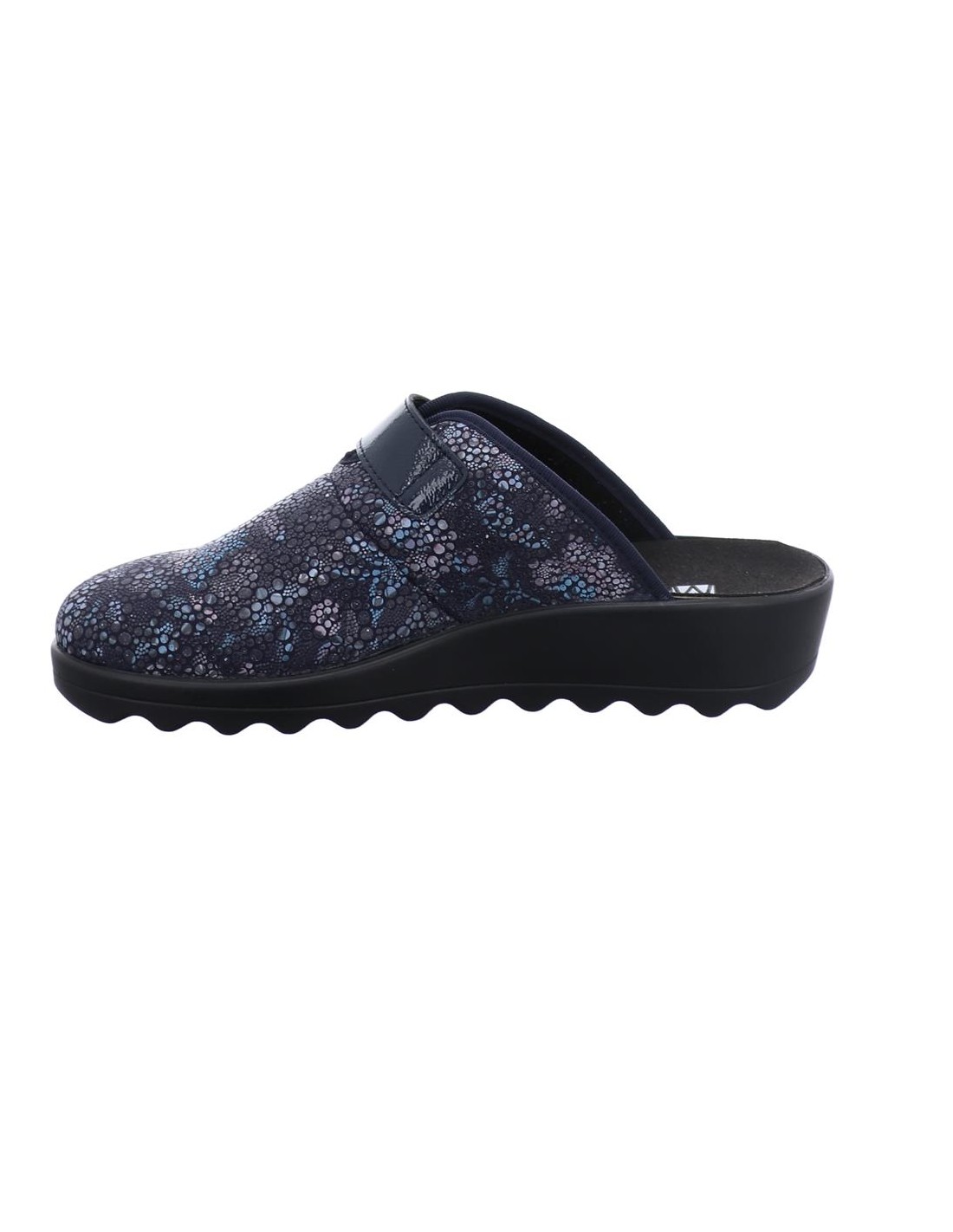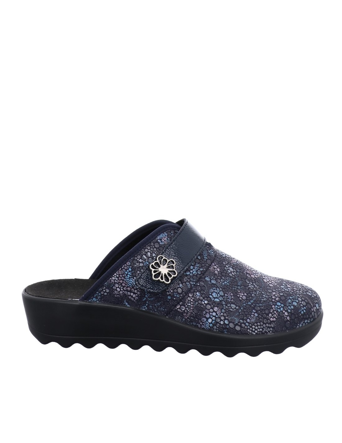 Descripción: Zapatilla de casa para mujer GINA-110 de Westland en licra estampada azul con detalle de velcro. Piso de poliuretano inyectado flexible y antideslizante. Plantilla anatómica móvil.
