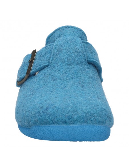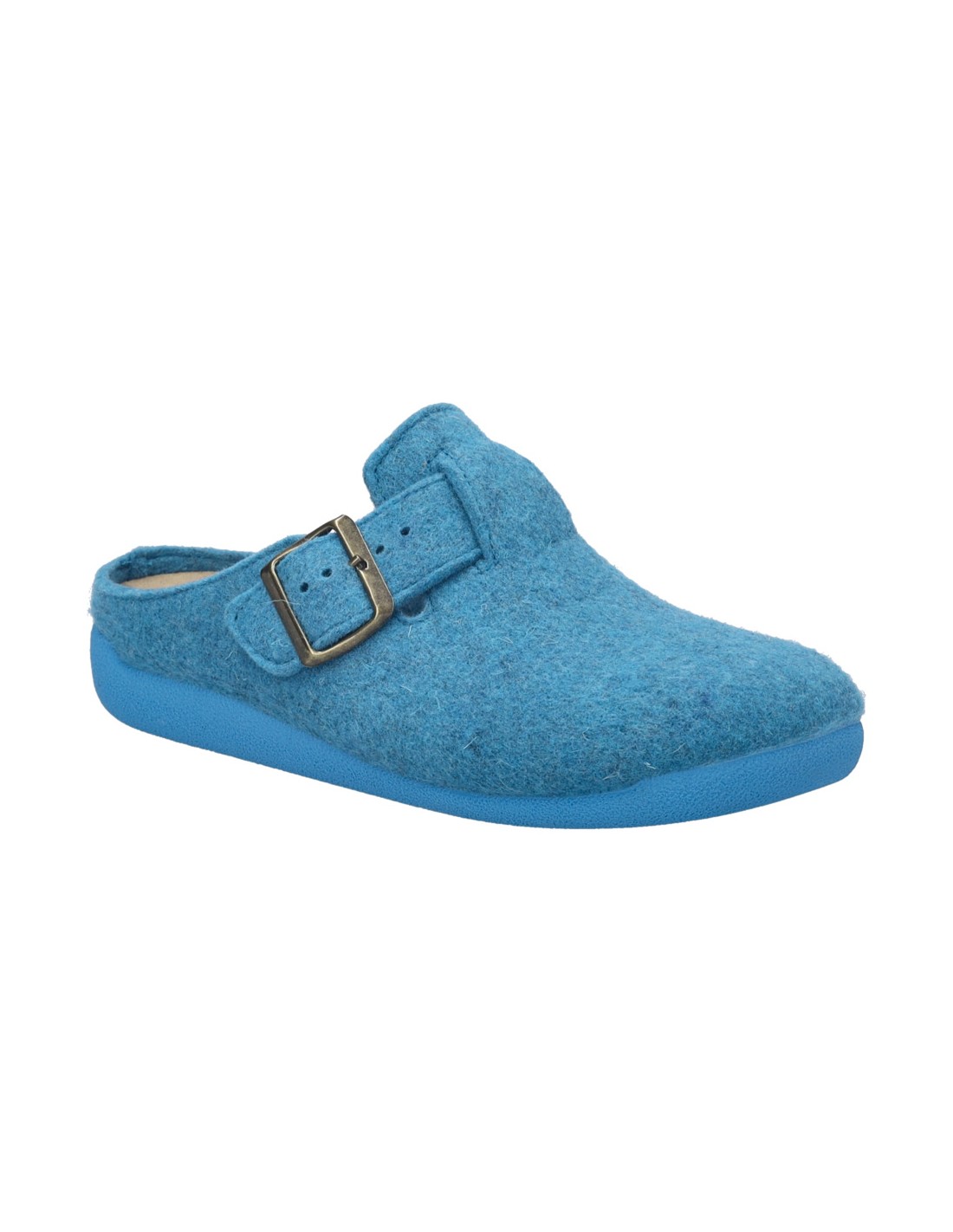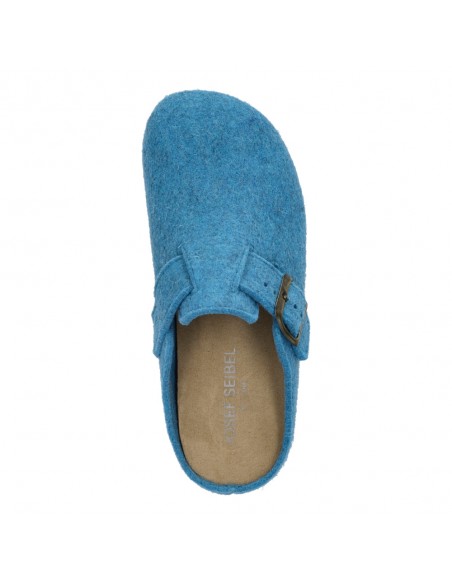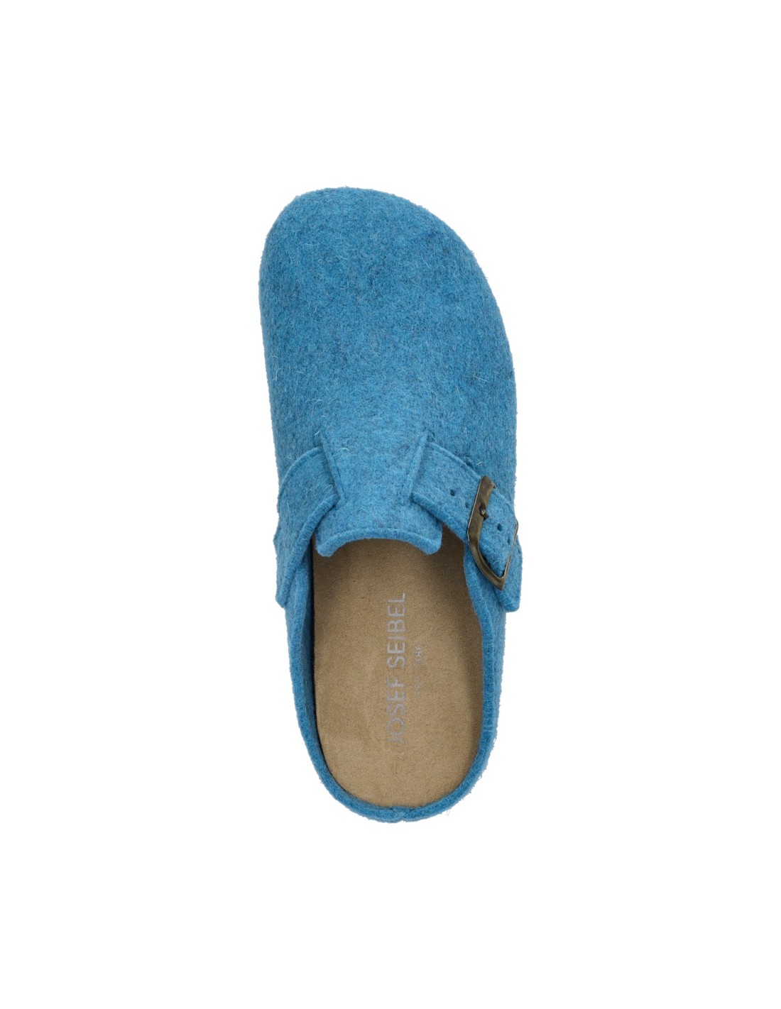 Descripción: Zapatilla de casa mujer JOSEF SEIBEL Cara-0a en suave y cálida lana azul con detalle hebilla. Plantilla extraible. Ligera cuña al tono antideslizante.