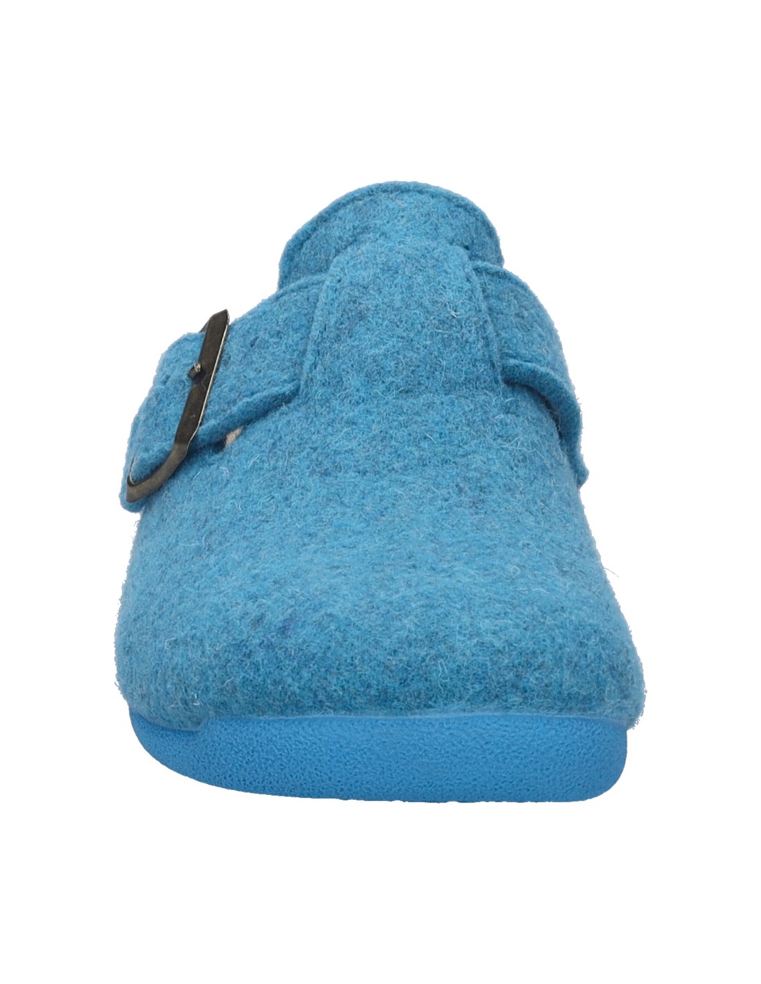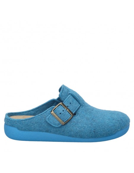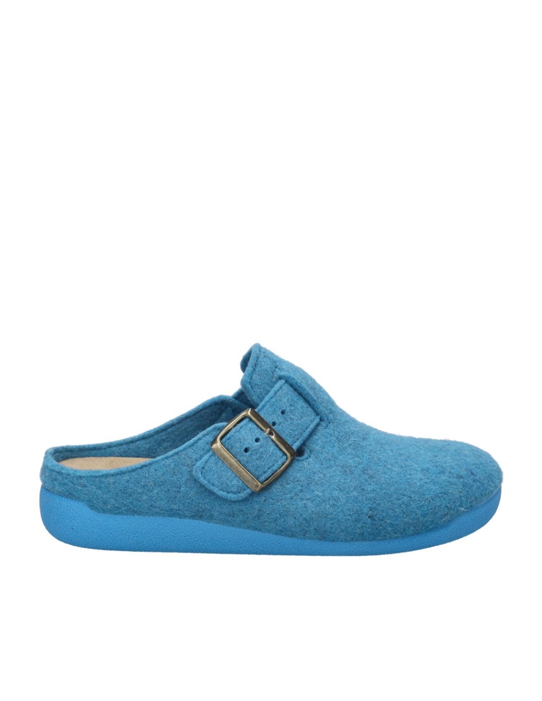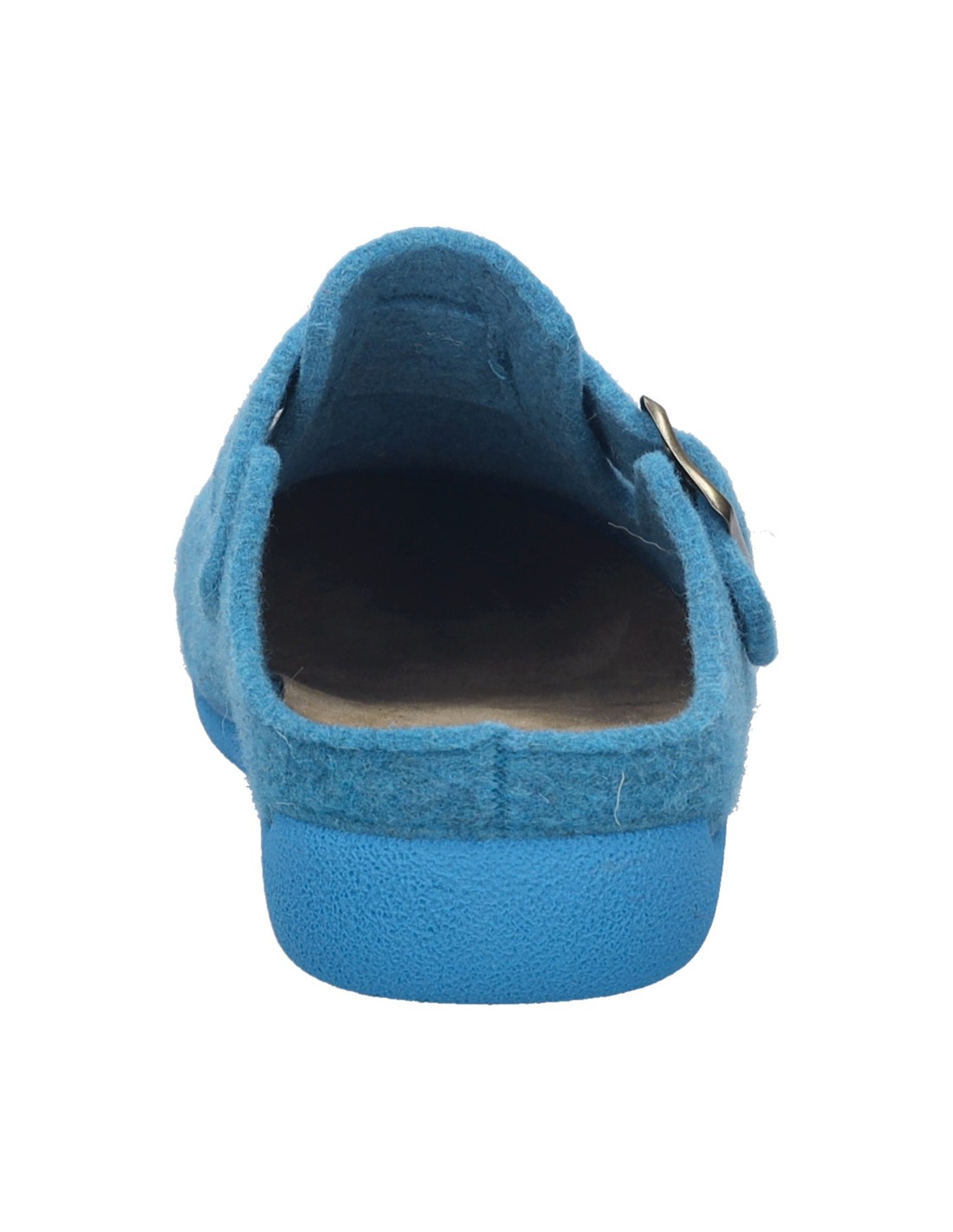Descripción: Zapatilla de casa mujer JOSEF SEIBEL Cara-0a en suave y cálida lana azul con detalle hebilla. Plantilla extraible. Ligera cuña al tono antideslizante.